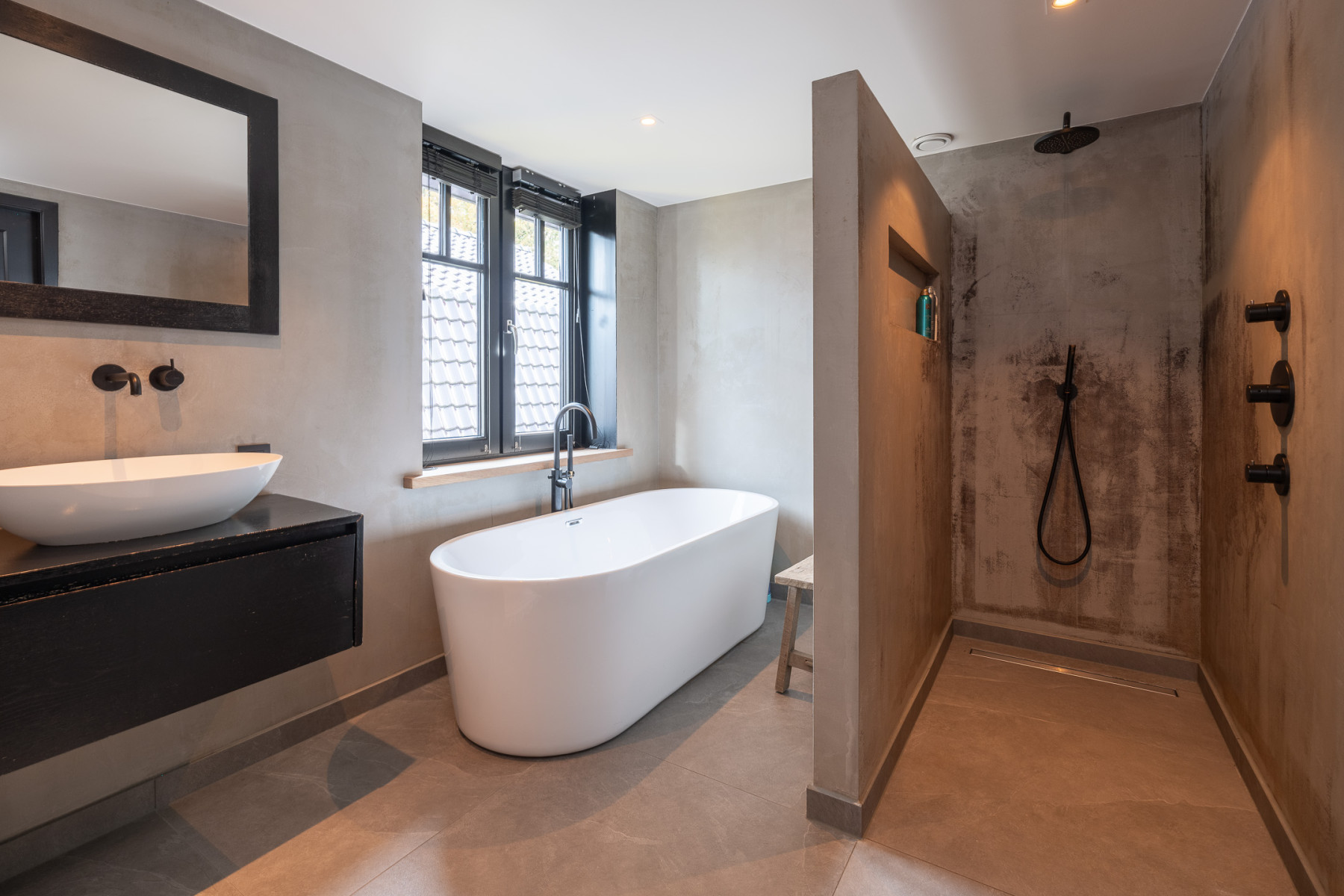 Ligbad, toilet, dubbele wastafel, wastafelmeubel, inloopdouche en vloerverwarming