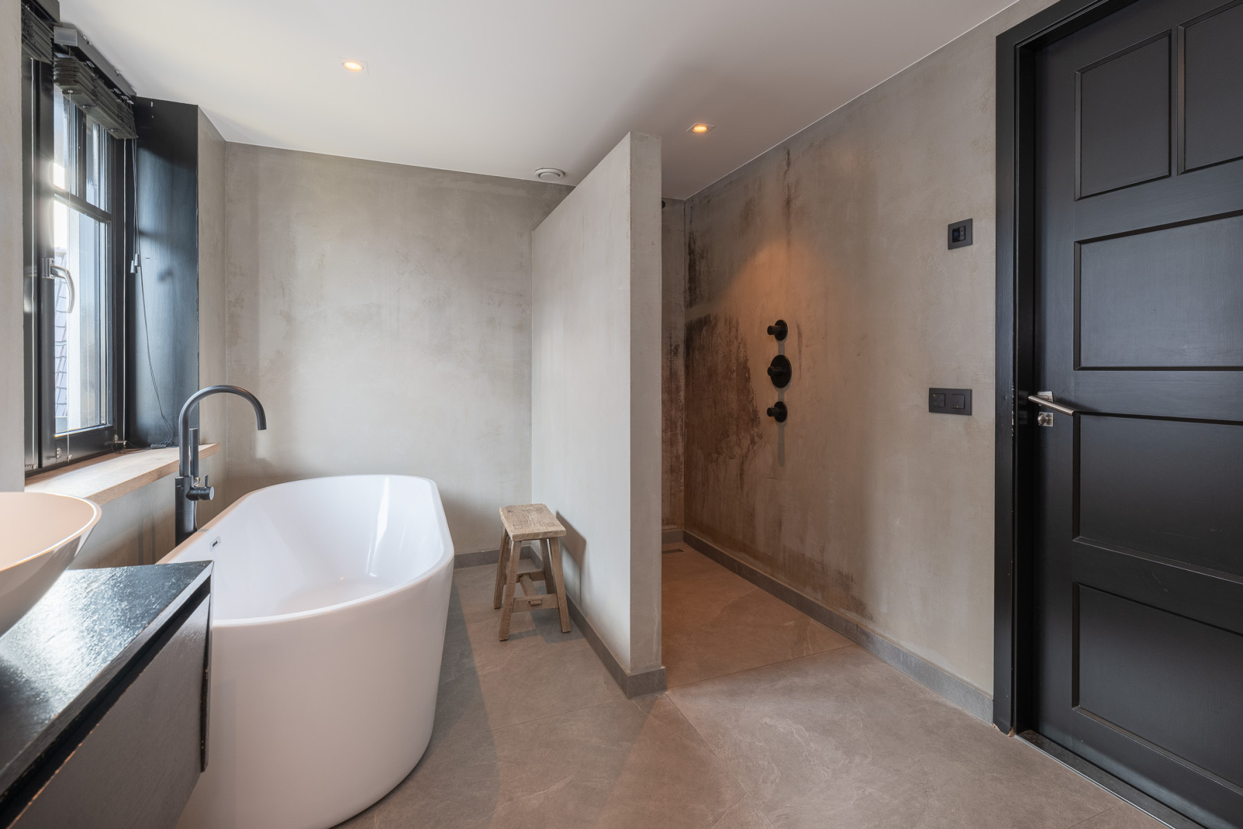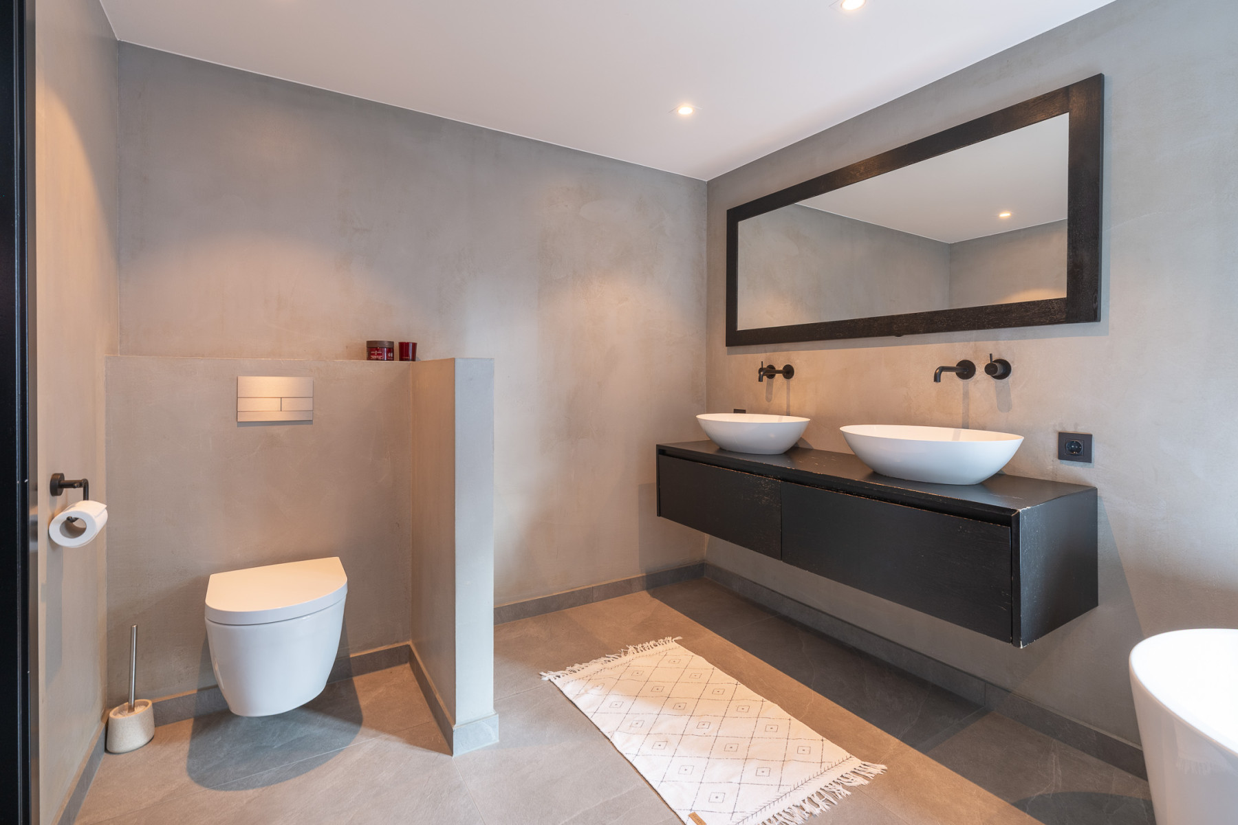 Deze badkamer beschikt over werkelijk alle gemakken! De ruimte is afgewerkt in warme aardetinten, u kunt hier gebruik maken van de ruime inloopdouche met regenkop, een ligbad en een toilet. Daarnaast is hier een dubbele wastafel aanwezig en zorgt de vloerverwarming voor extra comfort.