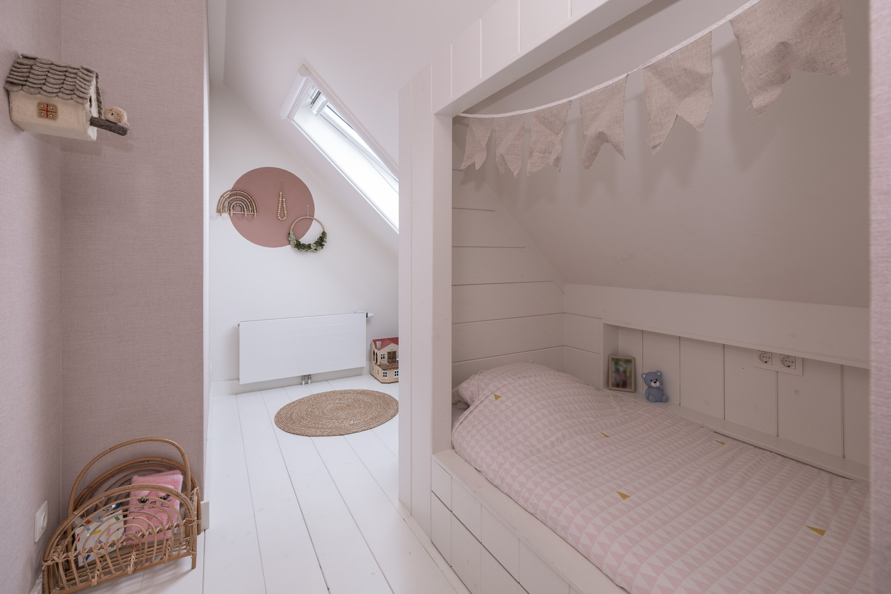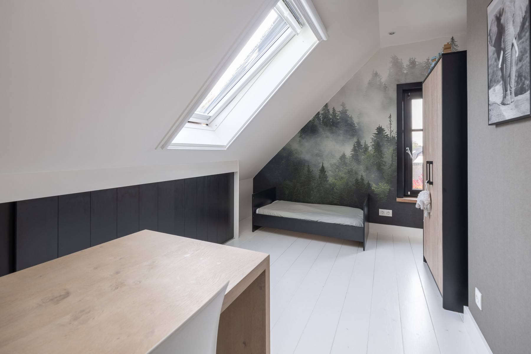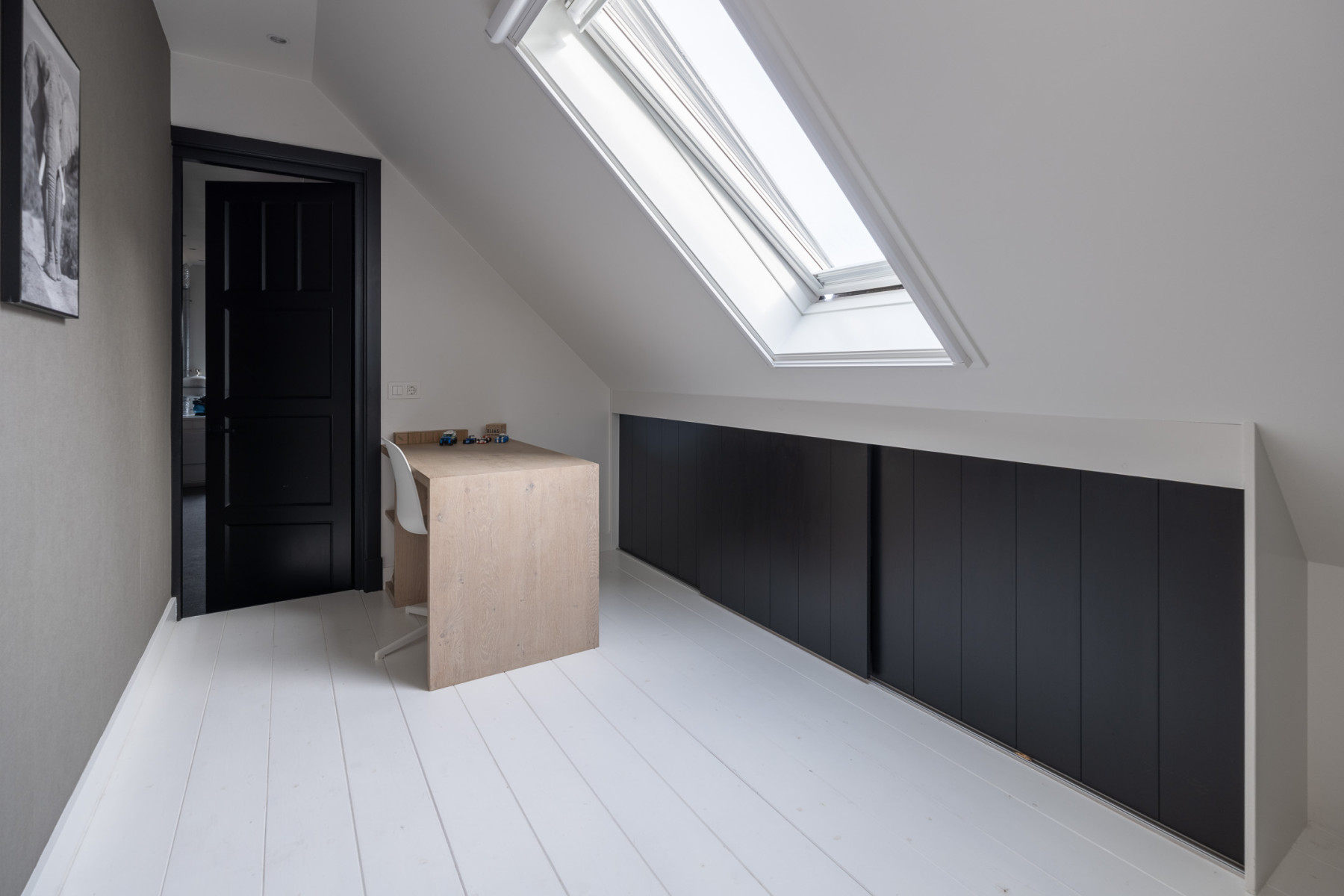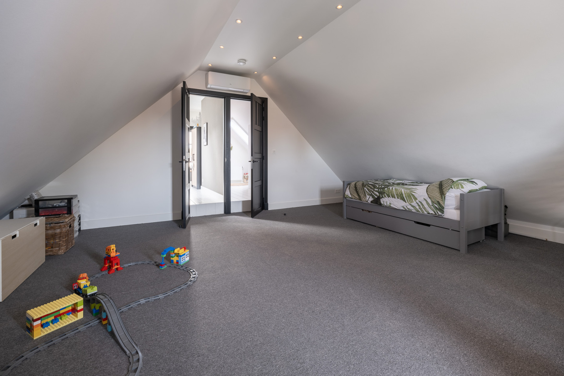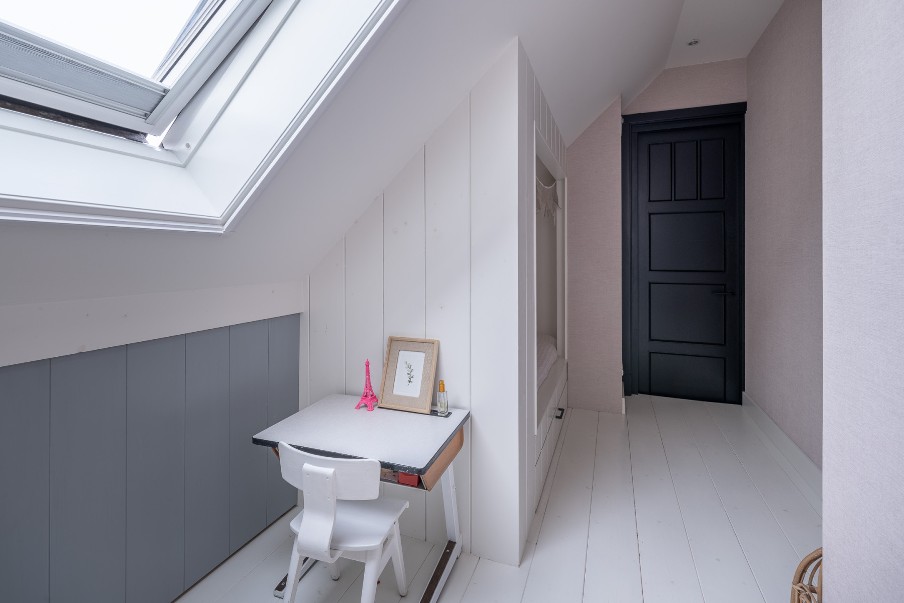 Via de tweede trapopgang komt u aan op de tweede verdieping waar nog twee slaapkamers zijn gerealiseerd. Deze kamers zijn beide voorzien van een Velux dakraam en berging achter knieschot. In de kamer aan de rechterzijde is nog een airconditioning unit aanwezig, die net zoals de andere units koelt en verwarmt.