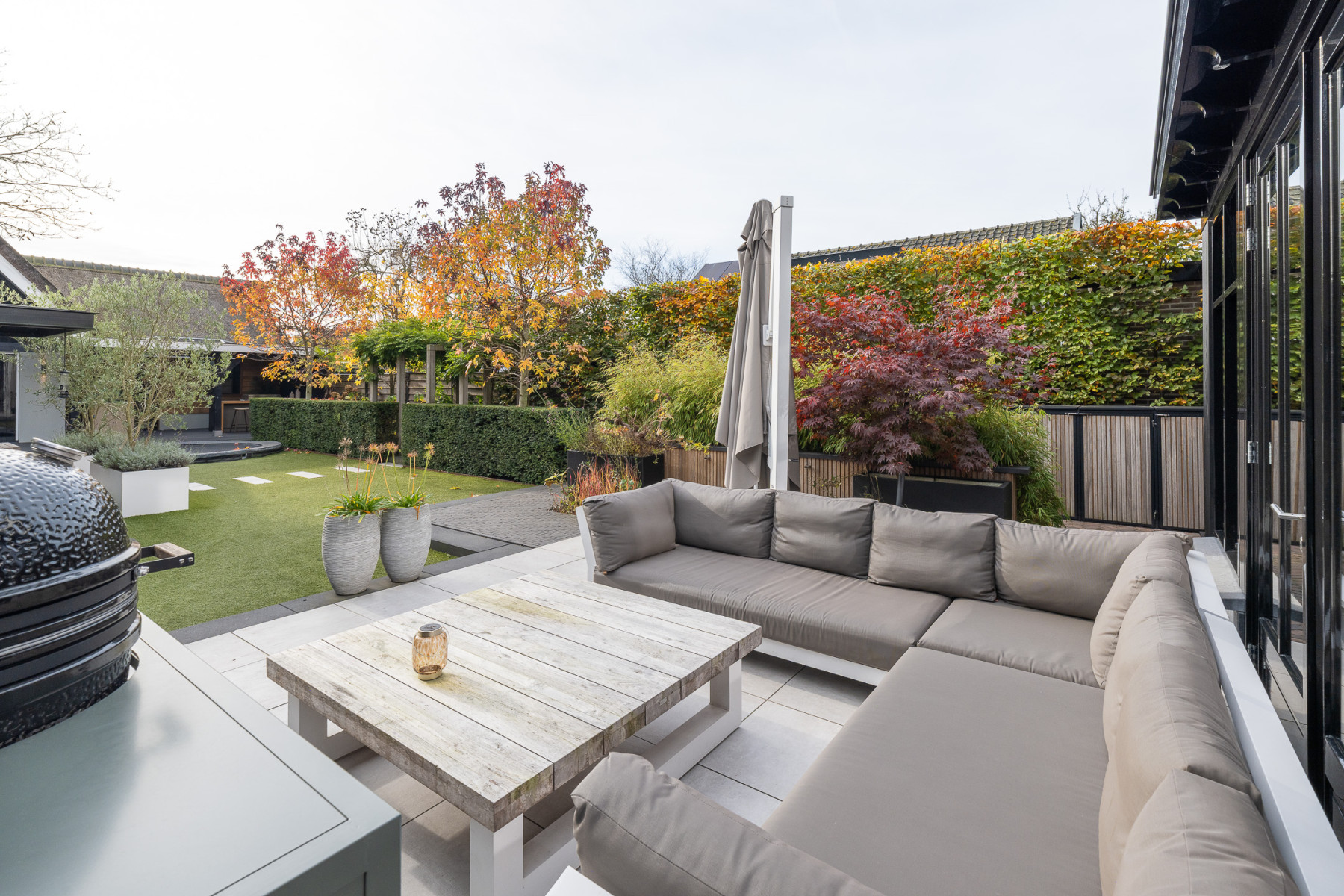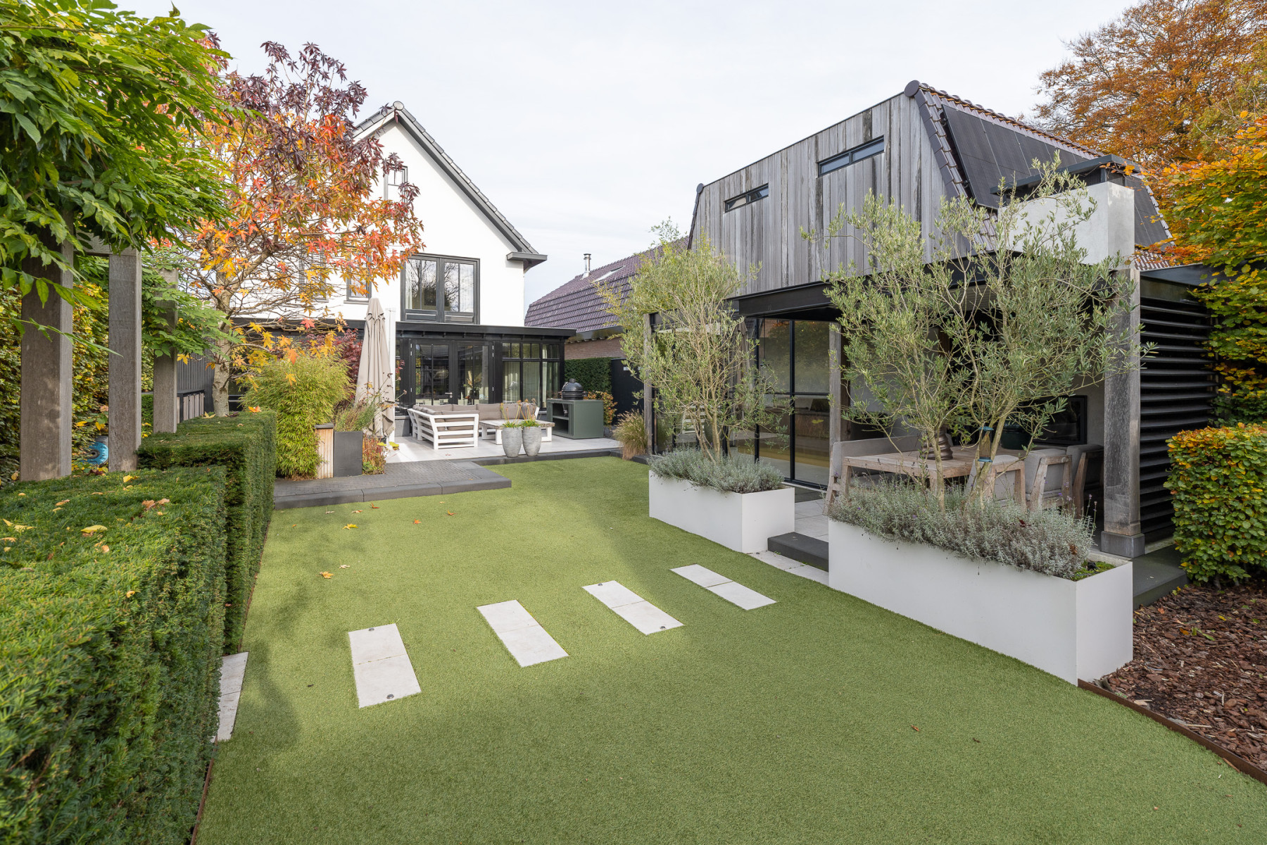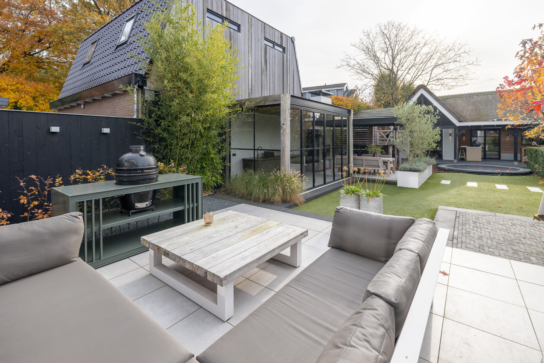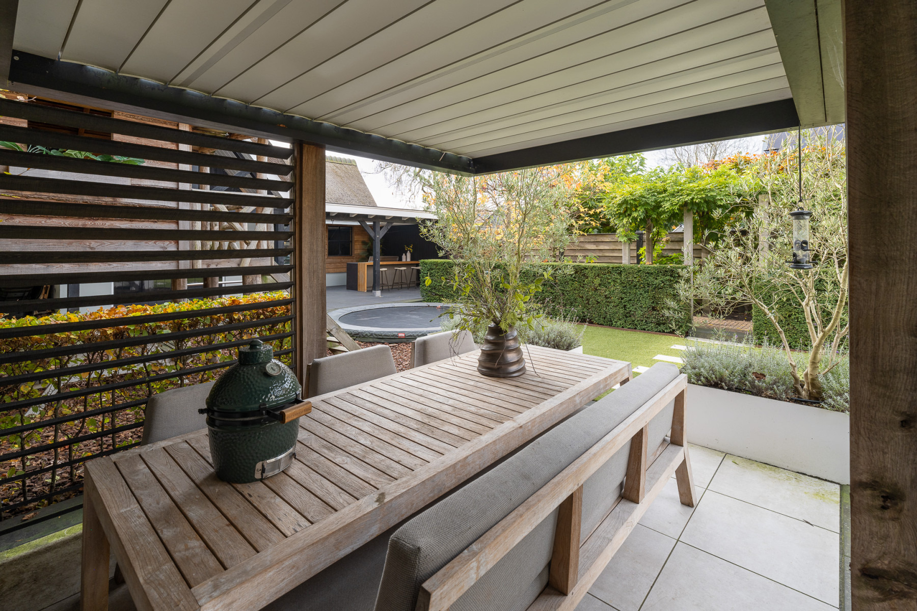 Bij een keurig afgewerkte woning hoort een al nét zo keurige tuin! De achtertuin is zowel via de zijingang, als via de woning te bereiken. Het biedt een fijne combinatie van beplanting, bestrating en zitruimte en de gehele tuin is voorzien van verlichting en beregening. U vindt direct achter de woning een ruim terras met als leuk element het fonteintje, dat zorgt voor een speels effect. Naast het gazon van kunstgras is een tuinkamer geplaatst met daarnaast een overkapping, waar nog een houtkachel is geplaatst. Tijdens zonnige dagen kunt u ook hier genieten van de zon, het lamellen dak is namelijk gemakkelijk in te schuiven middels het Domoticasysteem.
