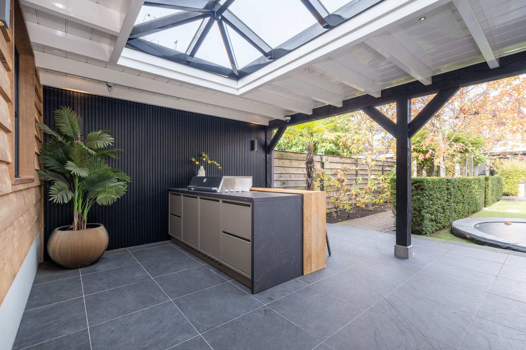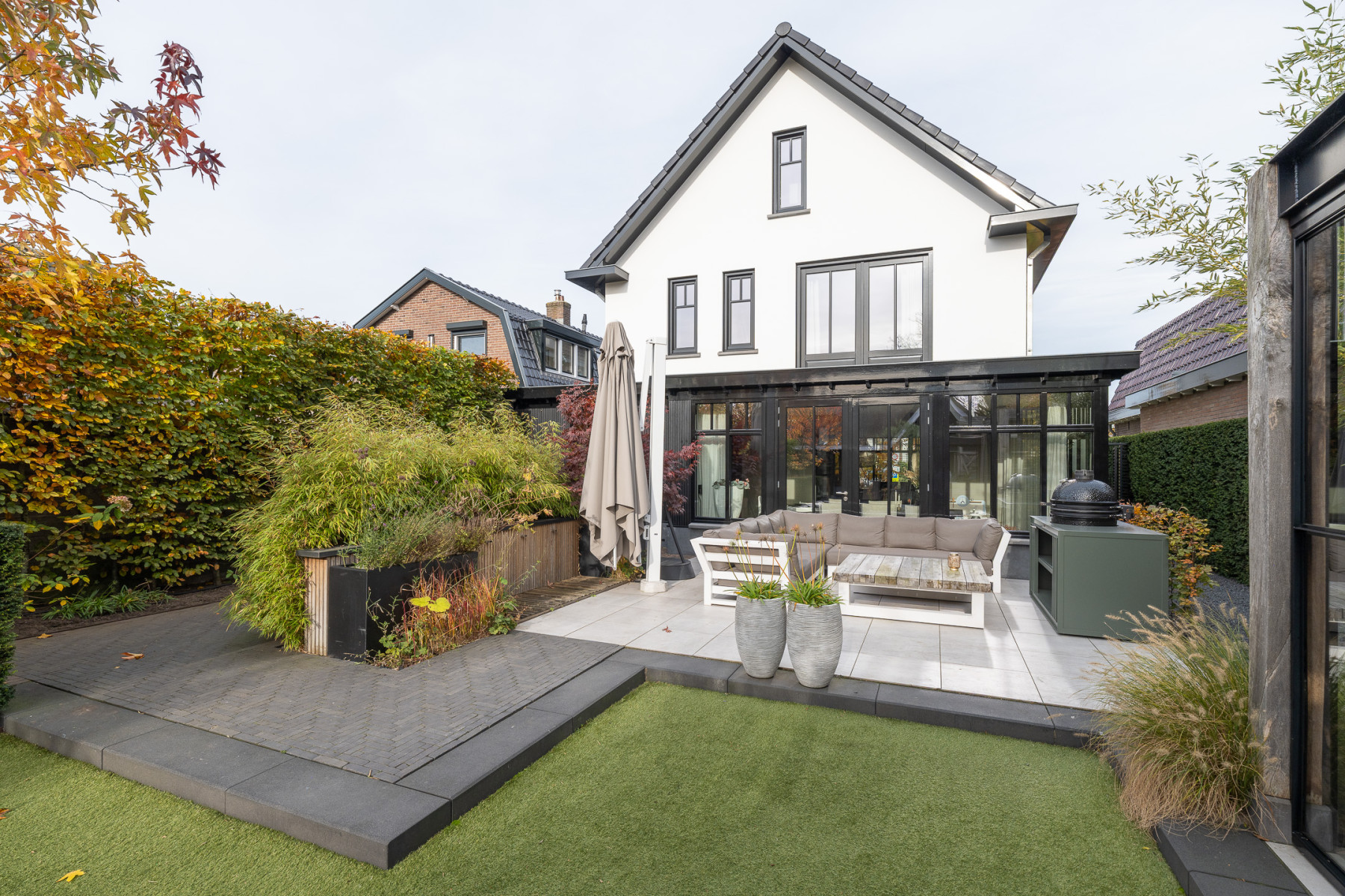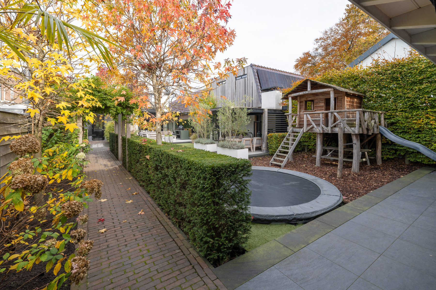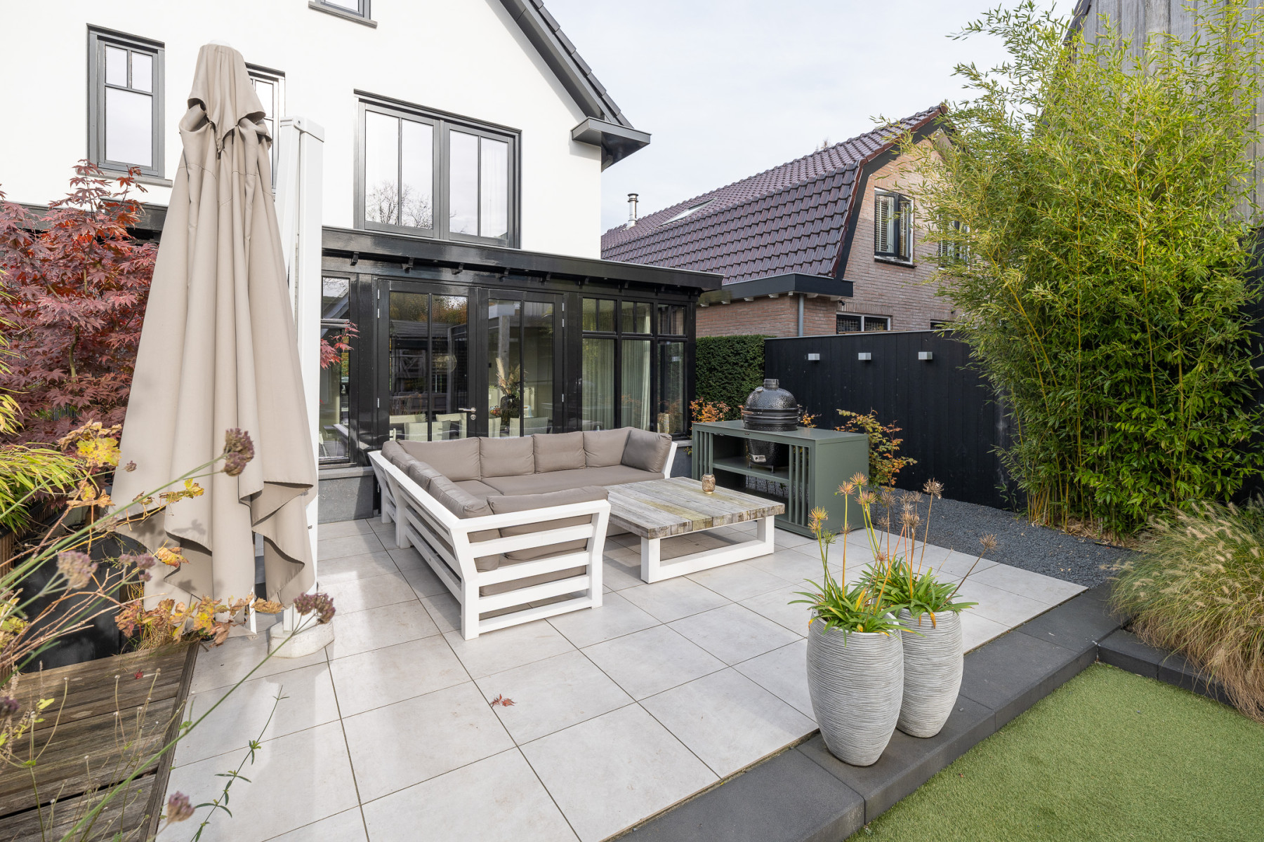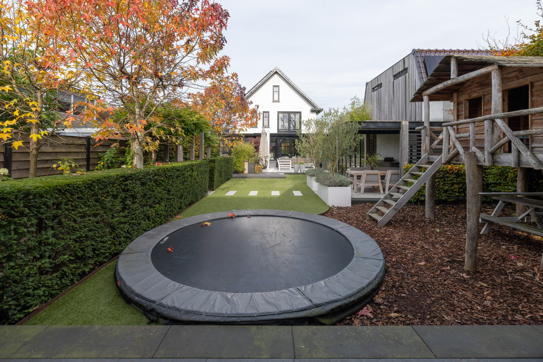 Bij een keurig afgewerkte woning hoort een al nét zo keurige tuin! De achtertuin is zowel via de zijingang, als via de woning te bereiken. Het biedt een fijne combinatie van beplanting, bestrating en zitruimte en de gehele tuin is voorzien van verlichting en beregening. U vindt direct achter de woning een ruim terras met als leuk element het fonteintje, dat zorgt voor een speels effect. Naast het gazon van kunstgras is een tuinkamer geplaatst met daarnaast een overkapping, waar nog een houtkachel is geplaatst. Tijdens zonnige dagen kunt u ook hier genieten van de zon, het lamellen dak is namelijk gemakkelijk in te schuiven middels het Domoticasysteem.