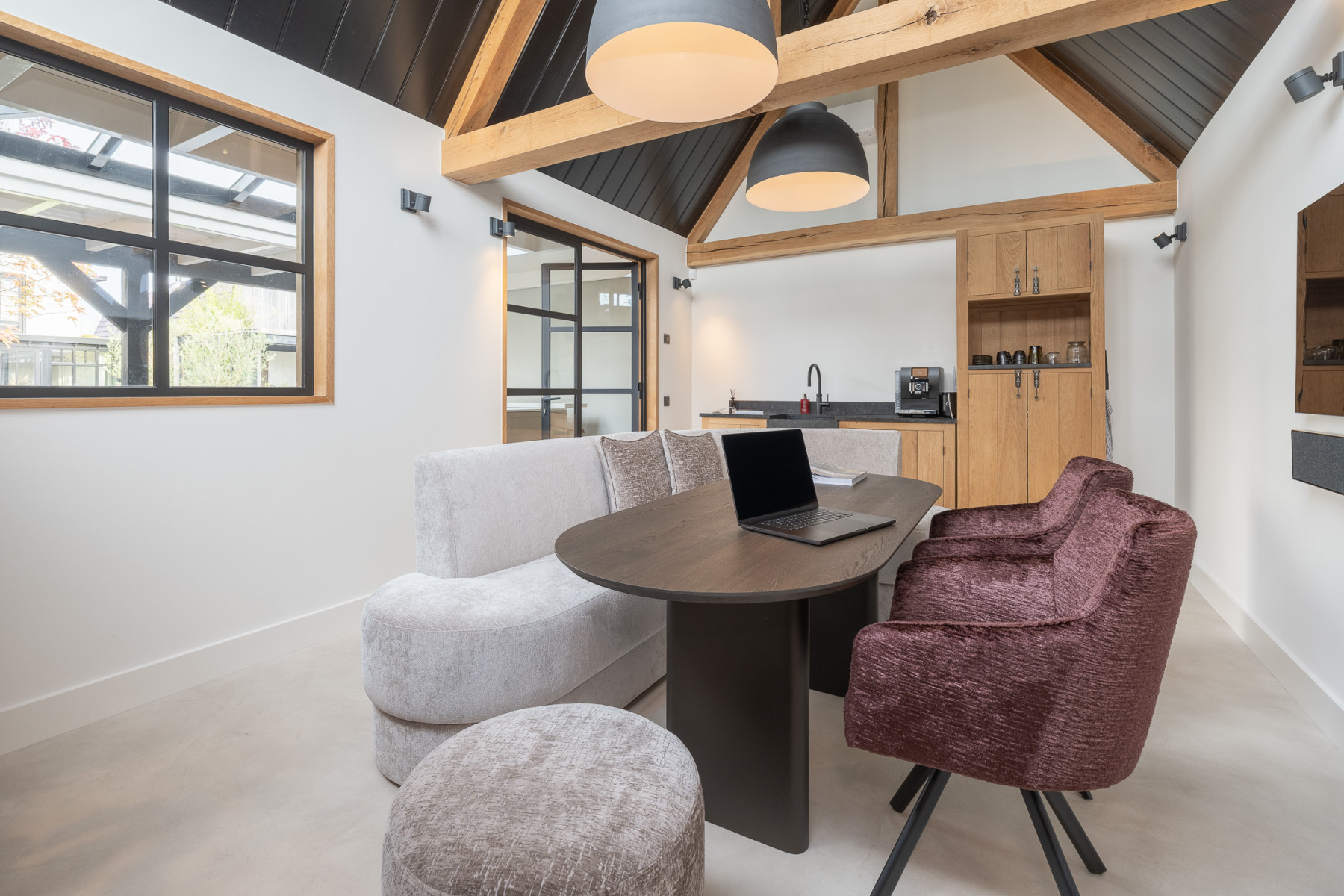 Achter in de tuin staat dit prachtige bijgebouw dat is opgedeeld in twee delen. De rechterzijde is strak afgewerkt met een betonnen gietvloer en inbouwspots. Aan de linkerzijde vindt u de schuur die veel bergruimte biedt en waar zich de meterkast en CV-ketel bevinden. Ook is hier een werkbank aanwezig en de trapopgang naar de verdieping van het bijgebouw. Dankzij de volledige isolatie, vloerverwarming en de aanwezige gas-, internet- en rioolaansluitingen is het mogelijk dit gebouw volledig zelfvoorzienend te maken. Ideaal dus voor een kantoor aan huis, een hobby- of praktijkruimte of zelfs een mantelzorgwoning!
