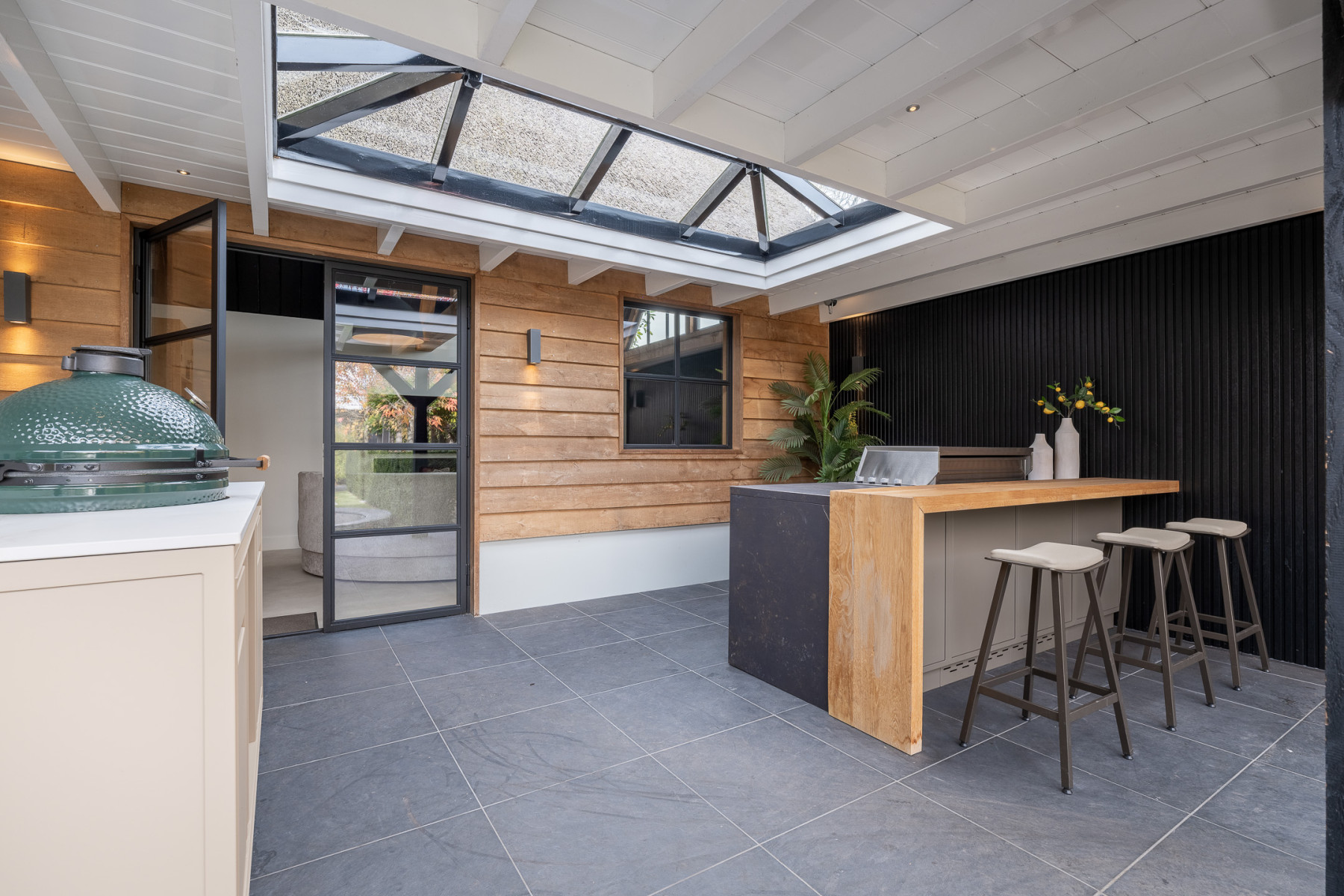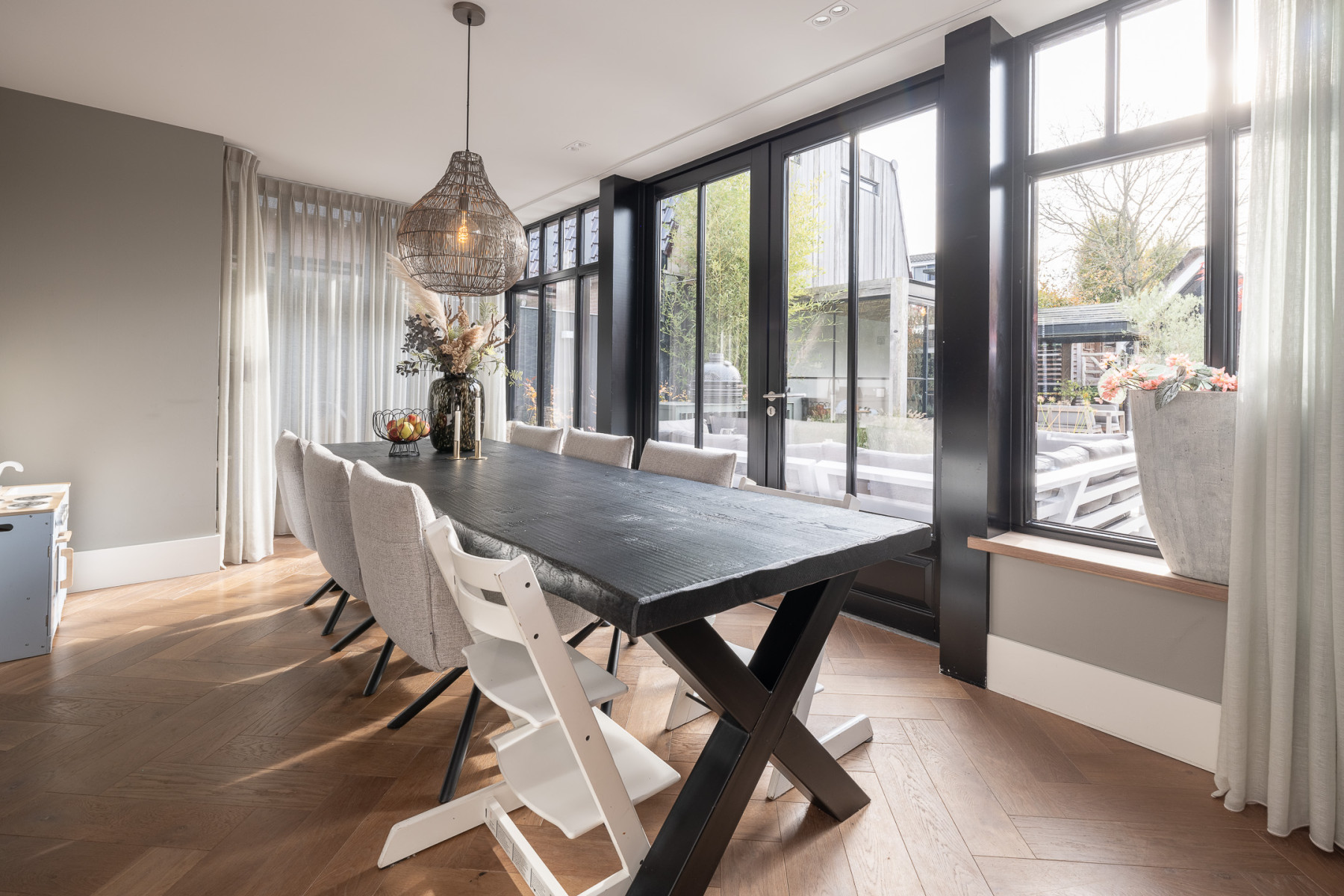 De luxe en het comfort van deze woning is ook in deze serre te voelen. U kijkt hier vanuit uw stoel prachtig uit over de tuin, die ook te bereiken is door de openslaande deuren. Er is een vaste kast geplaatst die praktische opbergruimte biedt, zo is ook de airconditioning (die koelt én verwarmt) hier mooi weggewerkt.