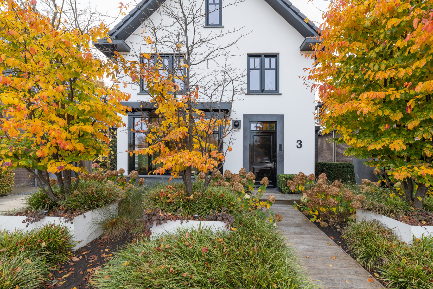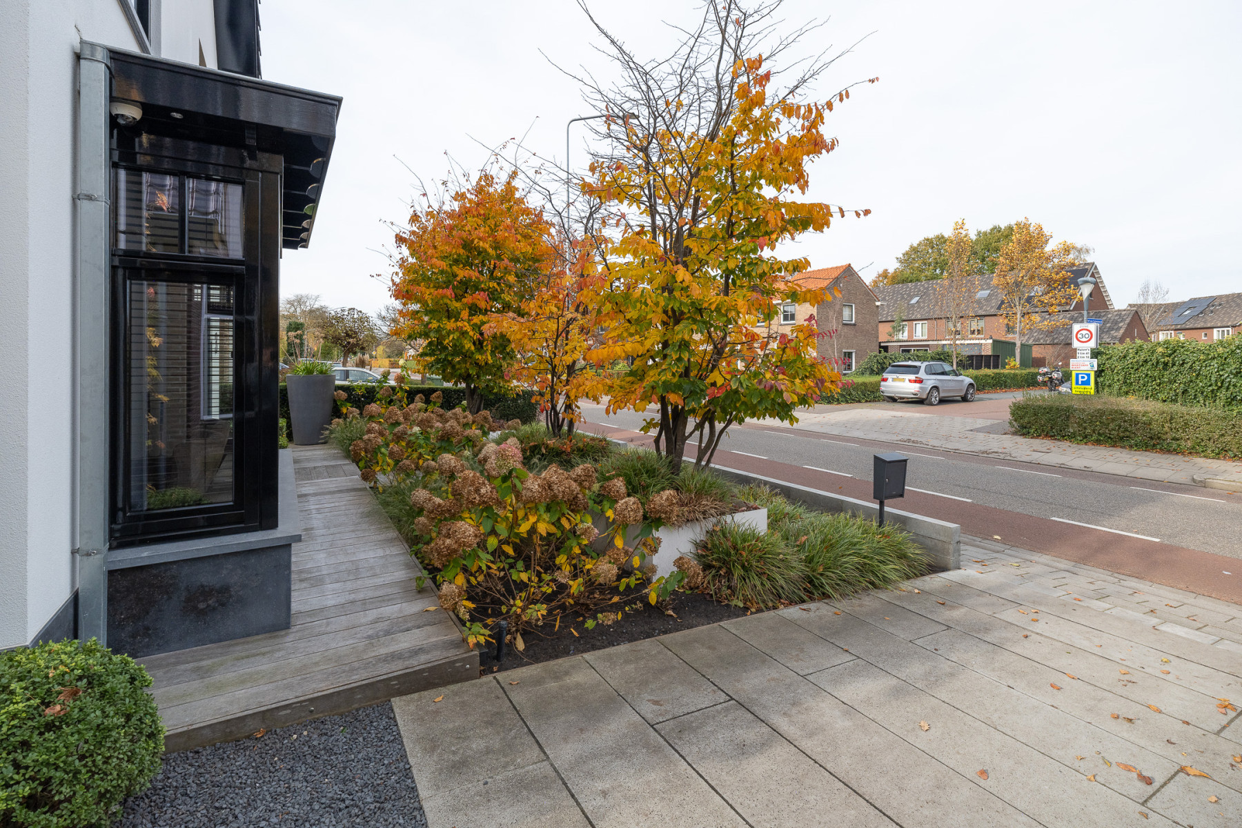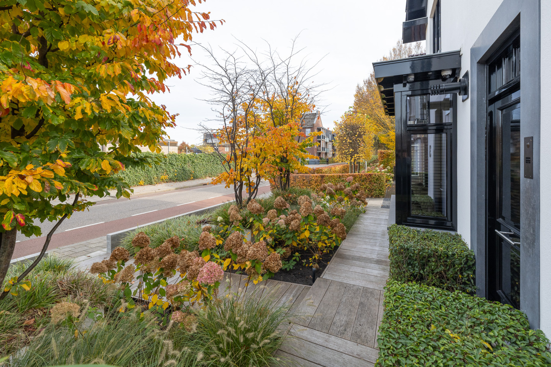De voortuin is al net zo mooi verzorgd, het houten vlonder die tot de voordeur leidt wordt omgeven door beplanting en mooie boompjes. En ook ideaal is de eigen oprit waar u uw auto kwijt kunt.