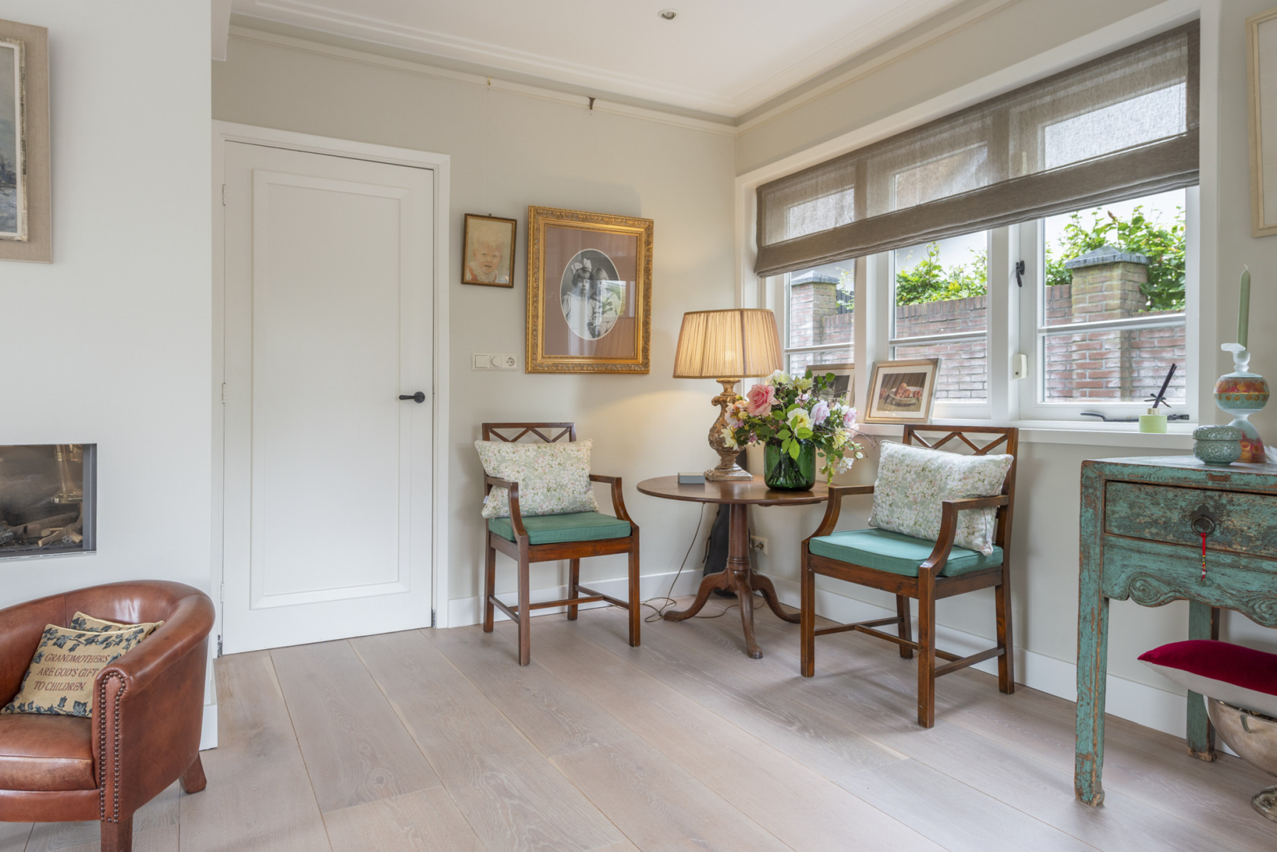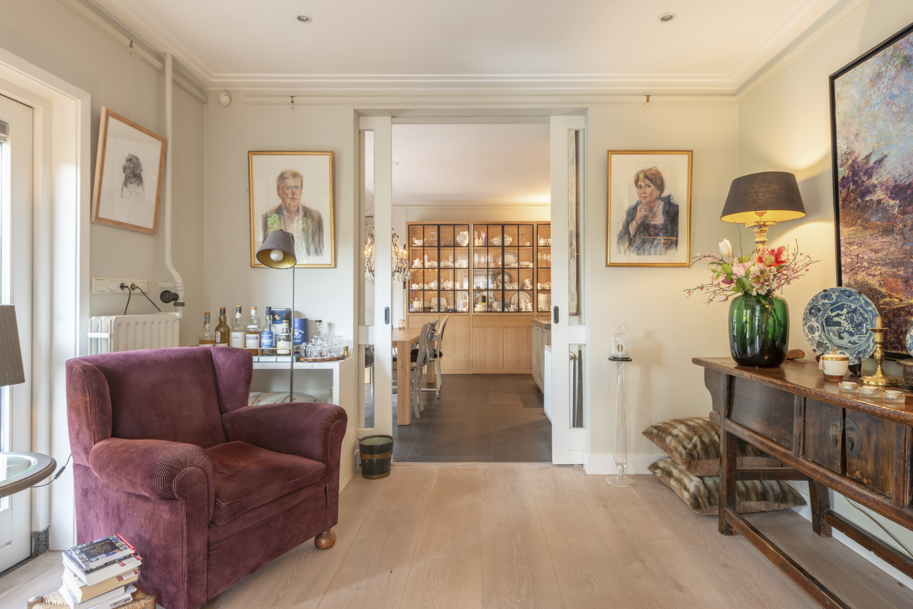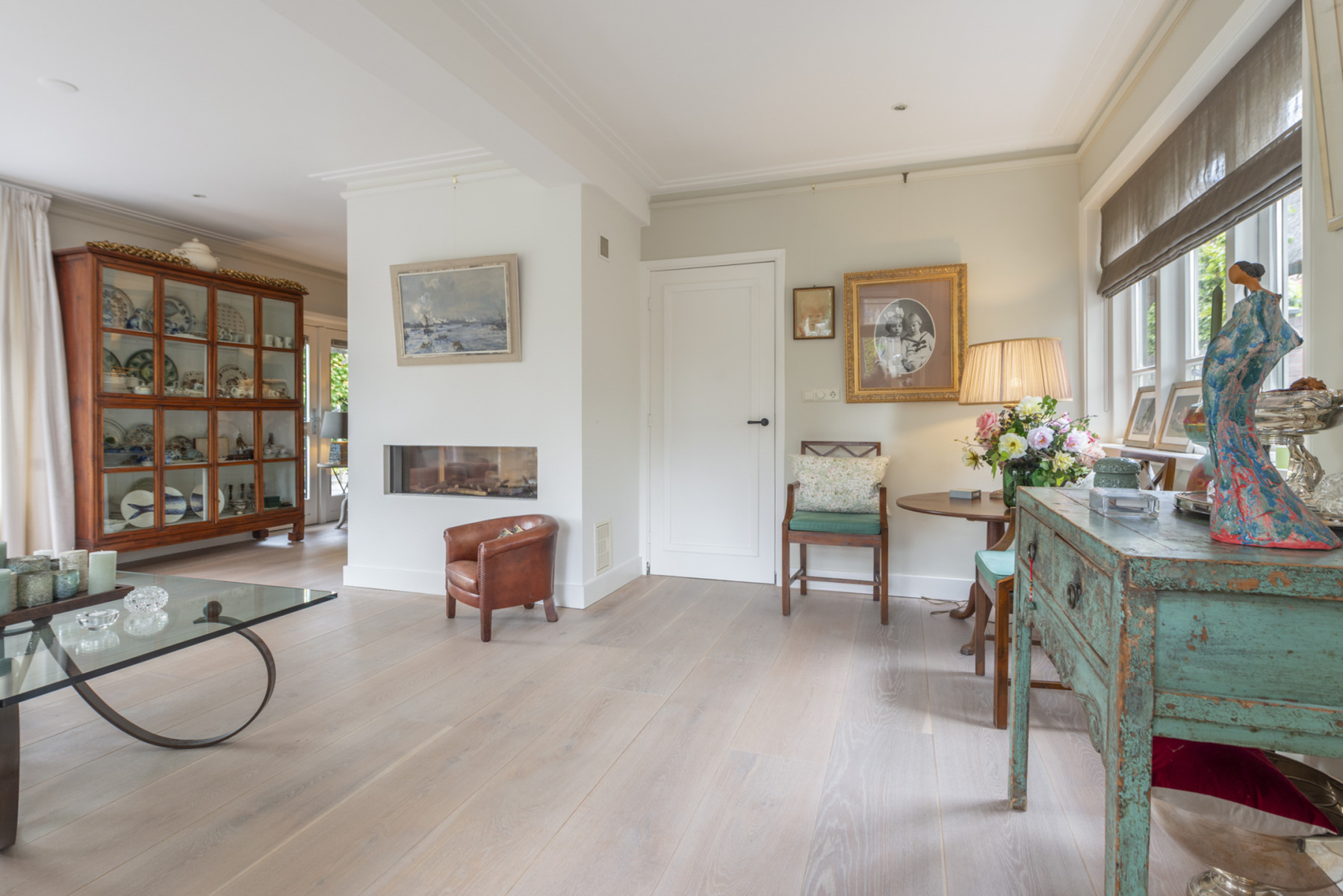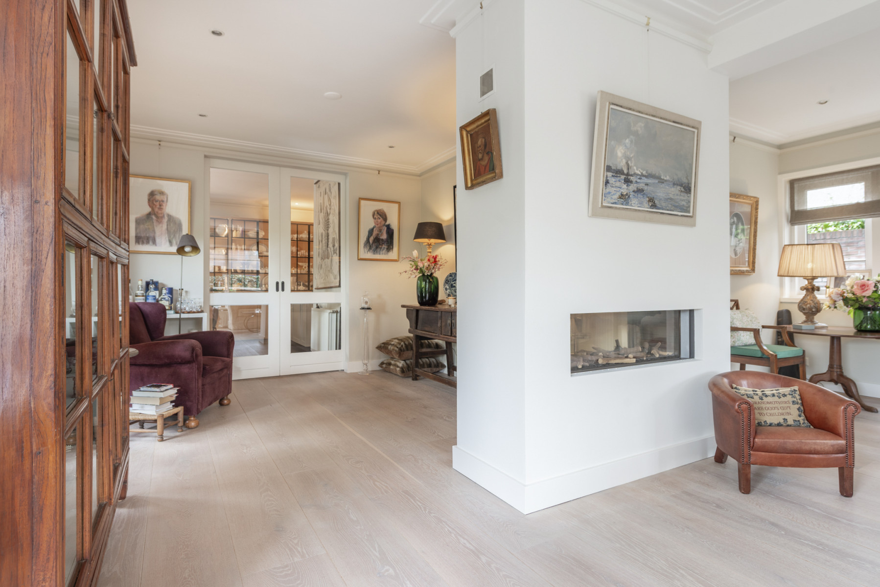 De houten vloer geeft warmte en karakter, samen met de lichte wanden en het strakke, gestuukte plafond zorgt dit voor