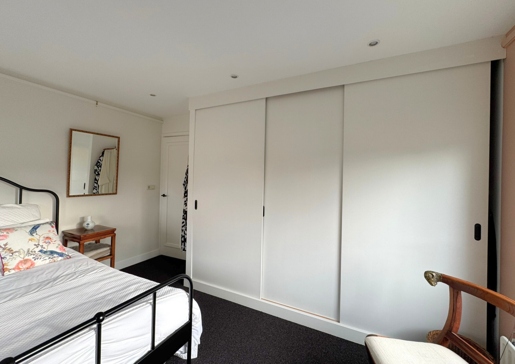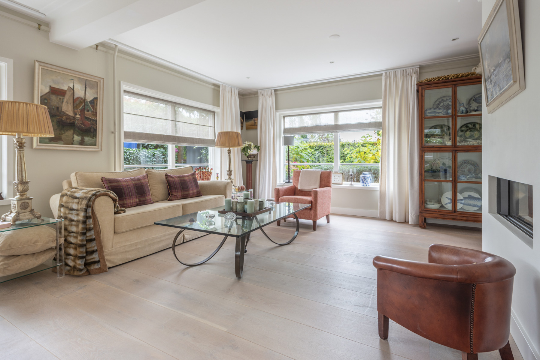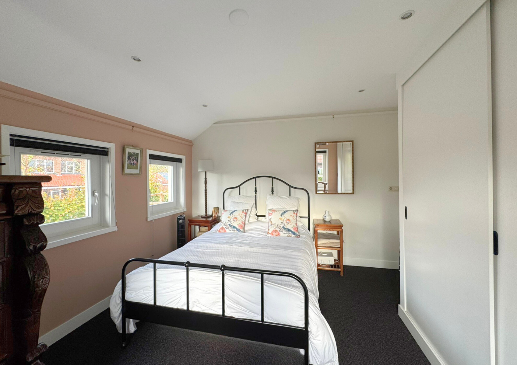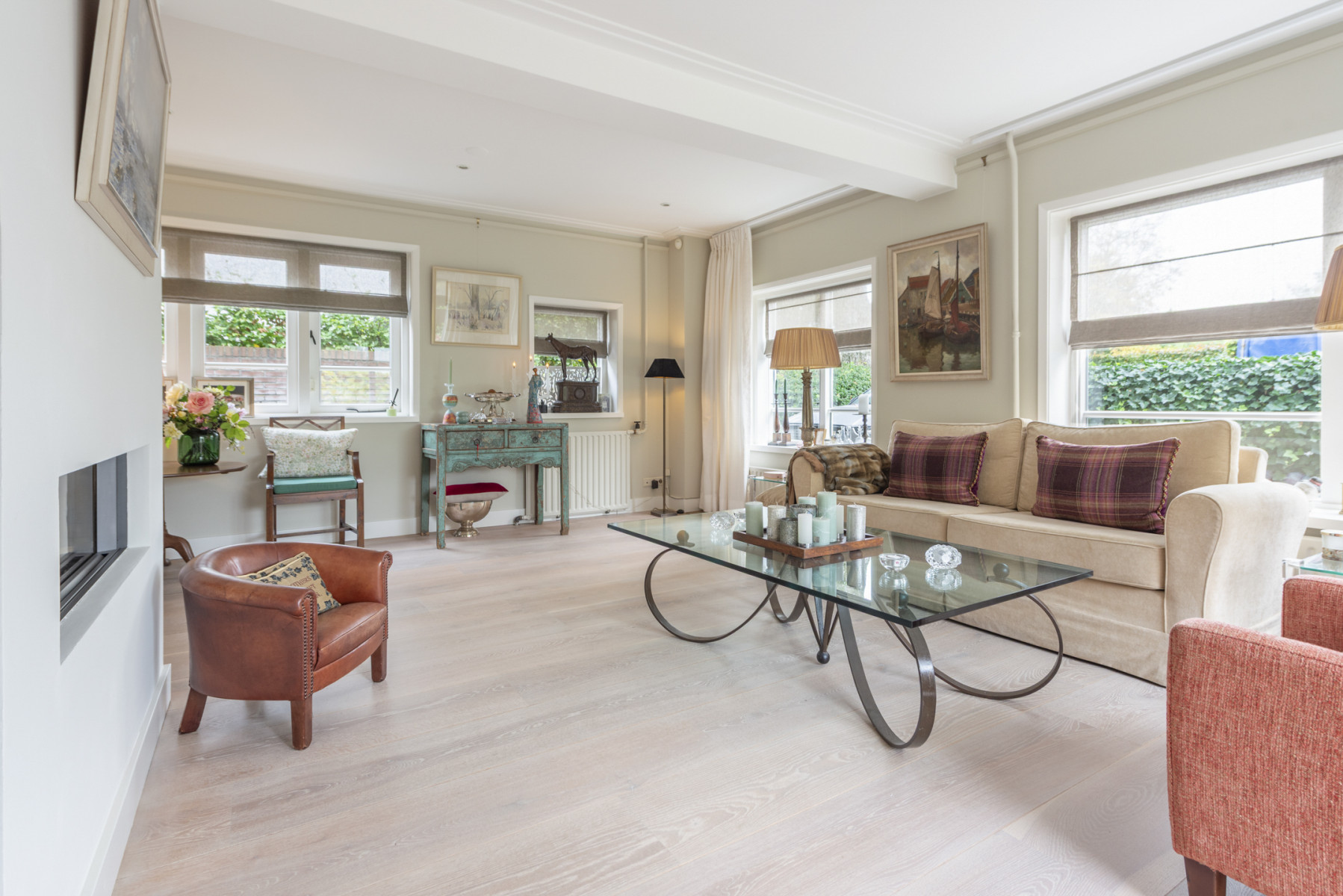 De houten vloer geeft warmte en karakter, samen met de lichte wanden en het strakke, gestuukte plafond zorgt dit voor