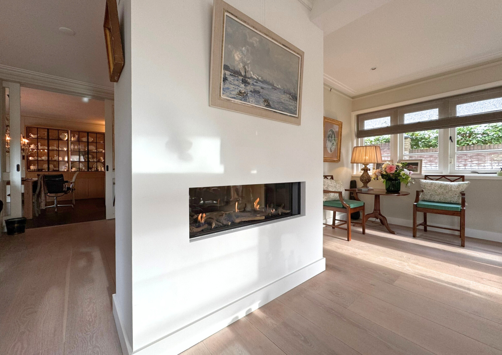 een frisse en moderne basis. De woonkamer biedt u voldoende ruimte voor een gezellige zithoek. Door de meerdere raampartijen valt er veel daglicht naar binnen. In de wintermaanden biedt de sfeervolle gashaard u een fijne warmte én extra gezelligheid. Verder is de woonkamer voorzien van openslaande deuren naar de veranda. Wanneer u deze opent op mooie dagen, combineert u binnen met buiten. Een fijne bijkomstigheid: de woonkamer is middels kamer-en-suite-deuren af te sluiten van de woonkeuken.