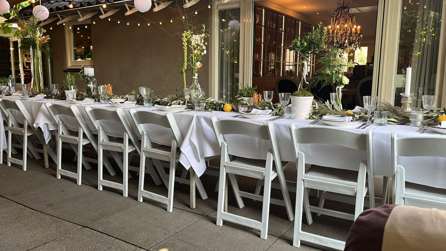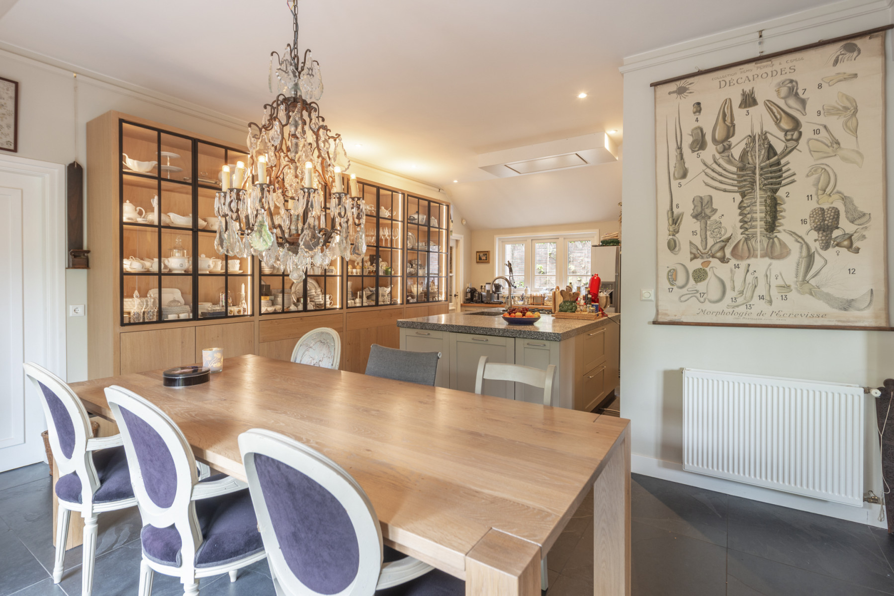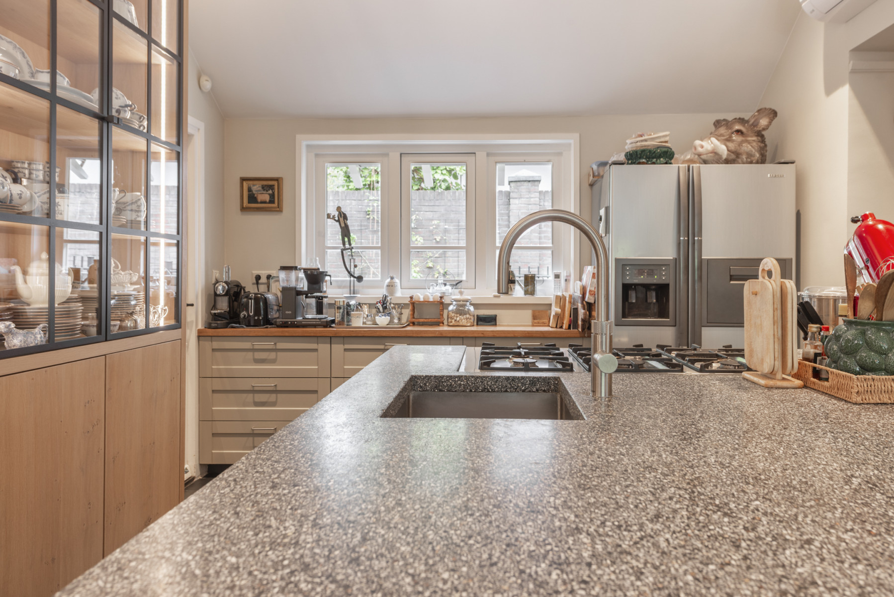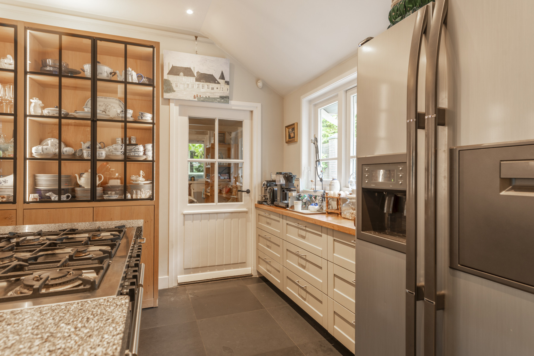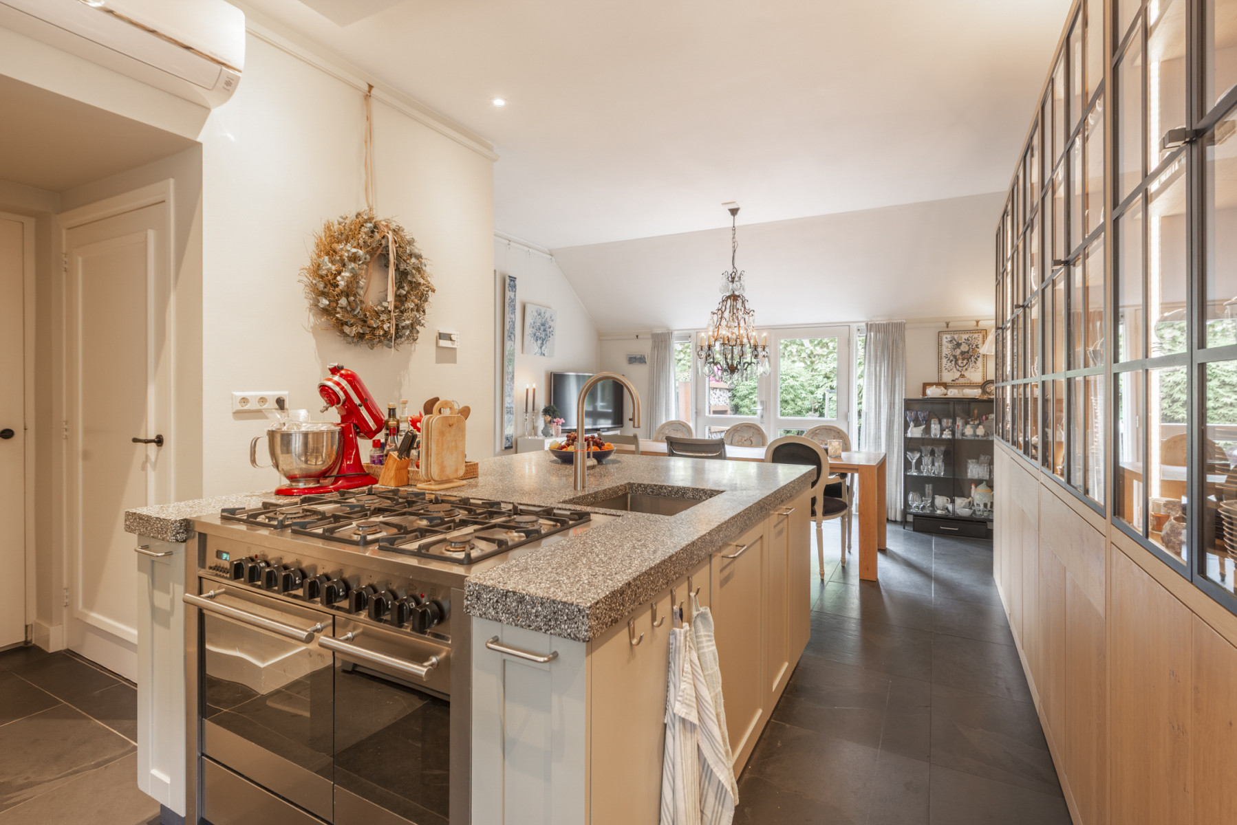 In deze woonkeuken kookt, eet en leeft u echt samen. Het is een plek die u veel licht, gezelligheid en ruimte biedt. Plaats een grote eettafel, waar u met het gezin, uw familie of vrienden samen kunt dineren of gezellig bijkletsen. Bij de eettafel vindt u openslaande deuren. Op zonnige dagen kunt u de deuren openzetten en loopt u zo naar buiten, een lekker ontbijtje met fluitende vogels op de achtergrond. De keuken zelf is in twee delen opgesteld. Aan één zijde bevindt zich een rechte opstelling met veel kastruimte en een koel-vriescombinatie met een ijsblokjesmachine. Het andere deel is het kookeiland. Het hart van de ruimte met een 6-pits gasfornuis met twee ovens, een afzuigkap, een vaatwasmachine, een Quooker én een heleboel kasten en laden. Alles wat u nodig heeft voor een uitgebreid diner. Ook aan comfort is gedacht, de airconditioning zorgt voor een aangename temperatuur, elk seizoen.