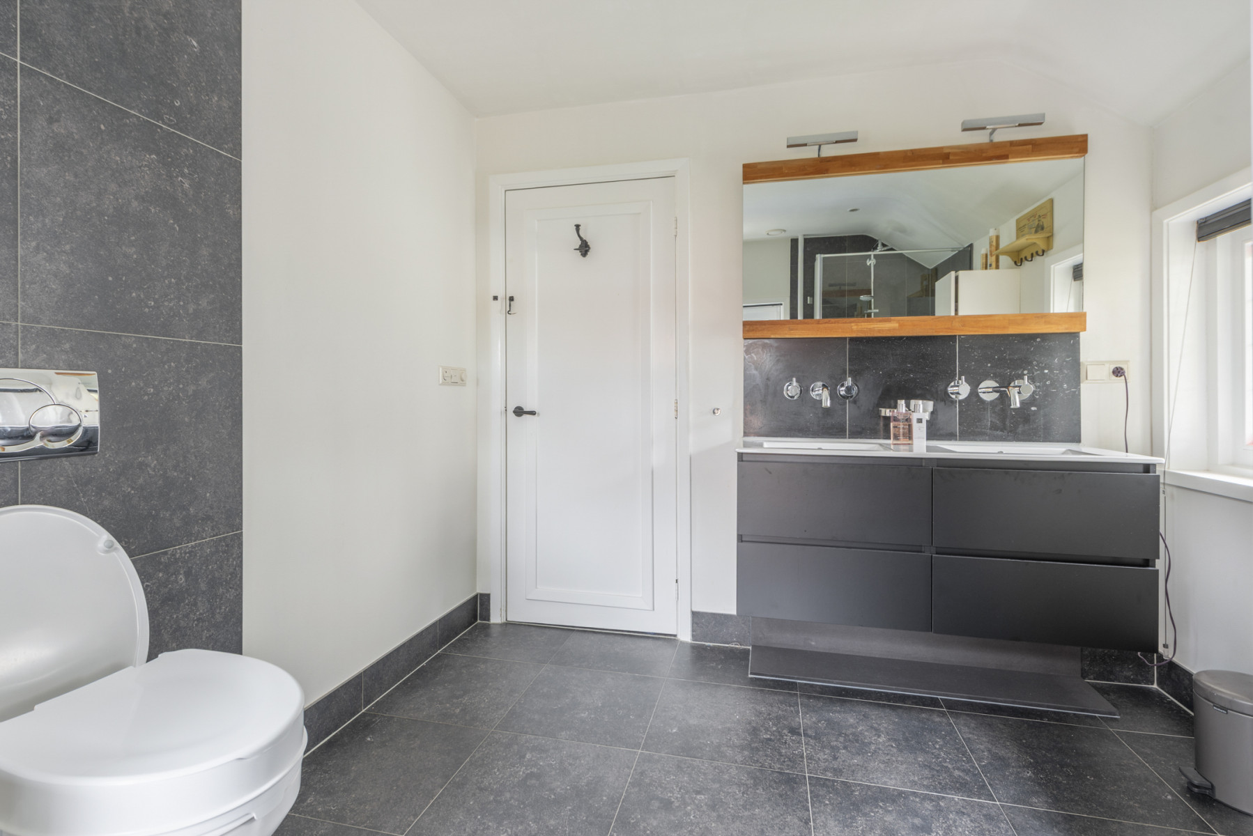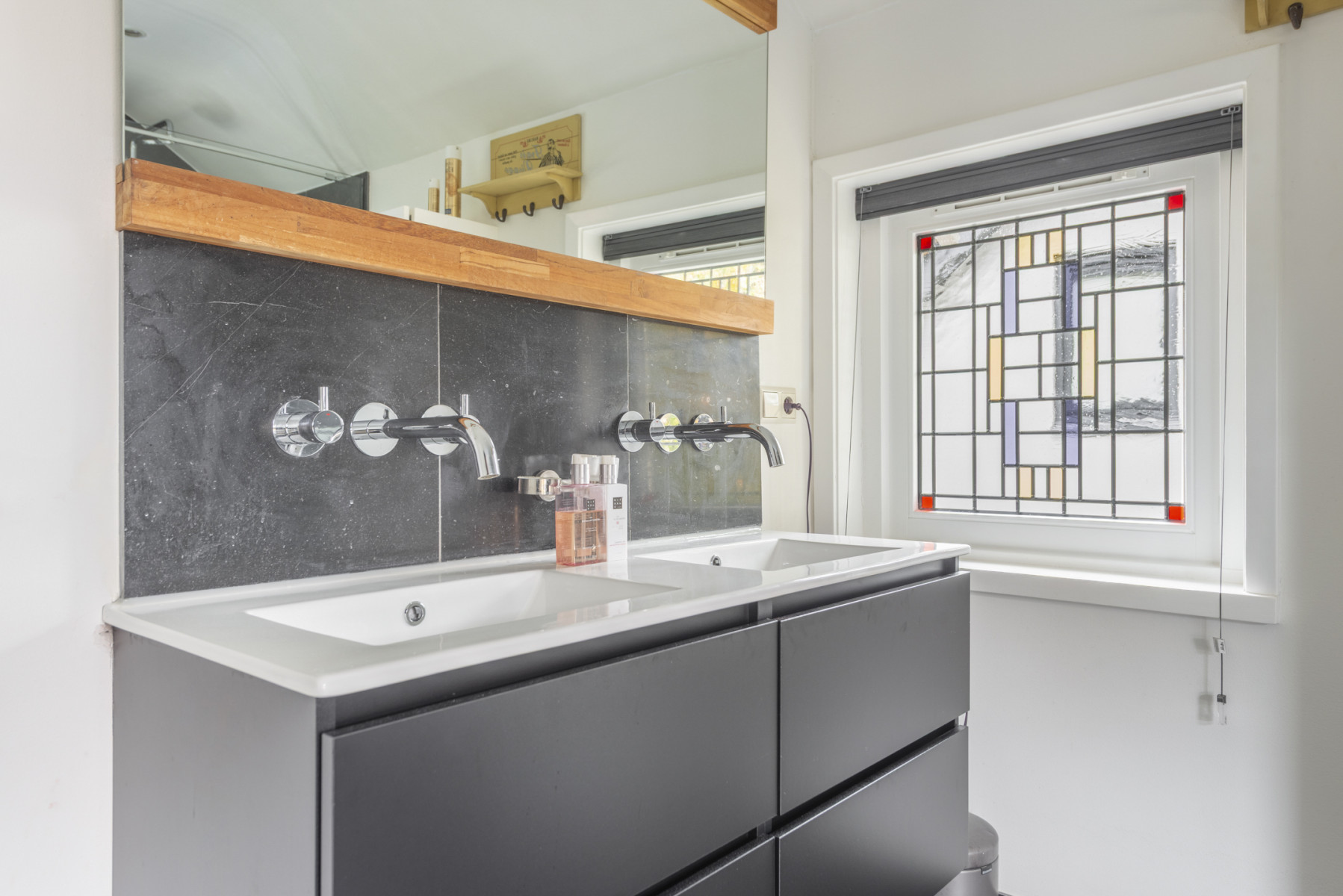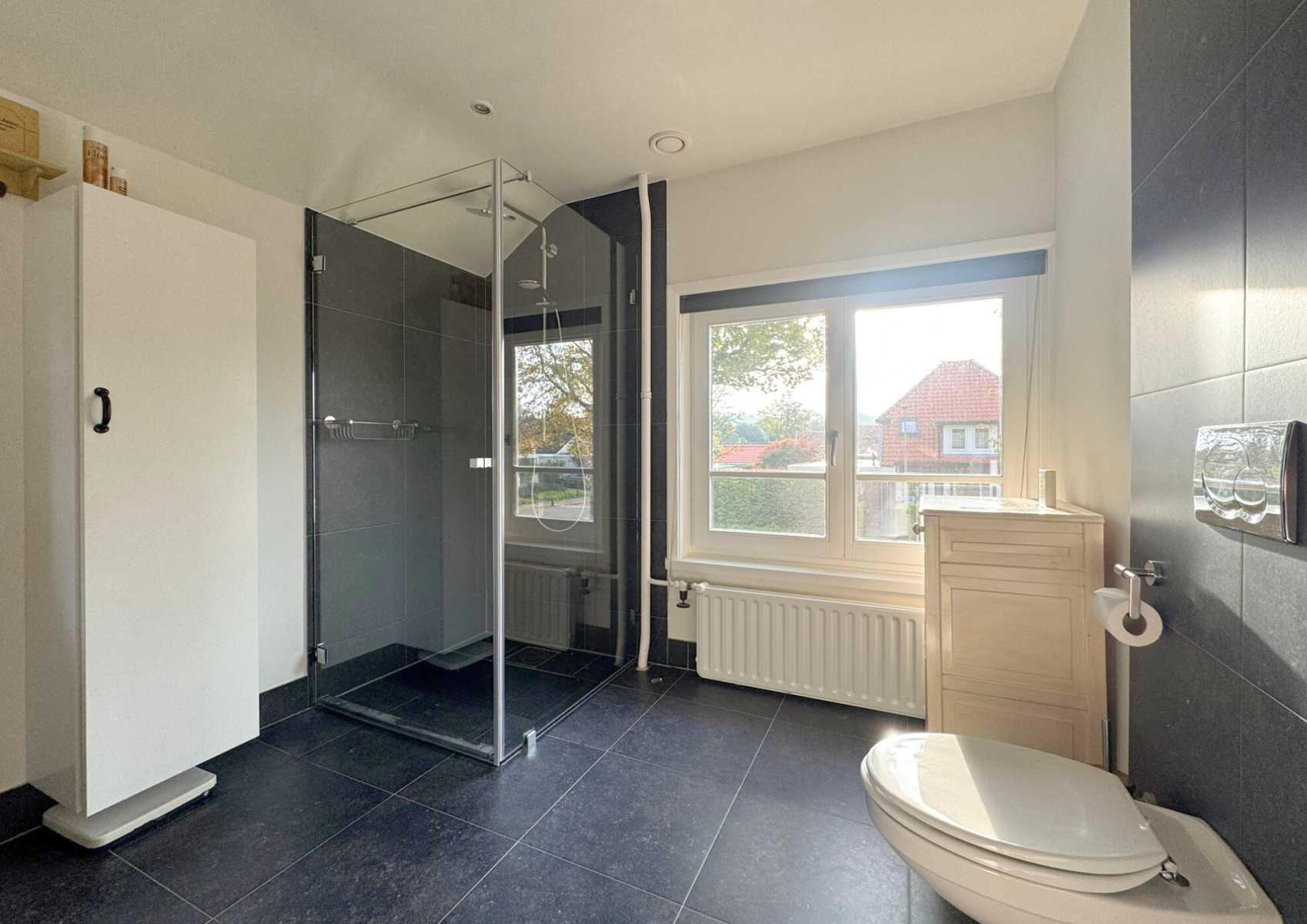 De badkamer is een mooie ruimte met lichte wanden en een donkere tegelvloer, wat voor een moderne uitstraling zorgt. U beschikt hier over alles wat u nodig heeft, een inloopdouche met glazen wanden en een regendouche, wastafelmeubel met wastafel die recent vernieuwd is en een toilet. Alles is netjes afgewerkt en goed onderhouden, klaar om elke dag te gebruiken.