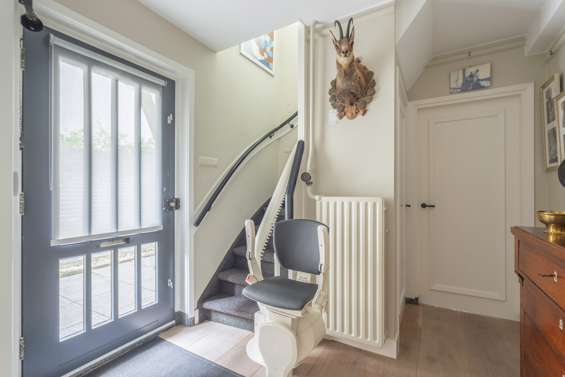 de trapopgang naar de eerste verdieping, de meterkast en een praktische kelderkast. Vanuit de hal krijgt u toegang tot de woonkamer en de woonkeuken.
