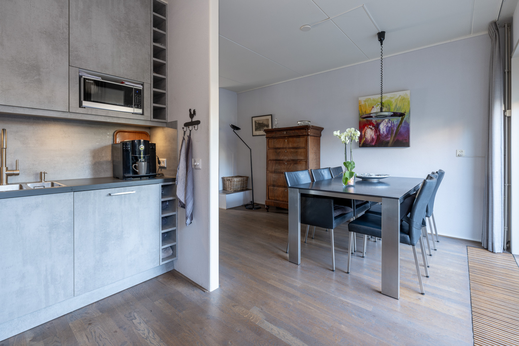 Grenzend aan de keuken is er plek voor een grote eettafel. Ideaal voor lange avonden tafelen of voor een snelle kop koffie in de ochtend. Vanuit hier stapt u middels de schuifpui of middels de loopdeur zo de achtertuin in. Dat betekent veel licht in de ruimte en een directe verbinding met buiten.