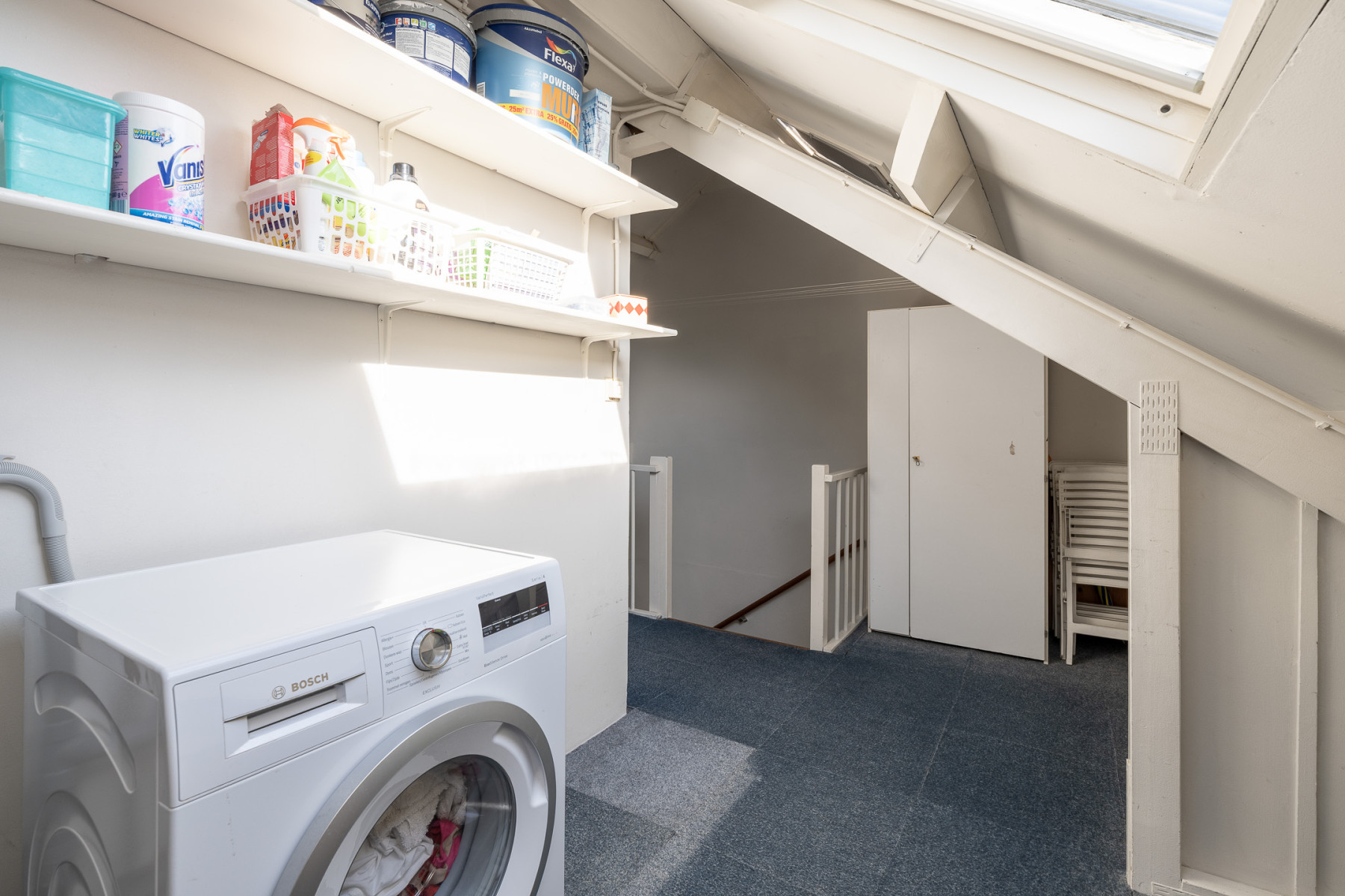 Via een vaste trap bereiken we de tweede verdieping en komen we eerst op de overloop. Op de overloop treft u de aansluiting van de witgoedapparatuur aan, de opstelling van de cv-ketel, een groot en een klein Velux dakraam en bergruimte achter knieschot aan beide zijden. Daarnaast is op deze verdieping de vierde slaapkamer te vinden. Deze kamer is royaal en beschikt over een dakkapel met een elektrisch bedienbaar rolluik, bergruimte achter knieschot en een wastafel.