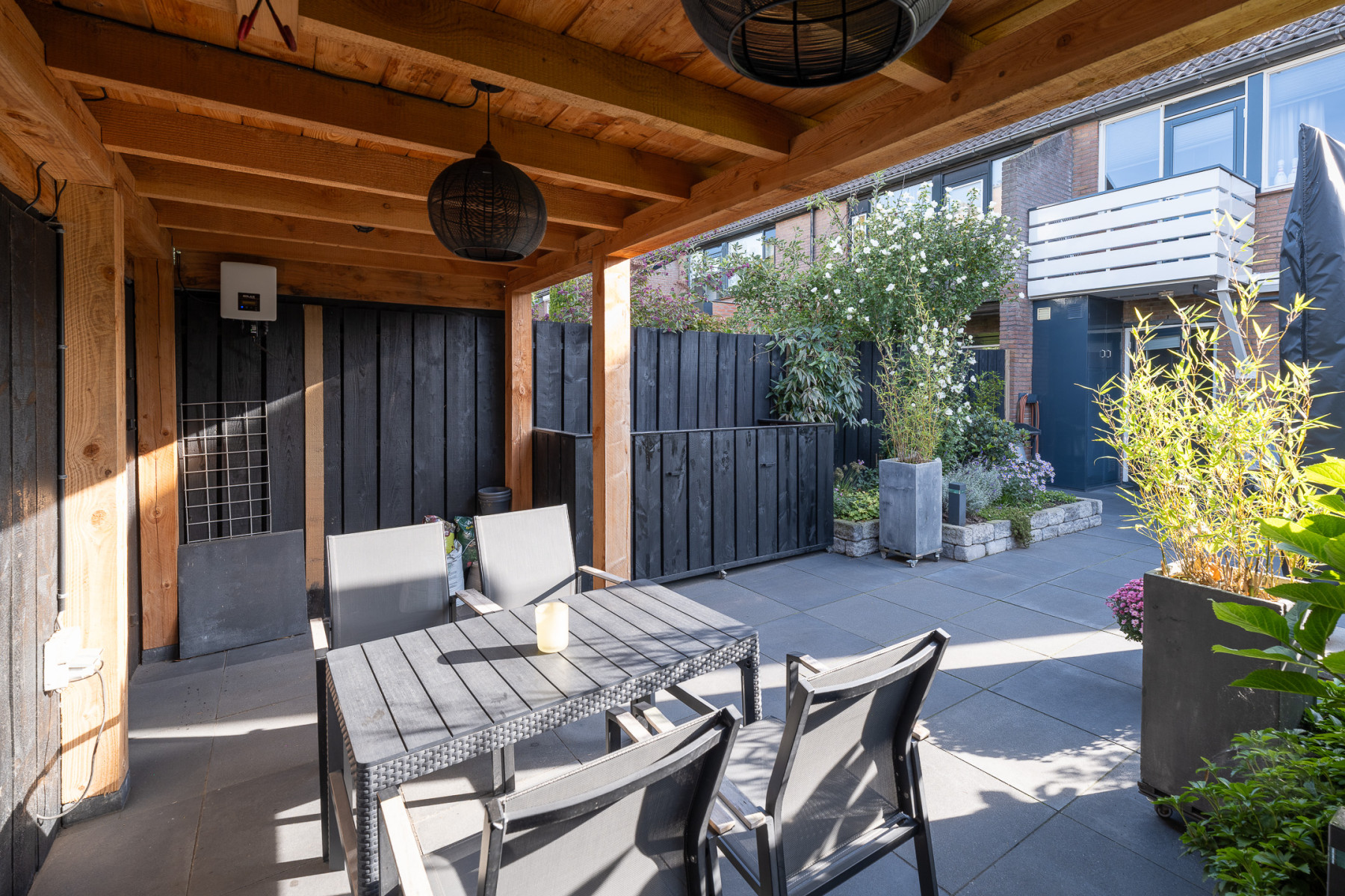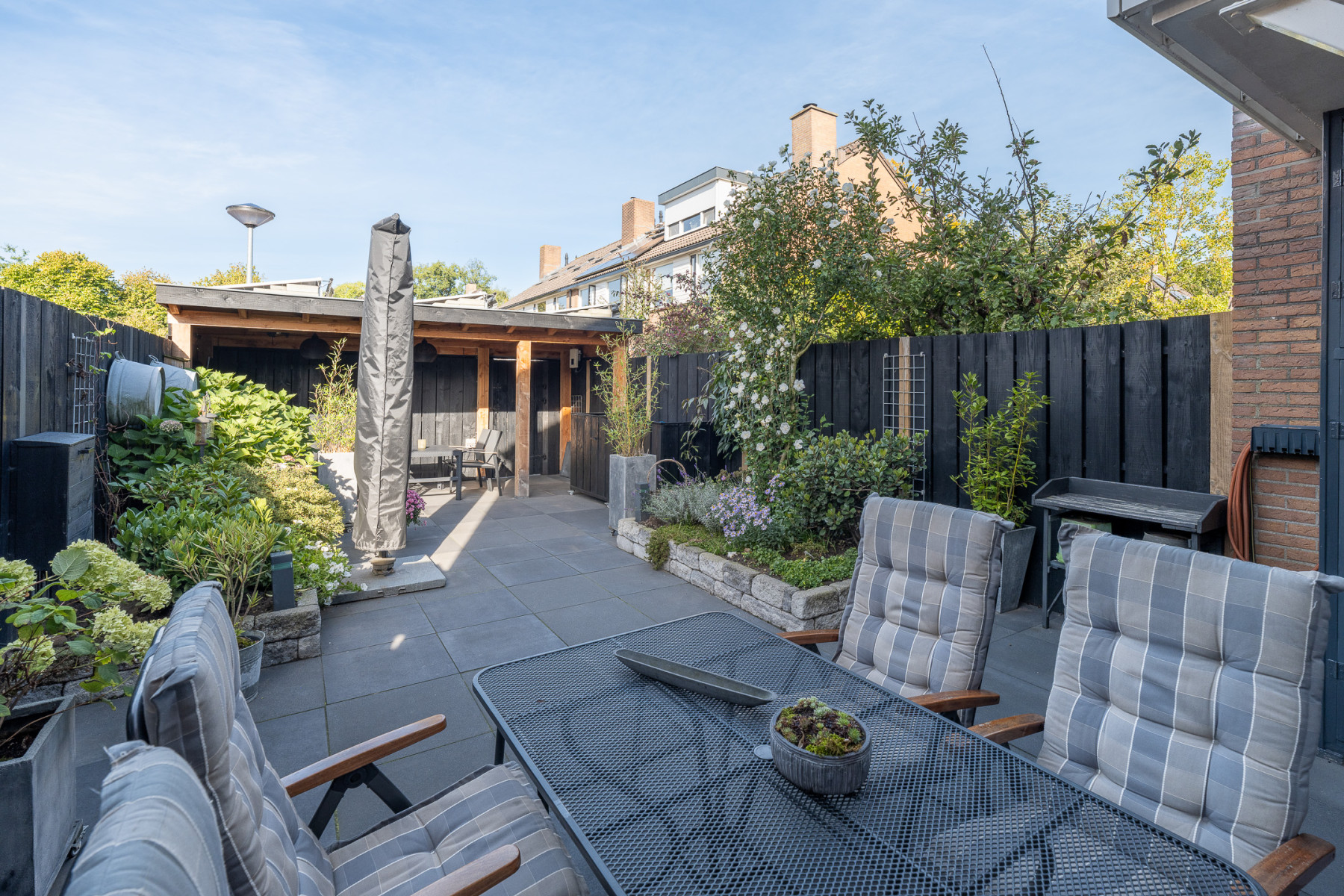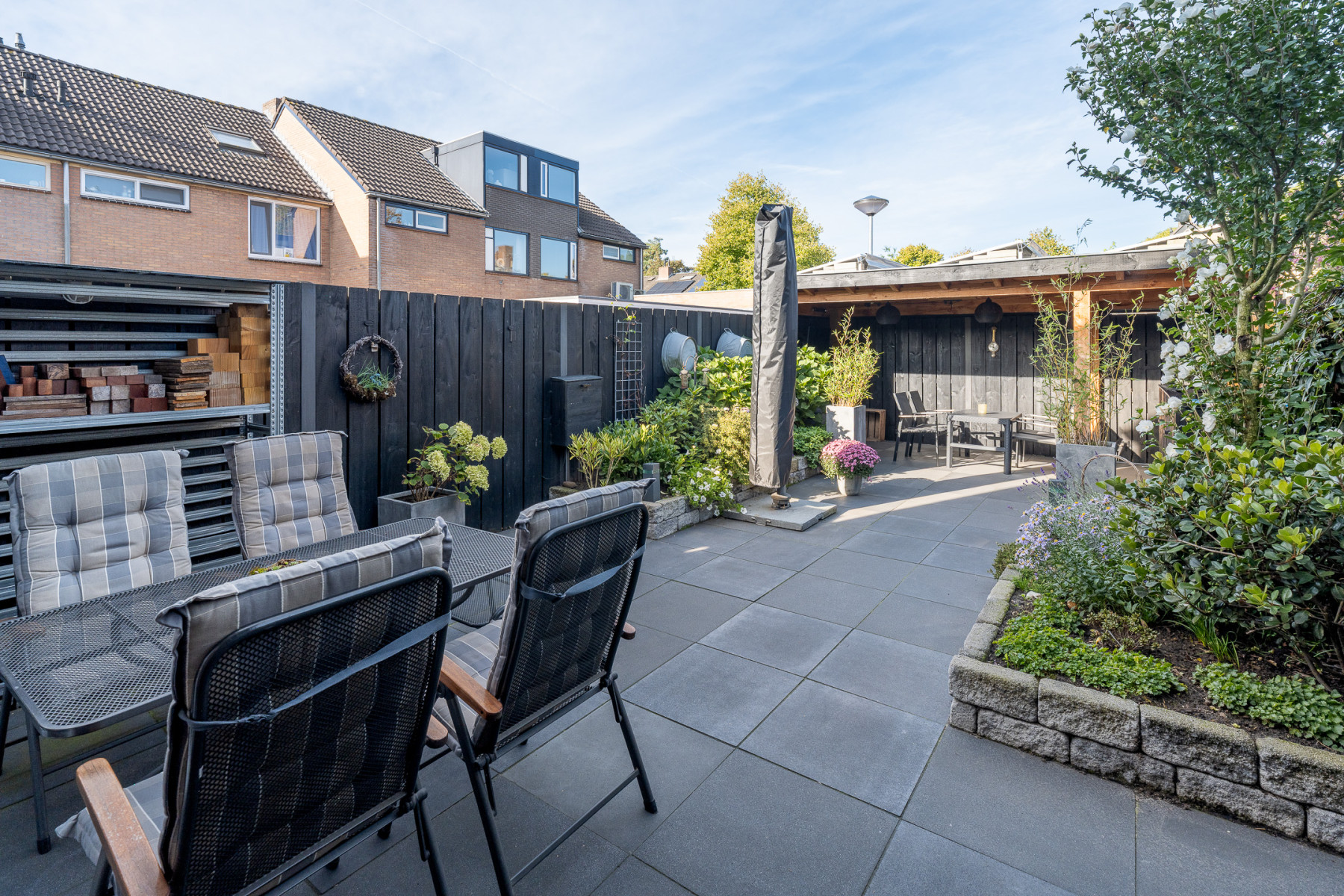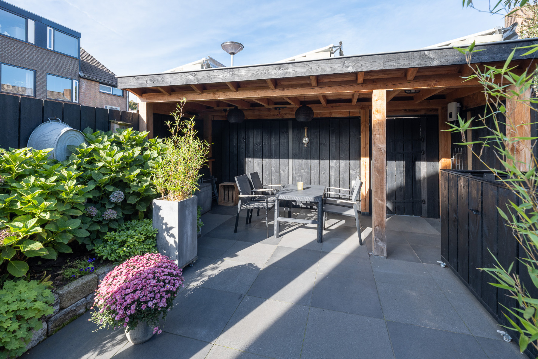 Een fijne achtertuin dat is elke zomer opnieuw genieten. In deze tuin beginnen we de dag onder de veranda met een kopje koffie én de ochtendzon. Later op de dag verplaatsen we ons naar het terras nabij de woning, hier kunt u de rest van de dag goed vertoeven in de zon. De tuin is aangelegd met een combinatie van bestrating en beplanting. Verder is de tuin ook te bereiken middels een eigen achterom.