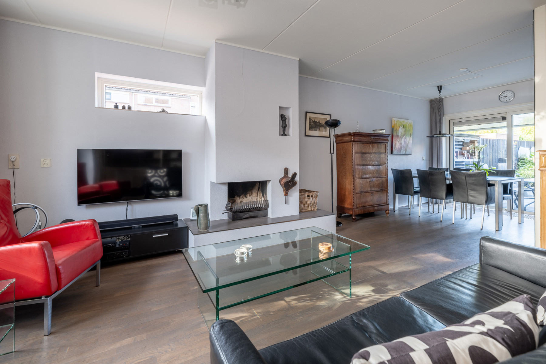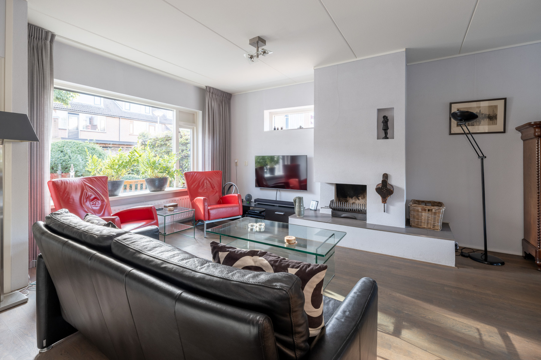 De woonkamer is een fijne, lichte ruimte met een eiken houten parketvloer en lichte wanden, een rustige basis. Aan de voorzijde vindt u een groot raampartij met een elektrisch bedienbaar rolluik, wat u extra privacy en comfort biedt. In de ruimte brengt de open haard extra sfeer én zorgt voor een fijne warmte in de wintermaanden. De vaste kastenwand geeft praktische bergruimte en in de woonkamer vindt u de trapopgang naar de eerste verdieping.