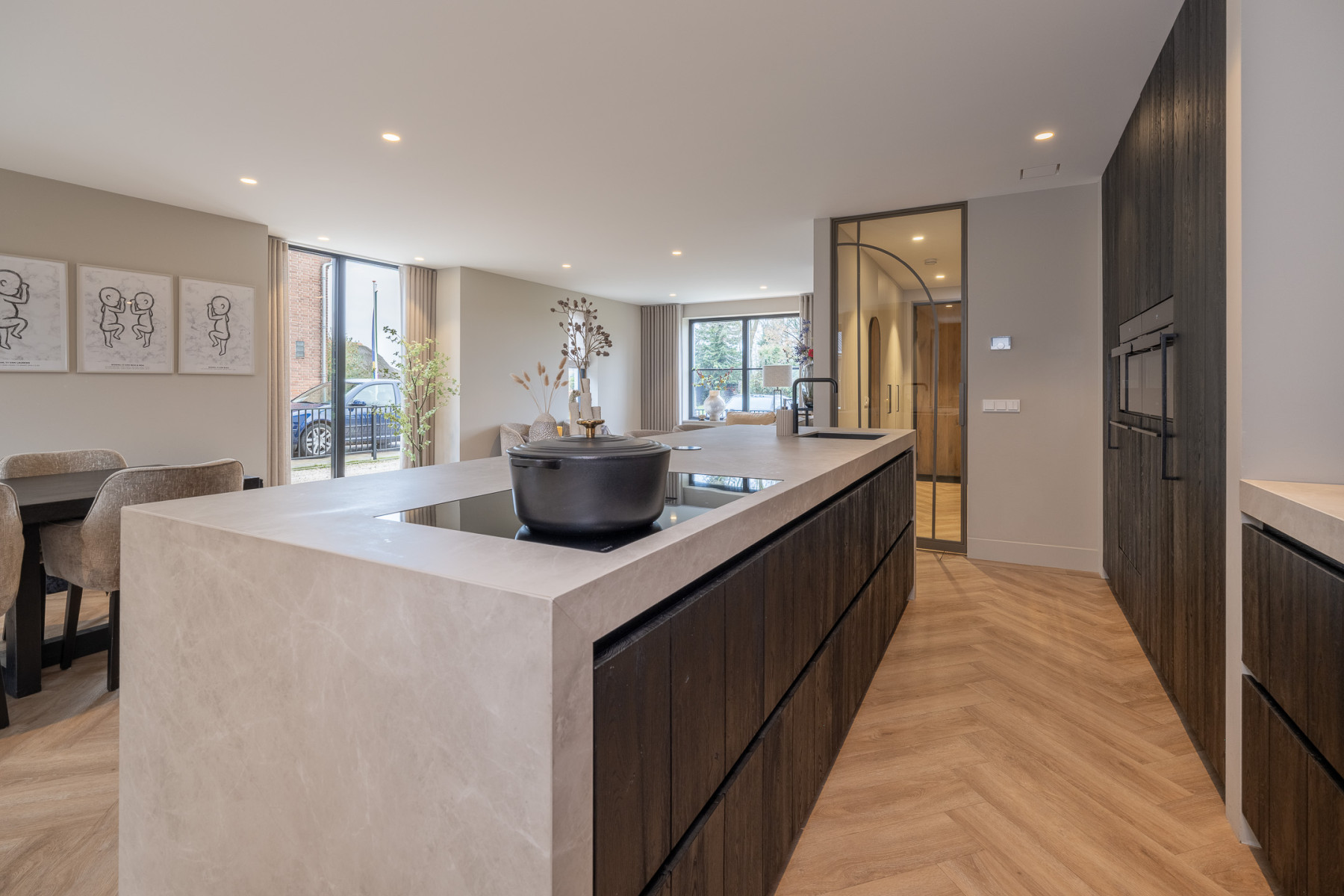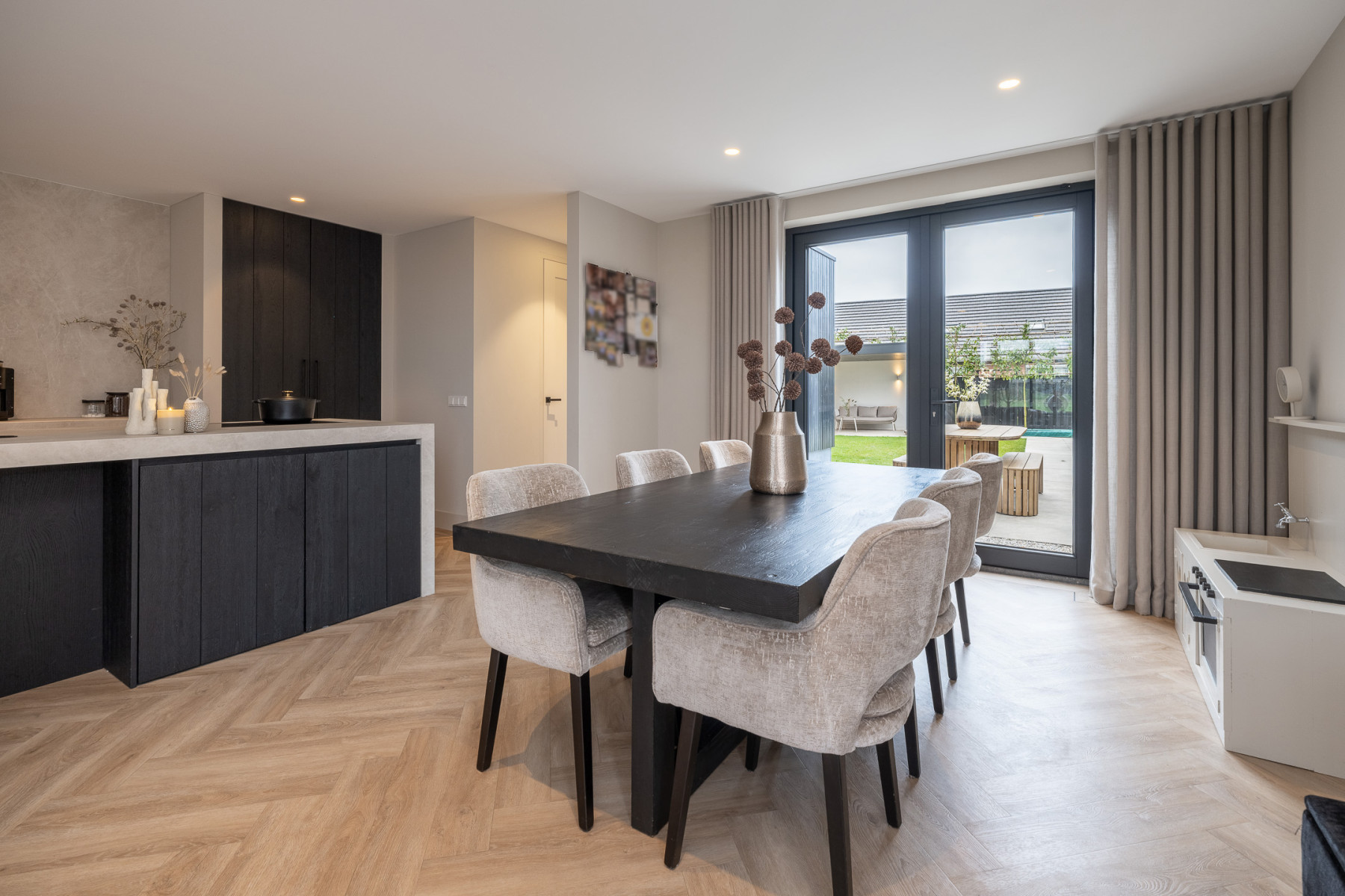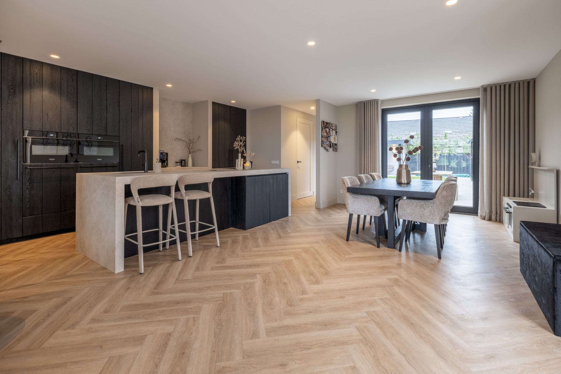 De keuken is strak vormgegeven, luxe uitgevoerd en hier geniet u van een waar kookgenot. De keuken is afgewerkt met eiken hout, wat zorgt voor een warme uitstraling. Het hart wordt gevormd door het kookeiland. Hier kookt u op een 4-pits inductiekookplaat met geïntegreerde afzuiging. Daarnaast is het eiland voorzien van een Quooker. Aan het eiland is een bar gecreëerd, een perfecte plek voor een snel ontbijt, een goed glas wijn of om gezellig tijdens het koken te kletsen met de kok. De vaste kastenwand maakt het geheel compleet met een ruime koelkast, een ruime vriezer, een combi-oven, een oven en een vaatwasmachine. Een keuken waar design en functionaliteit elkaar perfect aanvullen, klaar voor dagelijks gemak en culinair genieten! Nabij de keuken is er nog voldoende plek voor een eettafel. Verder vindt u hier openslaande deuren naar de tuin. Op mooie dagen kunt u deze fijn open zetten, zodat u gemakkelijk van binnen naar buiten loopt.