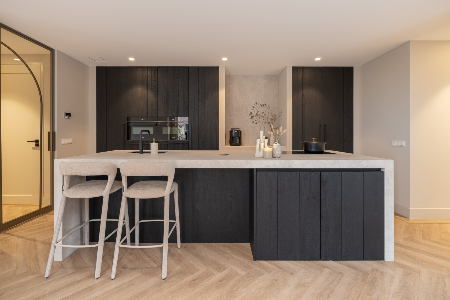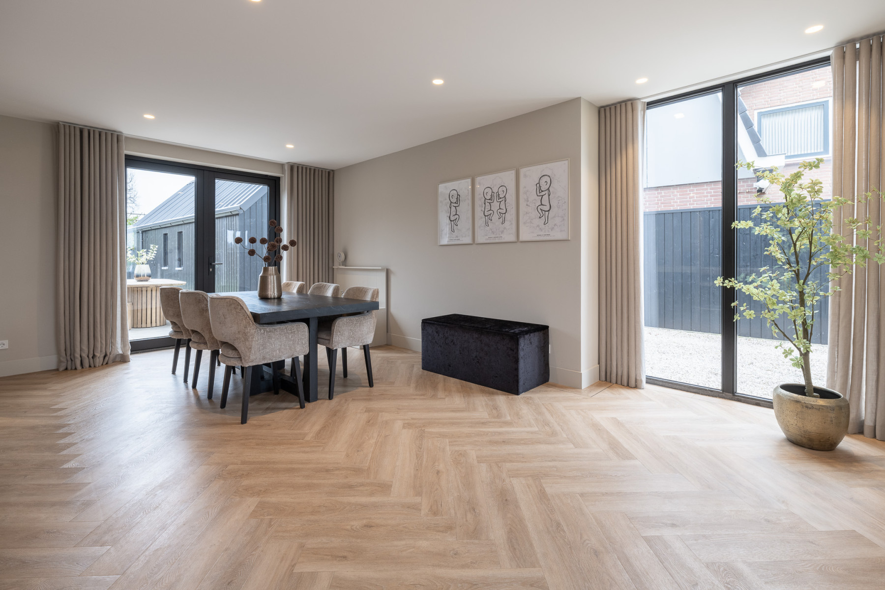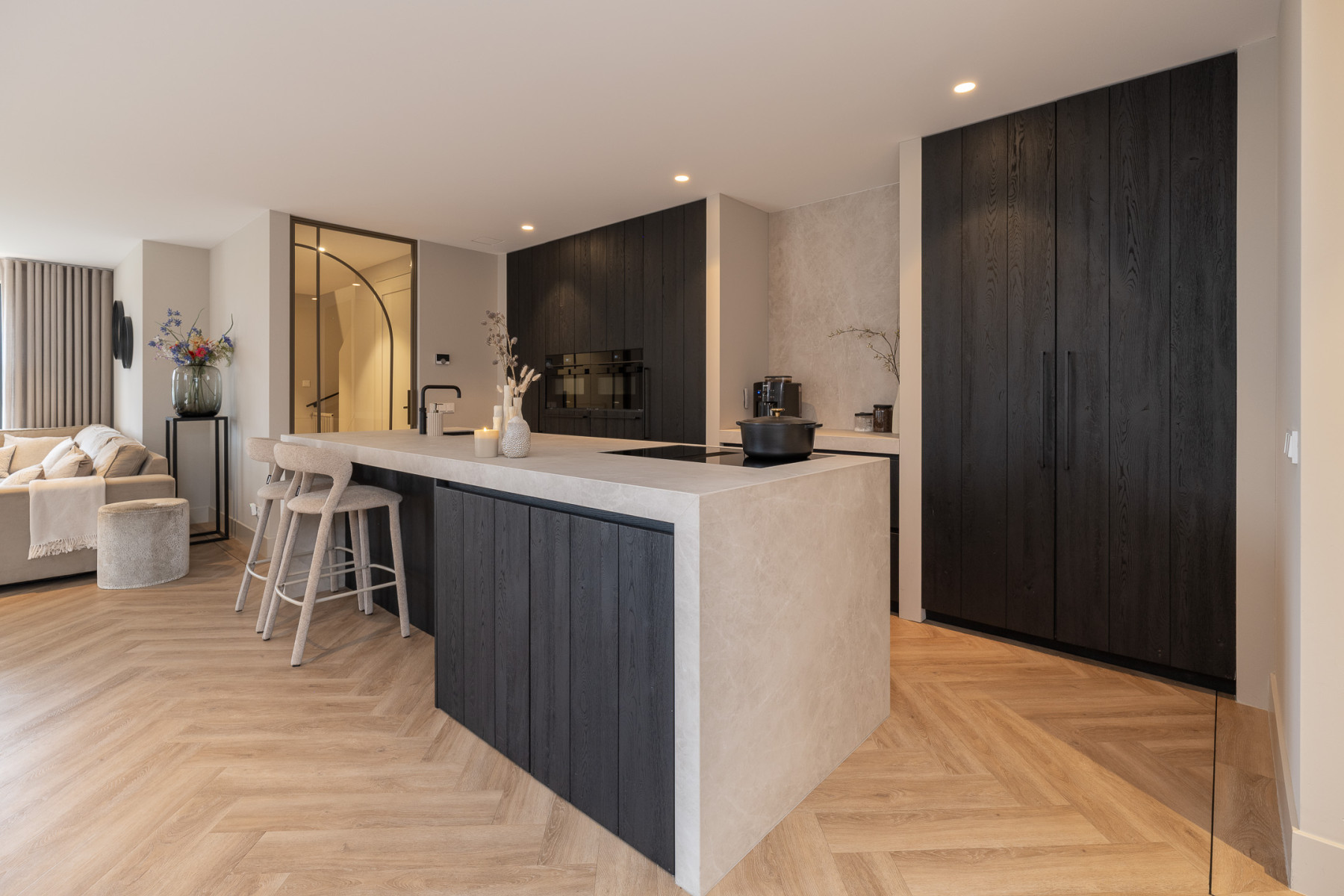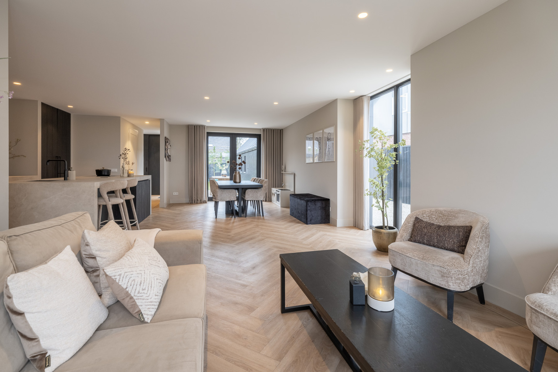 De keuken is strak vormgegeven, luxe uitgevoerd en hier geniet u van een waar kookgenot. De keuken is afgewerkt met eiken hout, wat zorgt voor een warme uitstraling. Het hart wordt gevormd door het kookeiland. Hier kookt u op een 4-pits inductiekookplaat met geïntegreerde afzuiging. Daarnaast is het eiland voorzien van een Quooker. Aan het eiland is een bar gecreëerd, een perfecte plek voor een snel ontbijt, een goed glas wijn of om gezellig tijdens het koken te kletsen met de kok. De vaste kastenwand maakt het geheel compleet met een ruime koelkast, een ruime vriezer, een combi-oven, een oven en een vaatwasmachine. Een keuken waar design en functionaliteit elkaar perfect aanvullen, klaar voor dagelijks gemak en culinair genieten! Nabij de keuken is er nog voldoende plek voor een eettafel. Verder vindt u hier openslaande deuren naar de tuin. Op mooie dagen kunt u deze fijn open zetten, zodat u gemakkelijk van binnen naar buiten loopt.