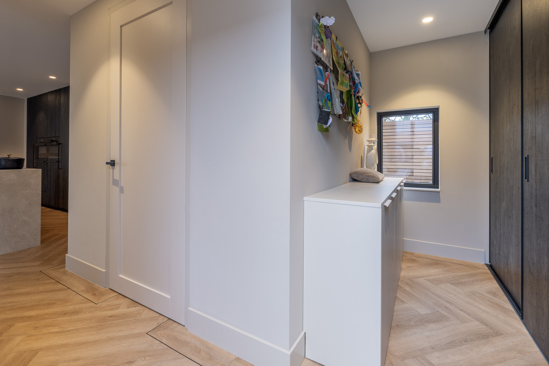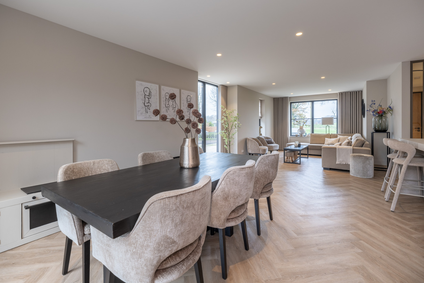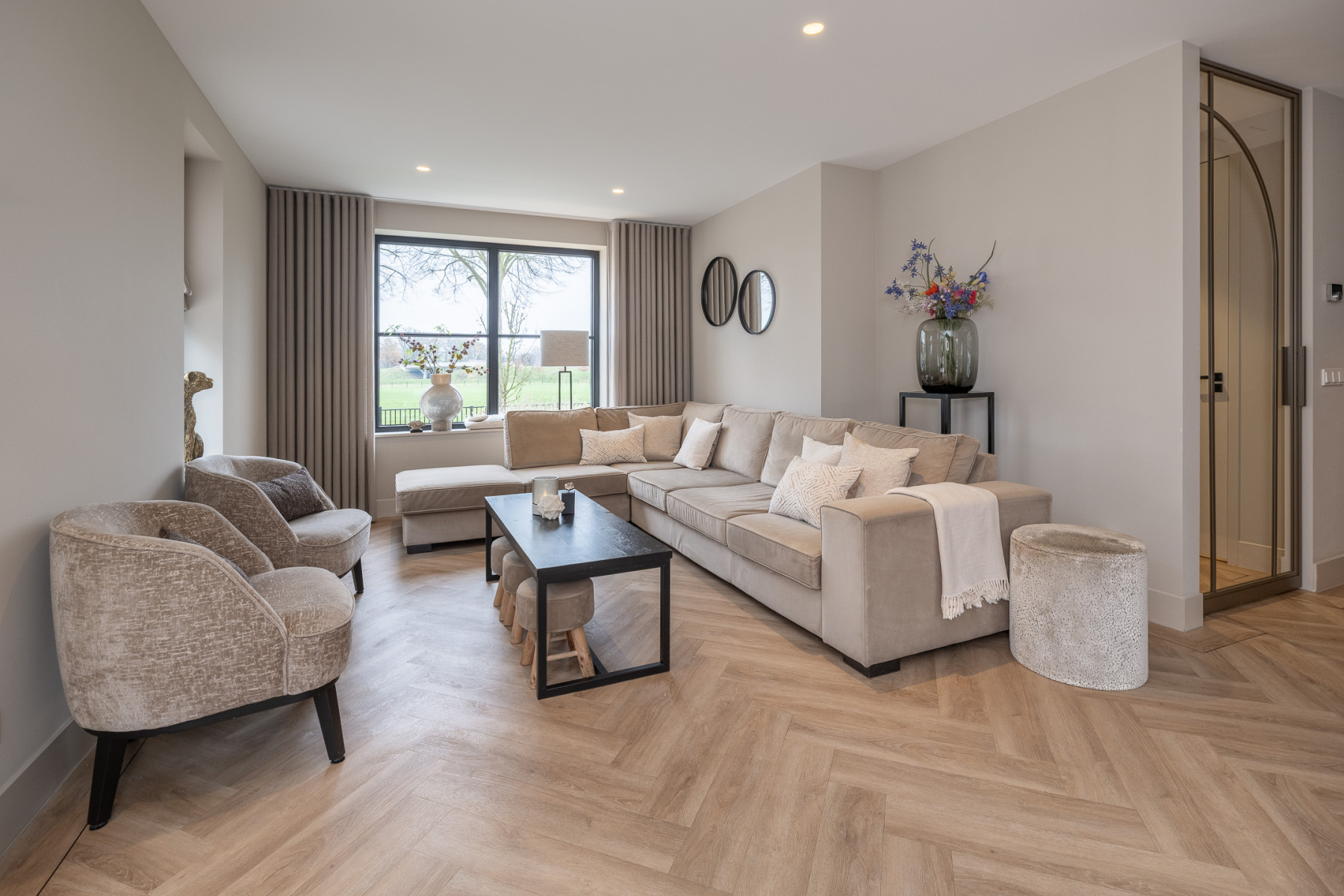 De woonkamer is een ruimte waar u direct ziet dat alles met zorg is gedaan. Een strak gestuukt plafond, een prachtige PVC-visgraatvloer en lichte wanden zorgen voor een rustige basis met een frisse uitstraling. Aan de voorkant is een groot raampartij. Vanuit uw stoel of vanaf de bank geniet u van het mooie uitzicht over de weilanden. Daarbij valt er veel daglicht naar binnen door het raampartij.