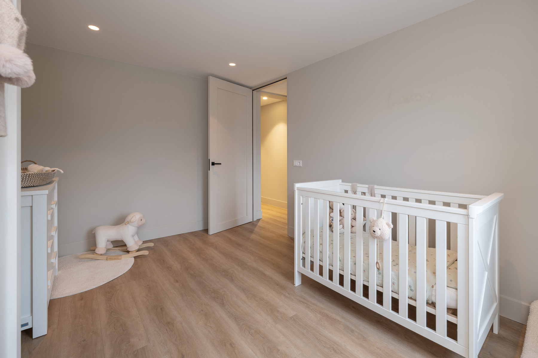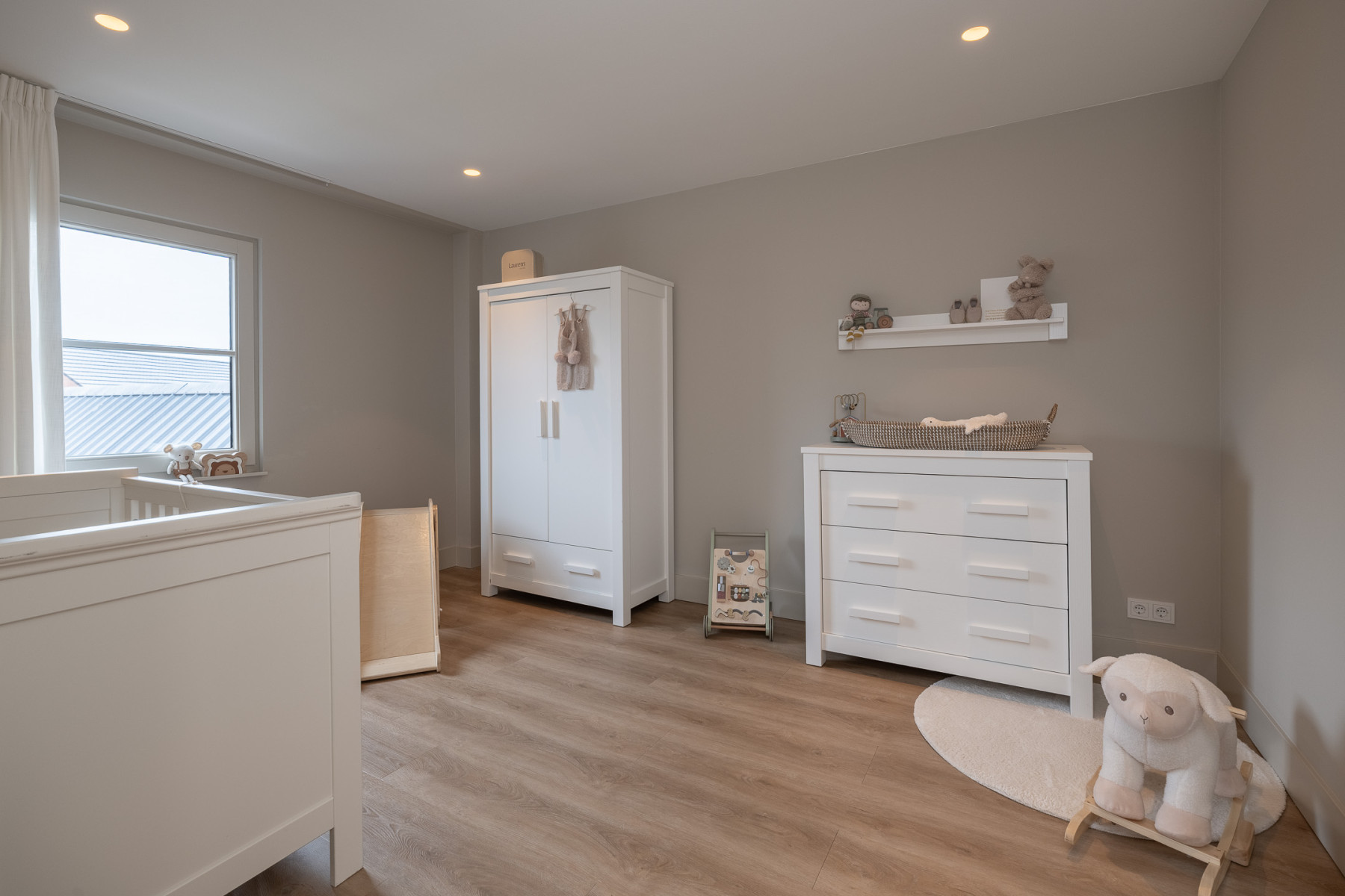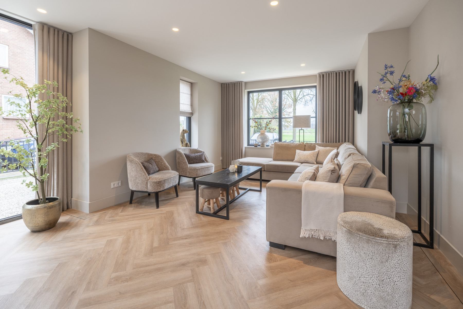 De woonkamer is een ruimte waar u direct ziet dat alles met zorg is gedaan. Een strak gestuukt plafond, een prachtige PVC-visgraatvloer en lichte wanden zorgen voor een rustige basis met een frisse uitstraling. Aan de voorkant is een groot raampartij. Vanuit uw stoel of vanaf de bank geniet u van het mooie uitzicht over de weilanden. Daarbij valt er veel daglicht naar binnen door het raampartij.