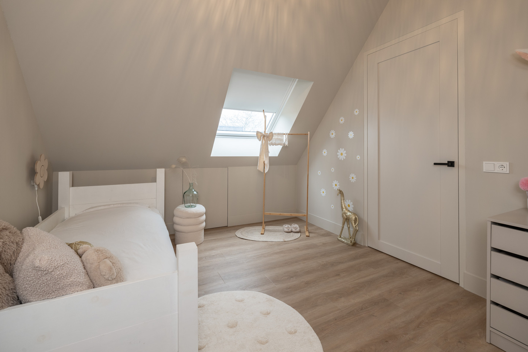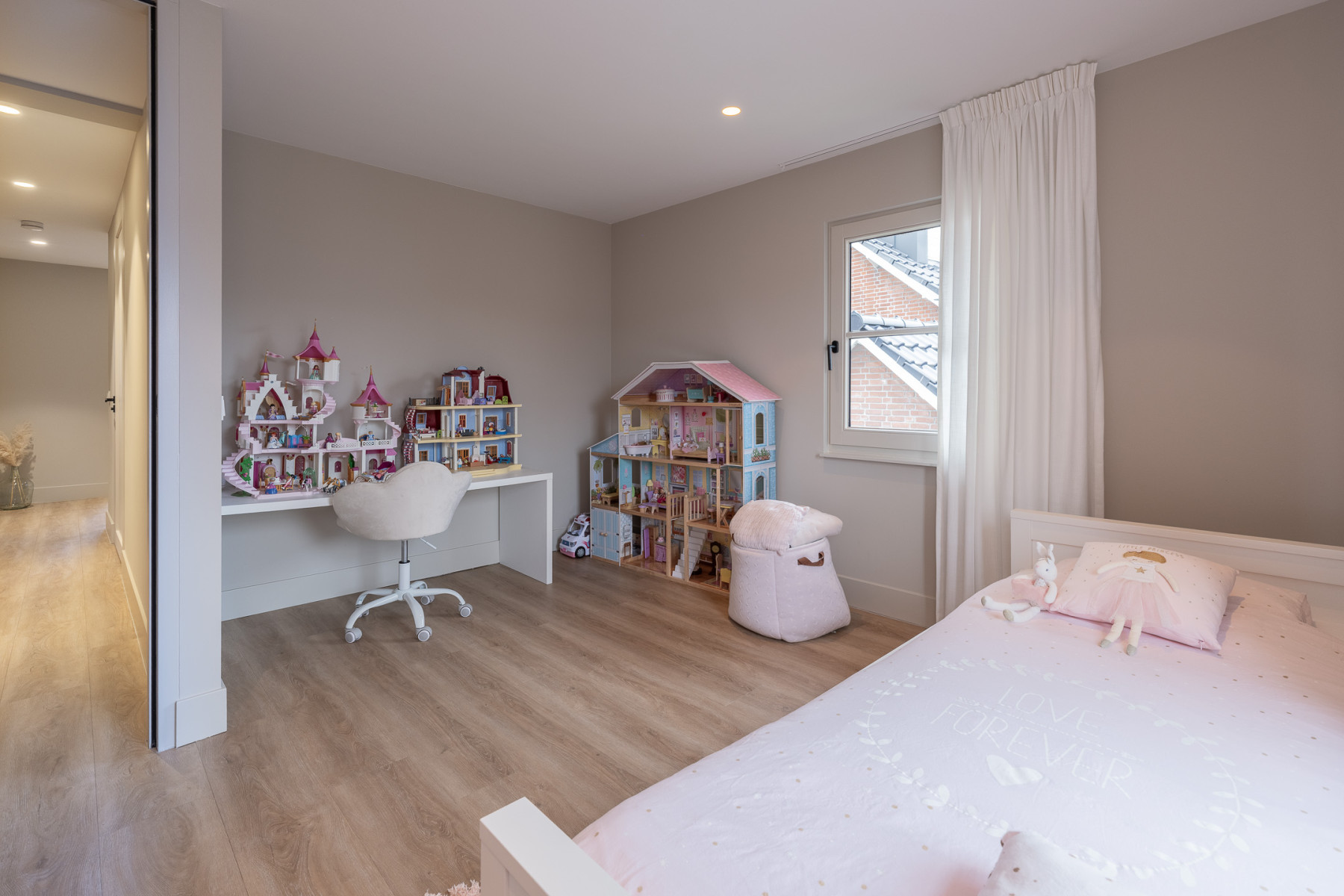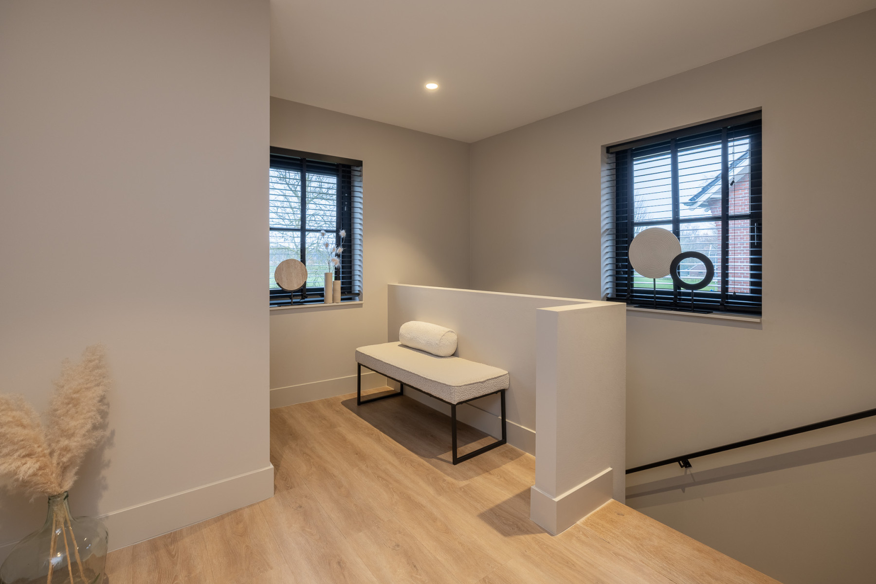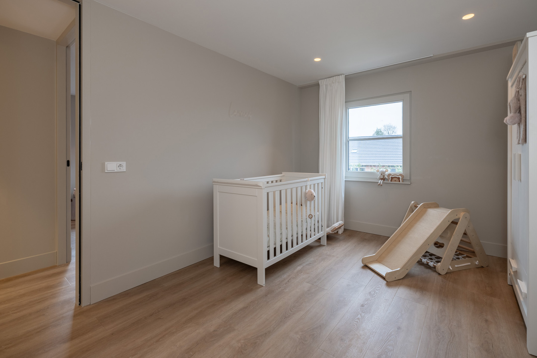 De eikenhouten trap met een stalen trapleuning brengt u op de eerste verdieping. Vanaf de overloop loopt u zo naar drie fijne slaapkamers en de badkamer. Alle slaapkamers zijn keurig en modern afgewerkt met een pvc-vloer, lichte wanden en een gestuukt plafond. U hoeft hier echt niets meer te doen. Spullen neerzetten, bed opmaken en klaar.