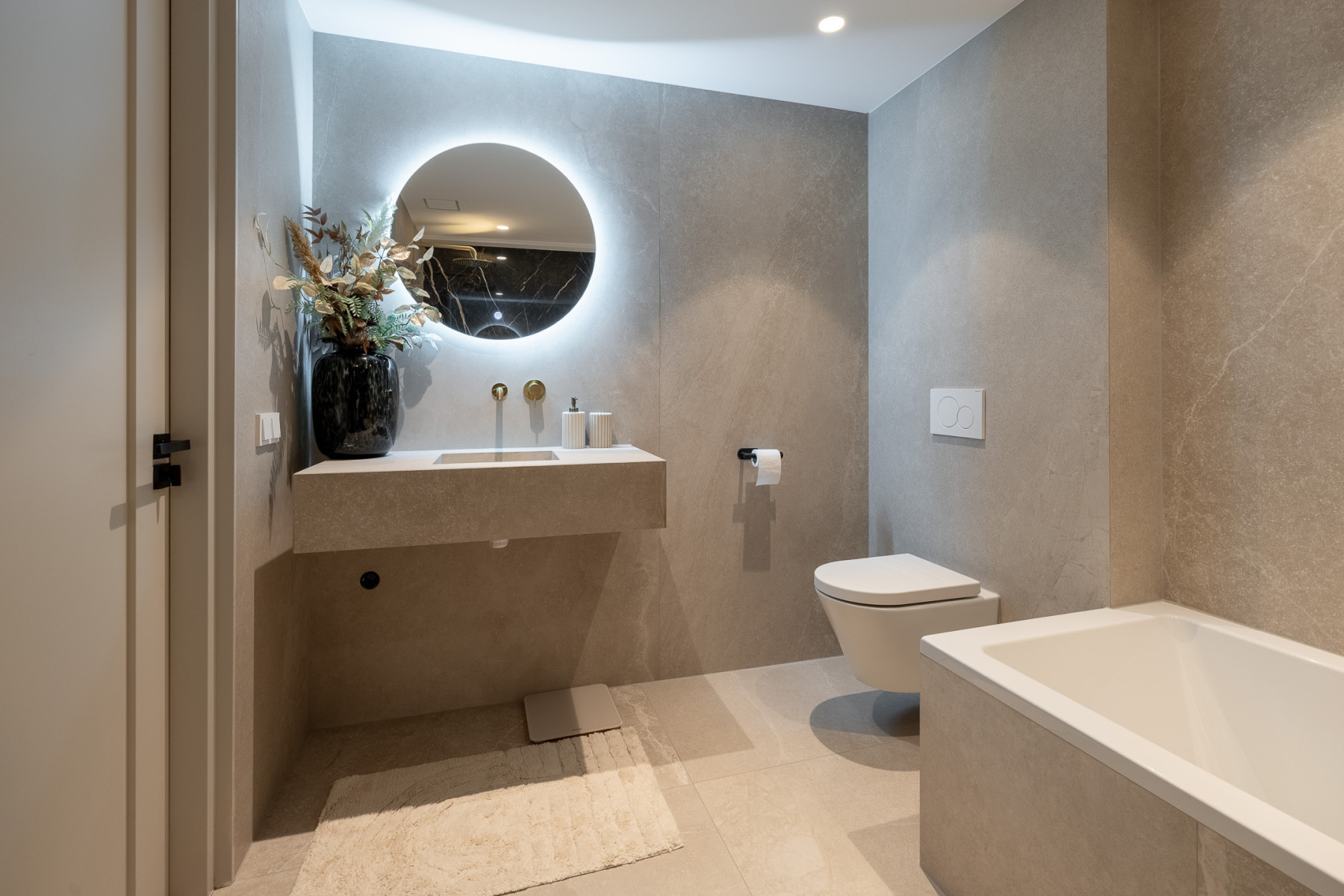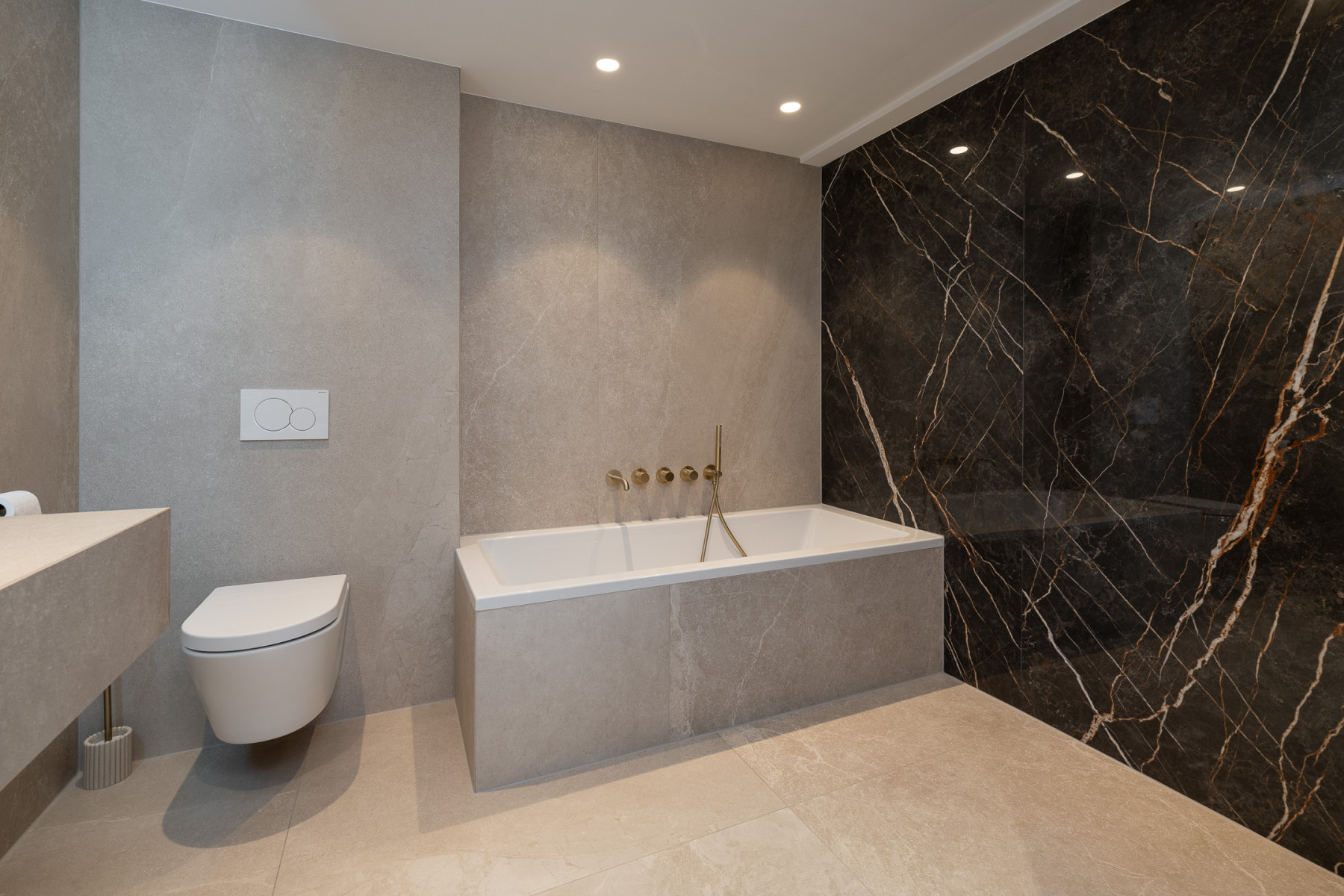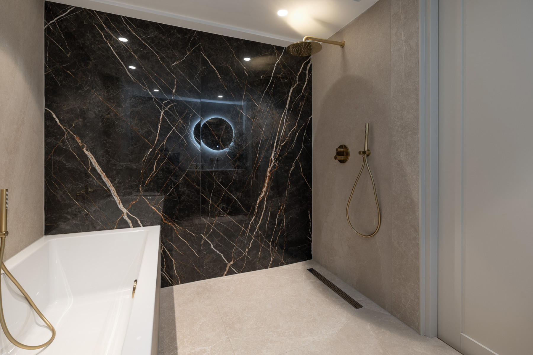 Ligbad, toilet, wastafel, inloopdouche en vloerverwarming