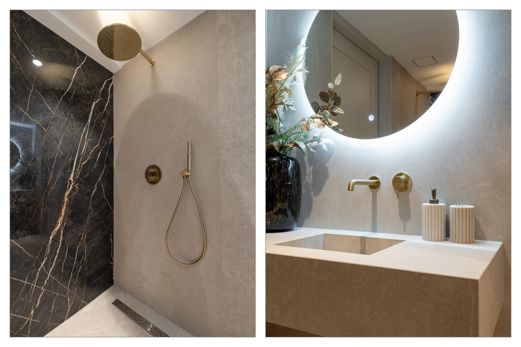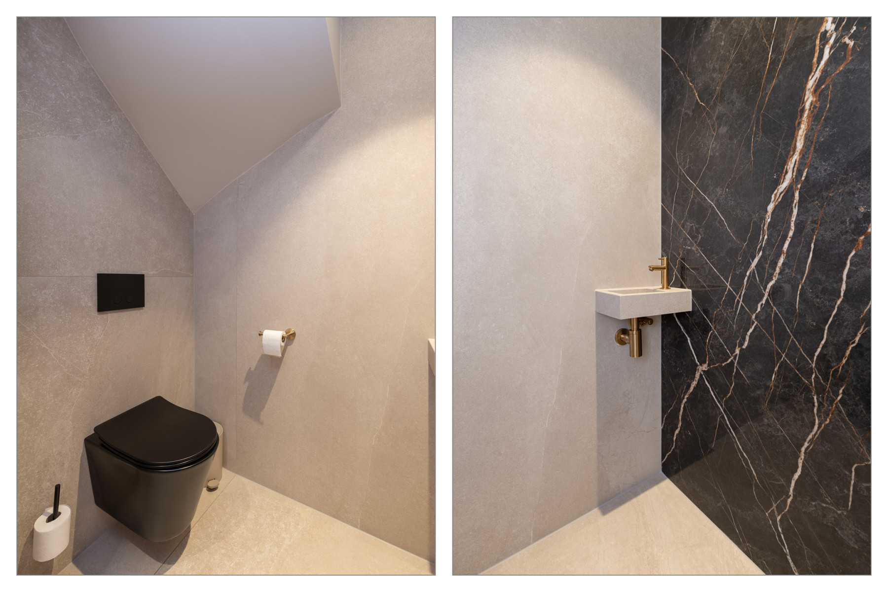 Deze hoogwaardige badkamer is een echte eyecatcher en biedt alle comfort die u mag verwachten. De ruimte is modern afgewerkt met twee prachtige marmerenlook tegels en gouden details, wat zorgt voor een luxe sfeer. In de badkamer treft u aan de rechterzijde een inloopdouche met een regendouche, vervolgens vinden we er een ligbad met gouden kranen, een toilet, een spiegel met verlichting en een wastafel met een gouden kraan. Een leuk detail; de wastafel is van hetzelfde materiaal als de tegel. Dit zorgt voor eenheid in de ruimte. Strak, sfeervol en compleet; dat kunnen we met recht zeggen van deze badkamer.