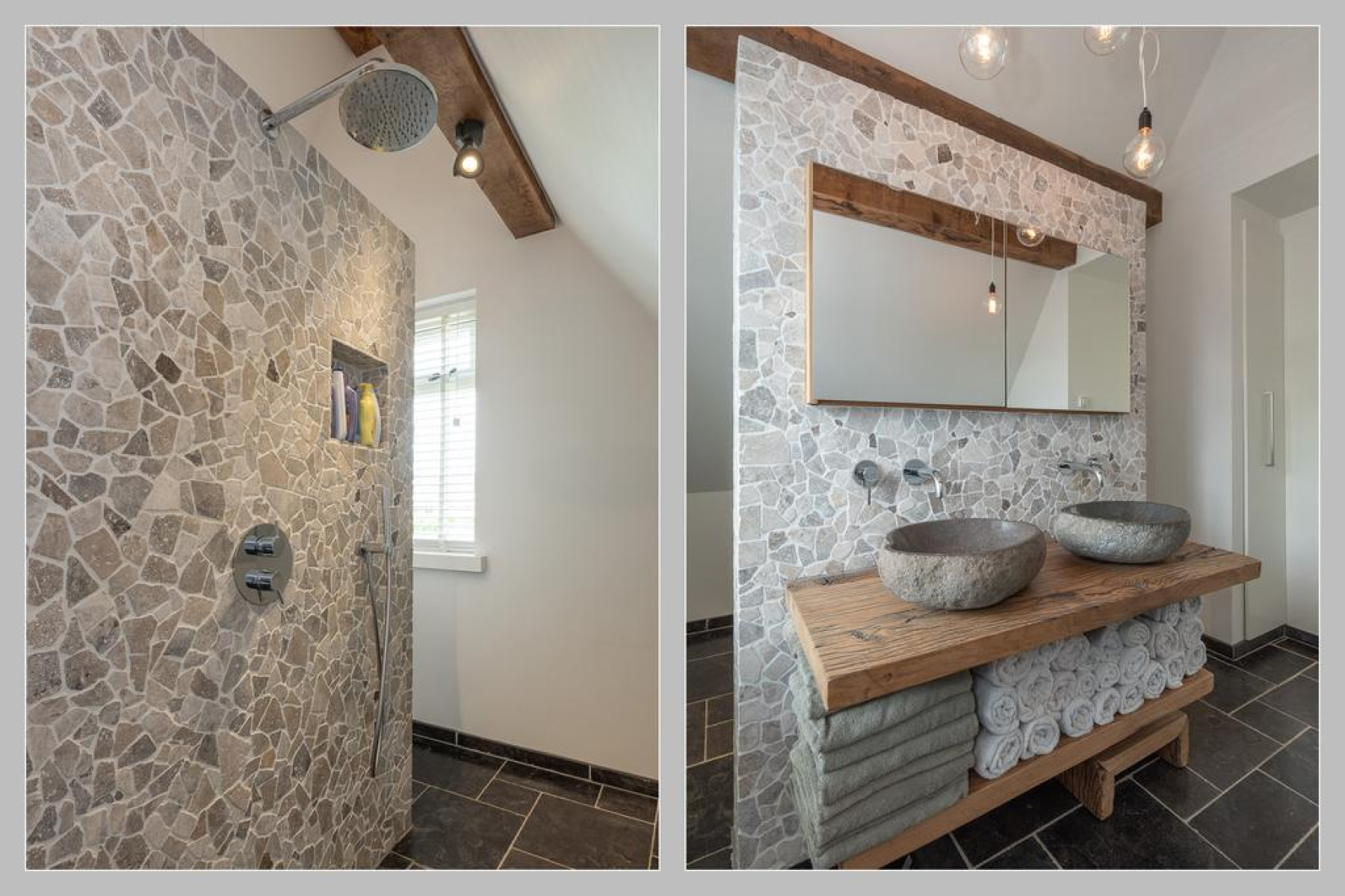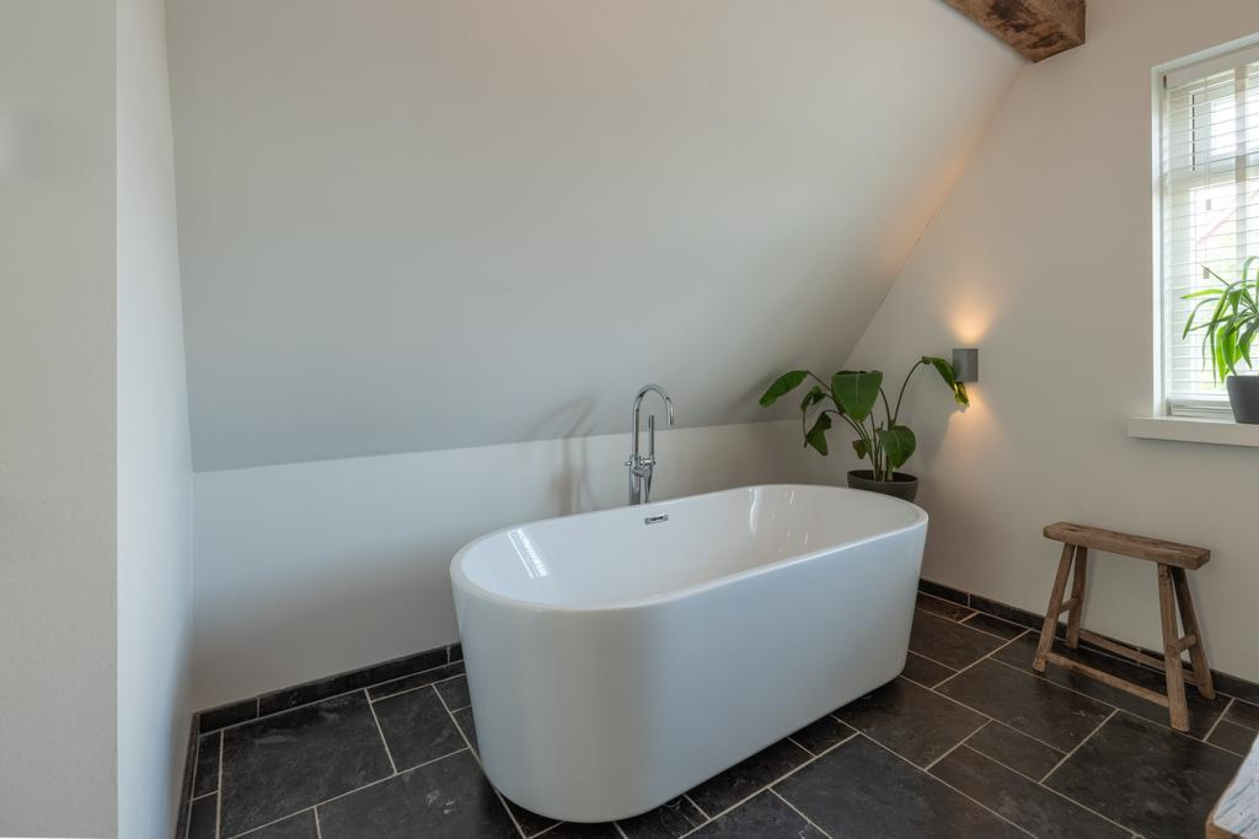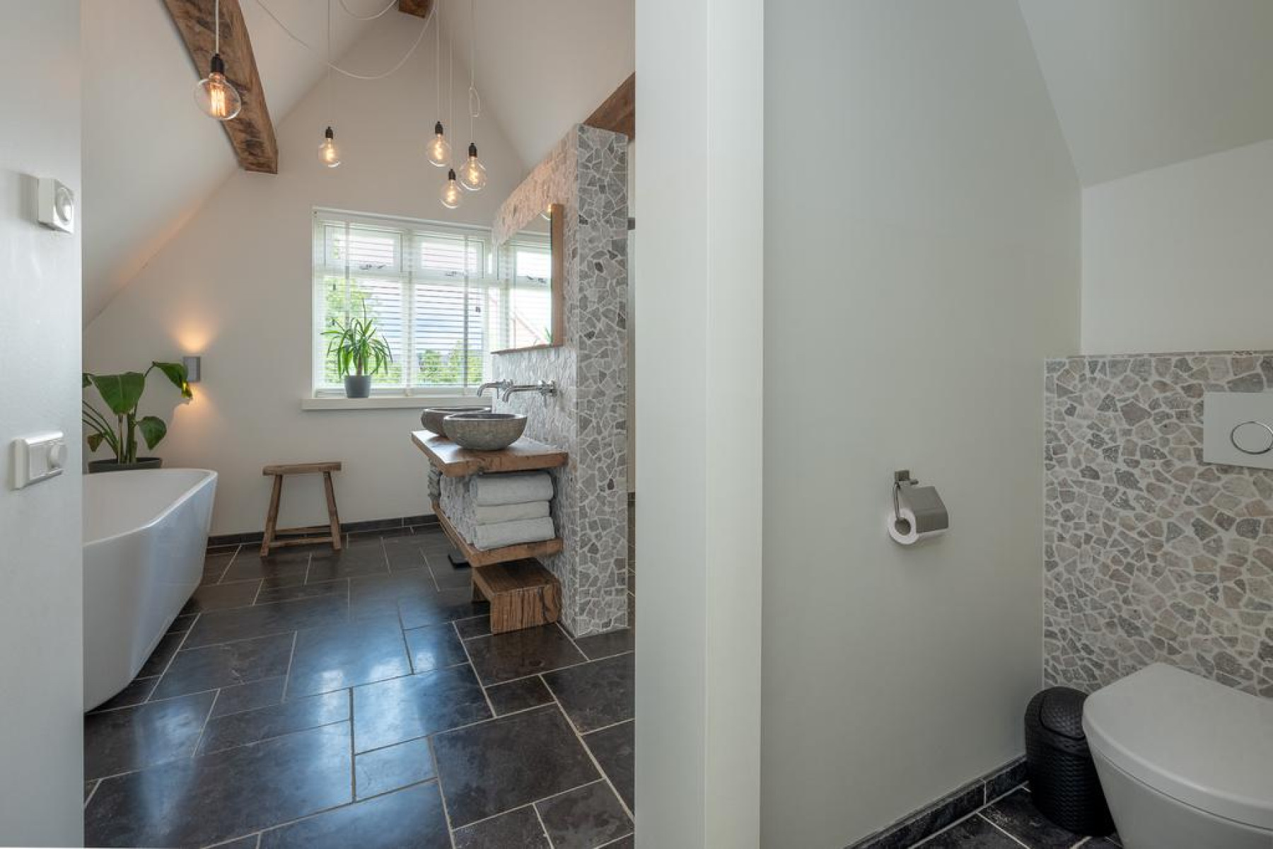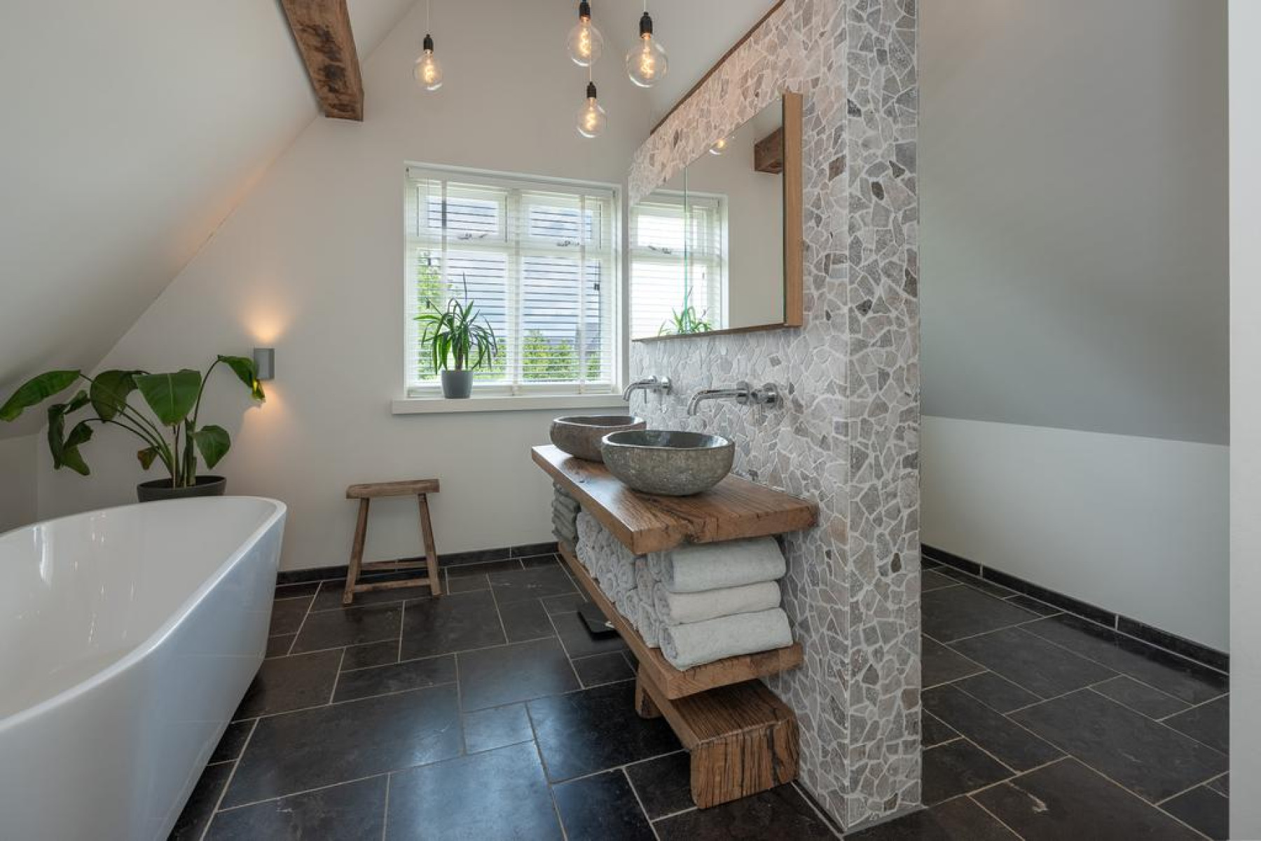 Ligbad, toilet, douche, dubbele wastafel, wastafelmeubel en vloerverwarming