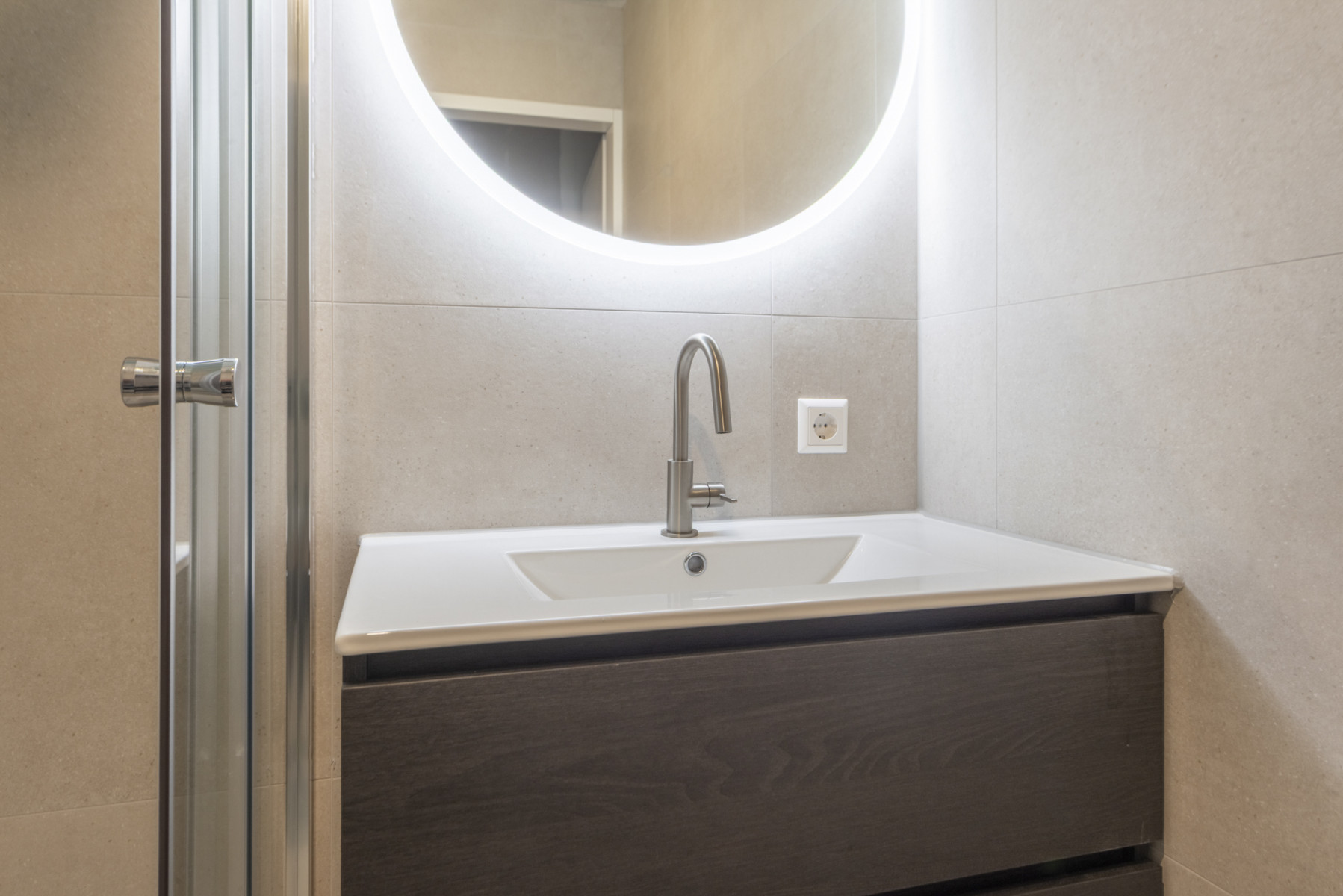 wastafel en een spiegel met verlichting. Compleet en voorzien van alle gemakken!