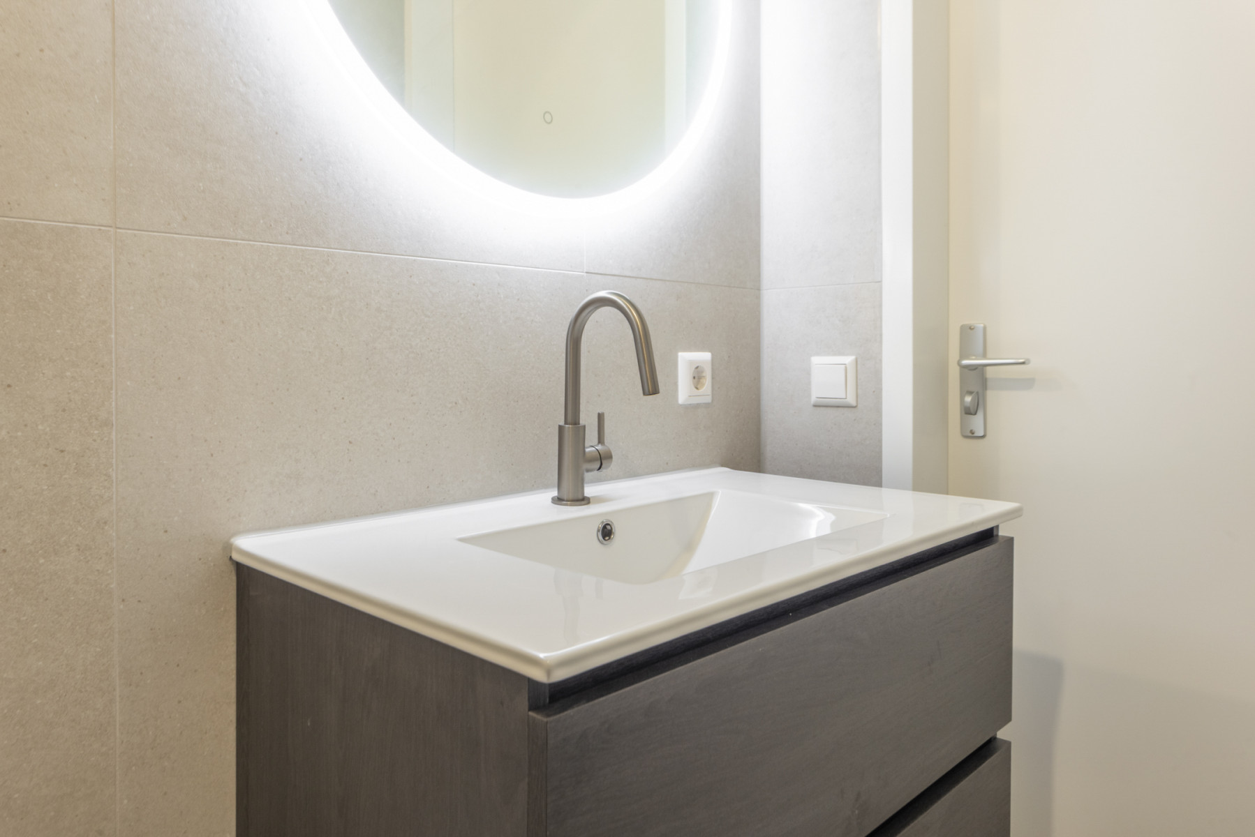 wastafel en een spiegel met verlichting. Compleet en voorzien van alle gemakken!
