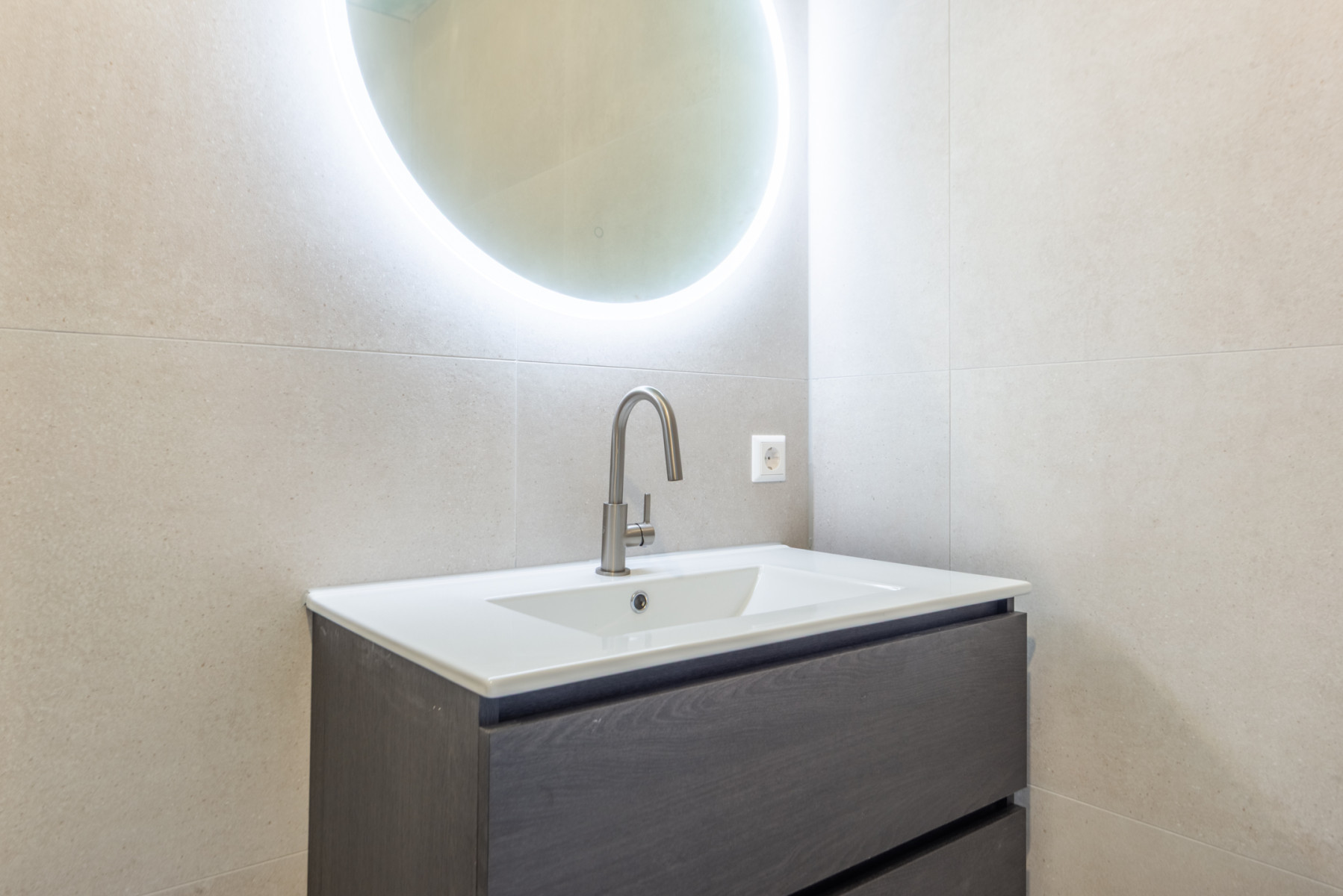 wastafel en een spiegel met verlichting. Compleet en voorzien van alle gemakken!
