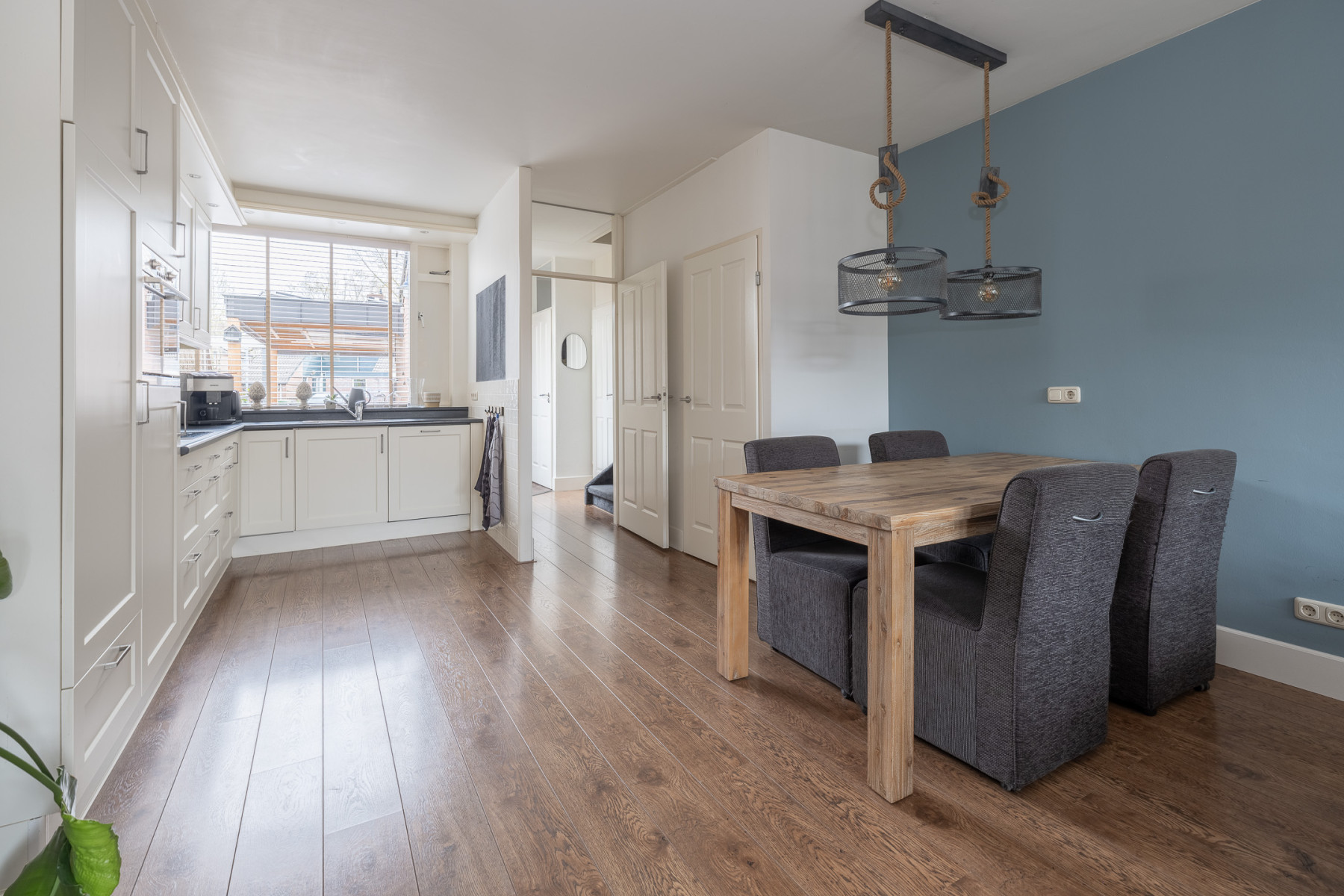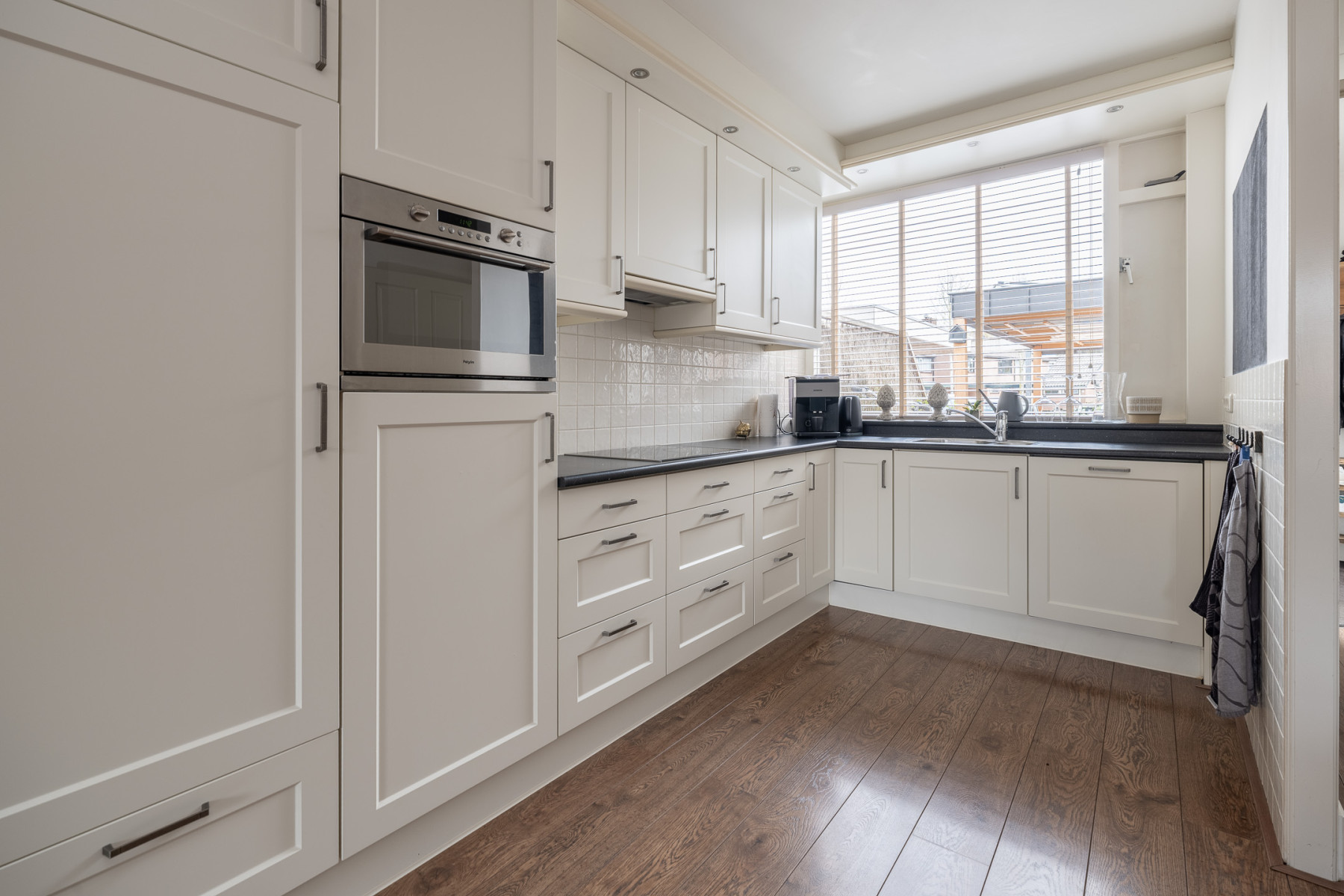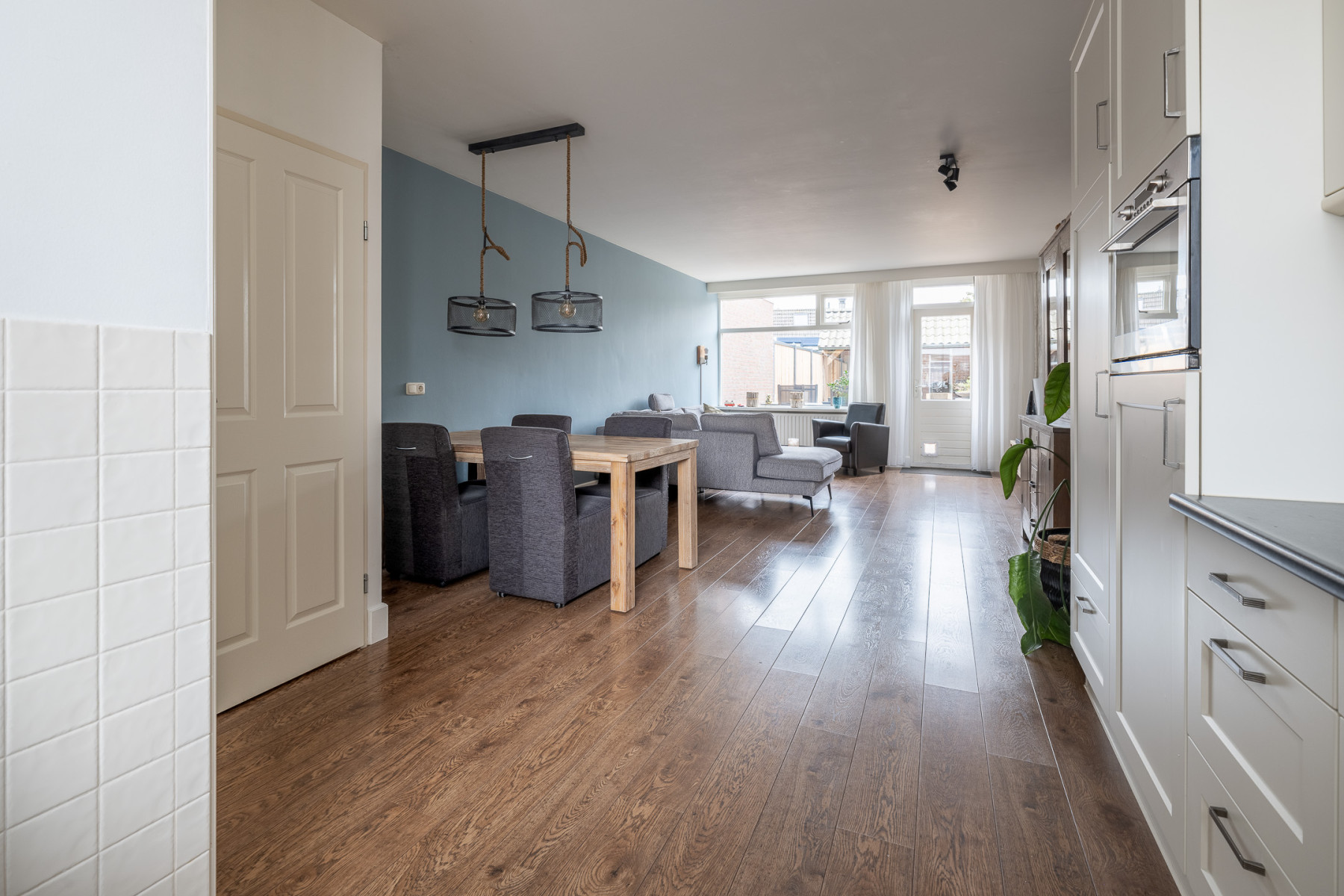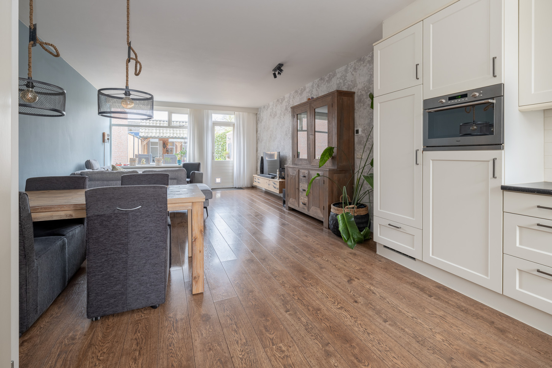 De keuken is aan de voorzijde gerealiseerd, wat ervoor zorgt dat u tijdens het koken leuk wegkijkt over de straat. Verder is de keuken ruim opgesteld en beschikt u hier over veel werk- en bergruimte. Ook alle nodige inbouwapparatuur is aanwezig. Zo vindt u hier een 4-pits keramische kookplaat, een afzuigkap, een combi-oven, een vaatwasser, koelkast en een vriezer. Kiest u voor een uitgebreid diner of voor een snelle maaltijd? Alles is mogelijk.