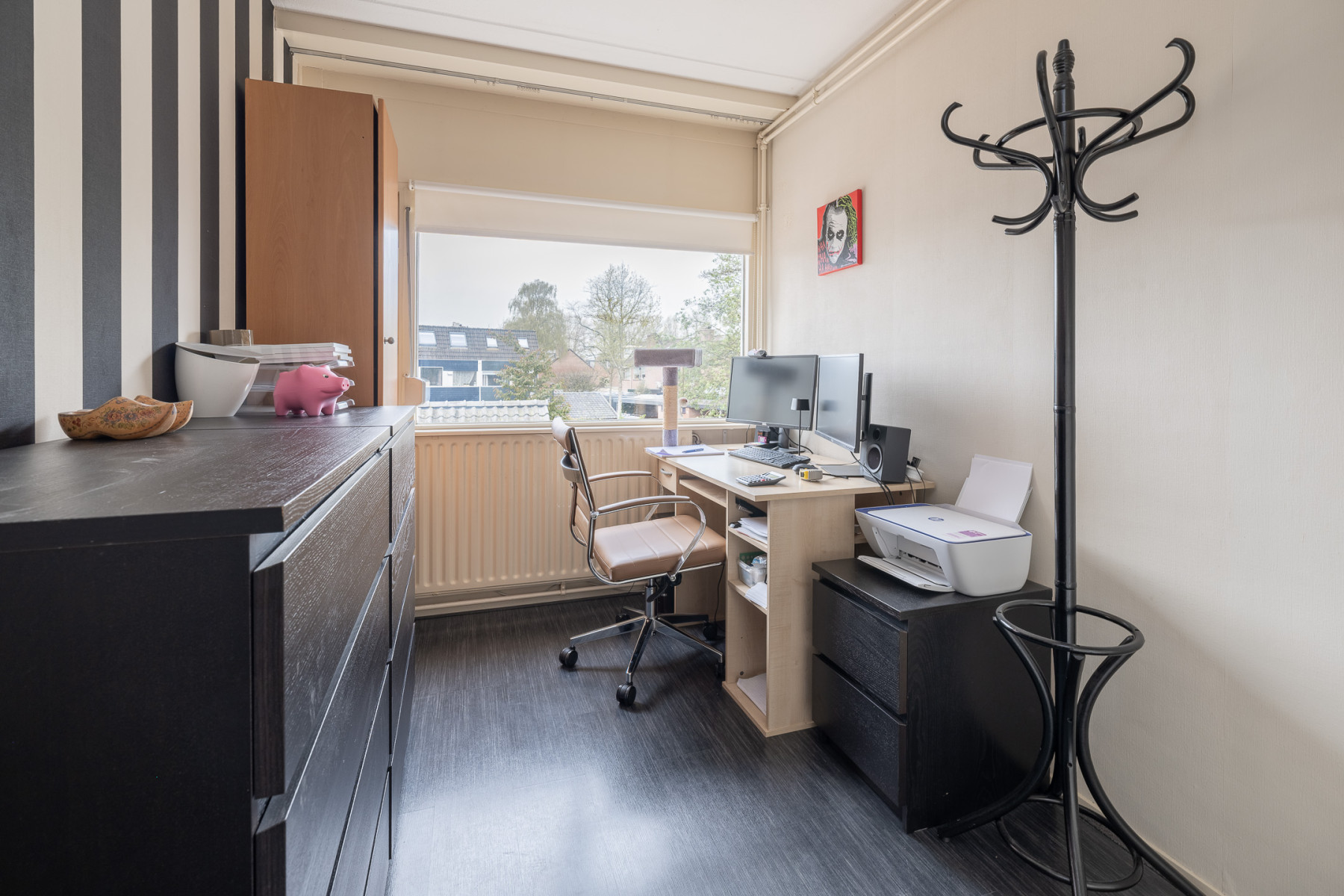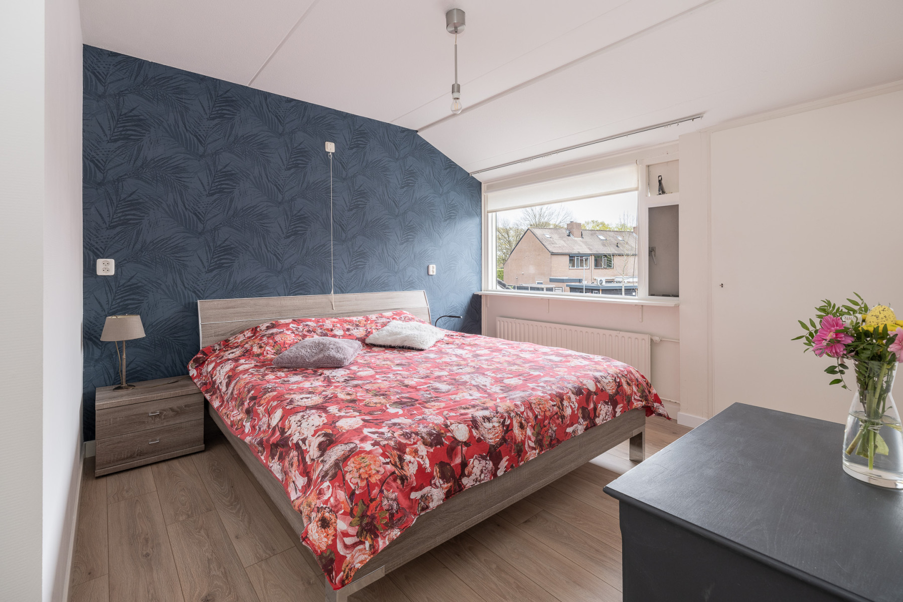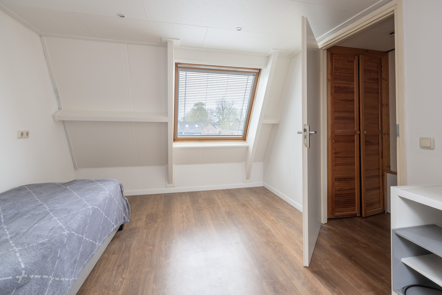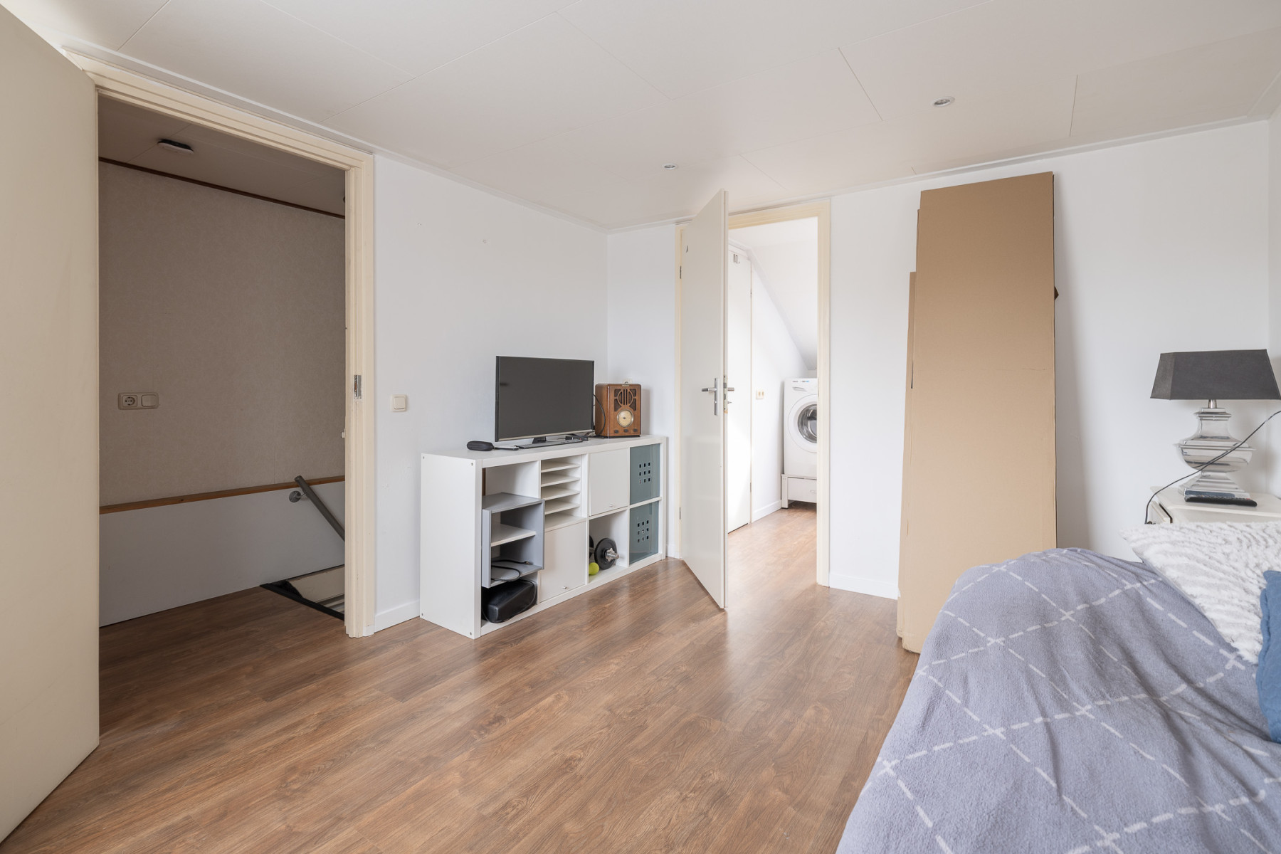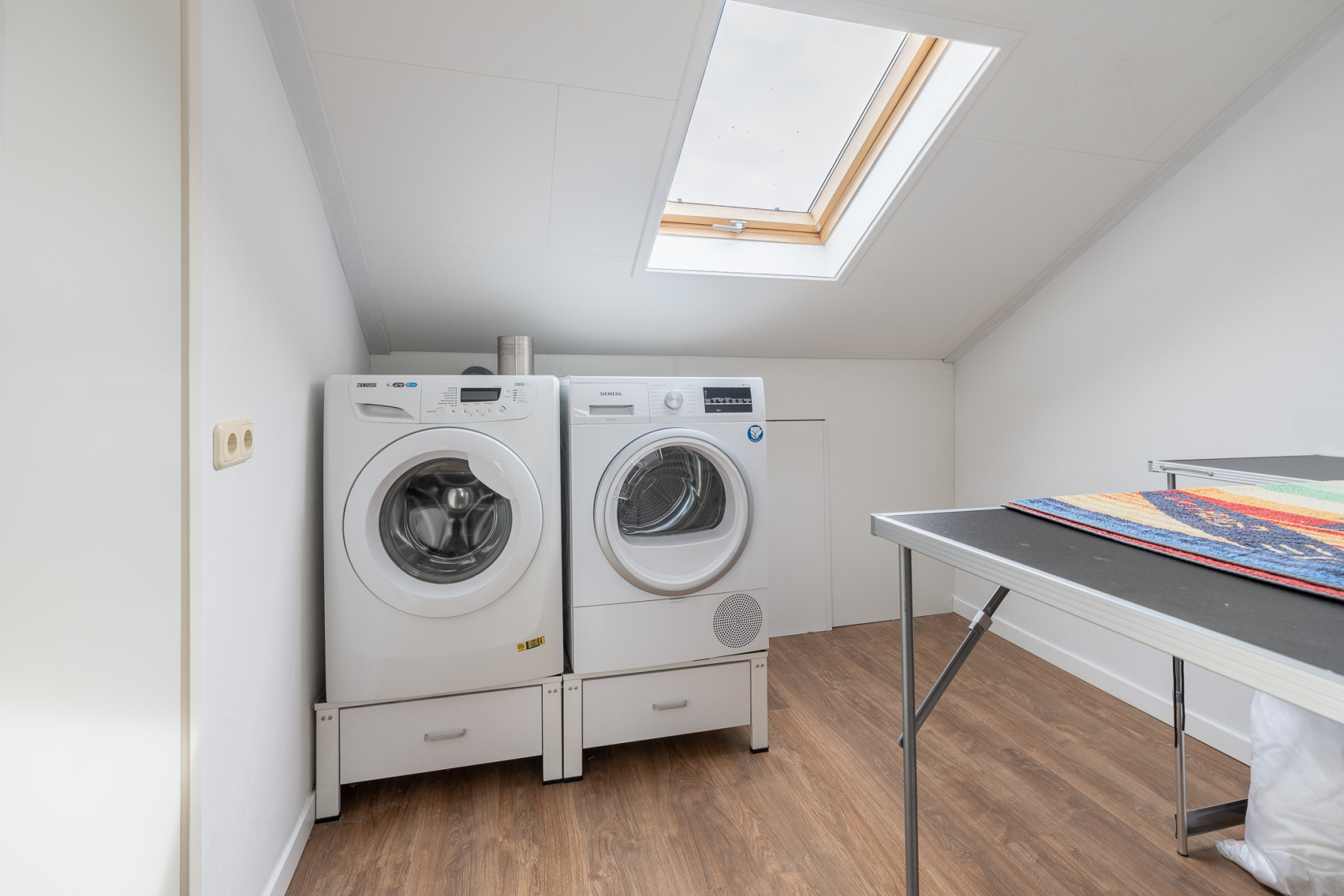 Op de tweede verdieping is nog een vierde, ruime slaapkamer te vinden. Deze slaapkamer beschikt over een Velux dakraam. Via deze ruimte bereikt u de wasruimte. Hier treft u de aansluiting voor de witgoedapparatuur aan. Daarnaast is deze ruimte voorzien van een dakraam en bergruimte achter knieschot. Ook krijgt u toegang tot een vaste kast. In de vaste kast bevindt zich de opstelling van de cv-ketel en de zonneboiler. Op de overloop is ook een vaste kast gerealiseerd, genoeg plek voor het opbergen van uw spullen. Een extra pluspunt; in het trappegat naar de tweede verdieping hangt een airconditioning. Zo blijft het in de warme zomermaanden lekker koel, zowel op de eerste als de tweede verdieping.