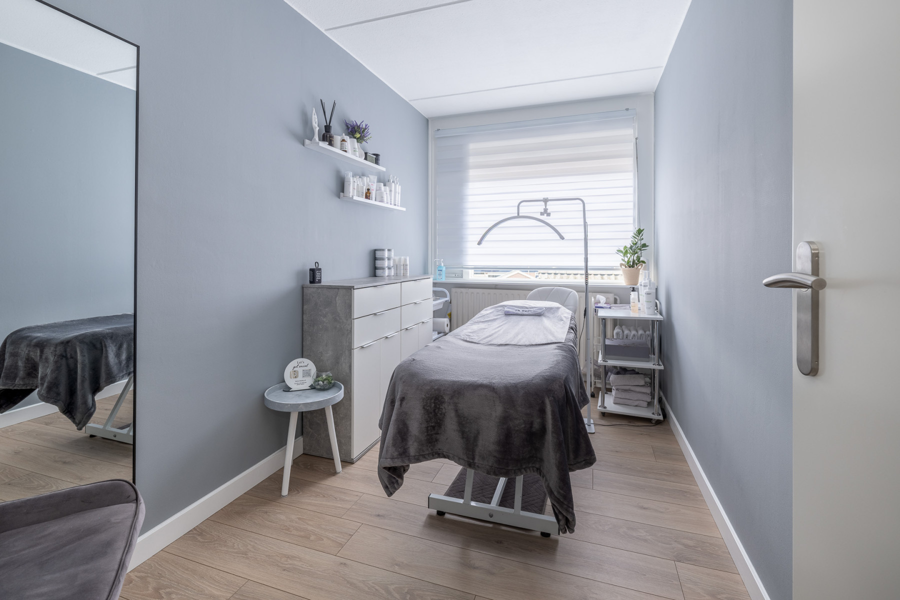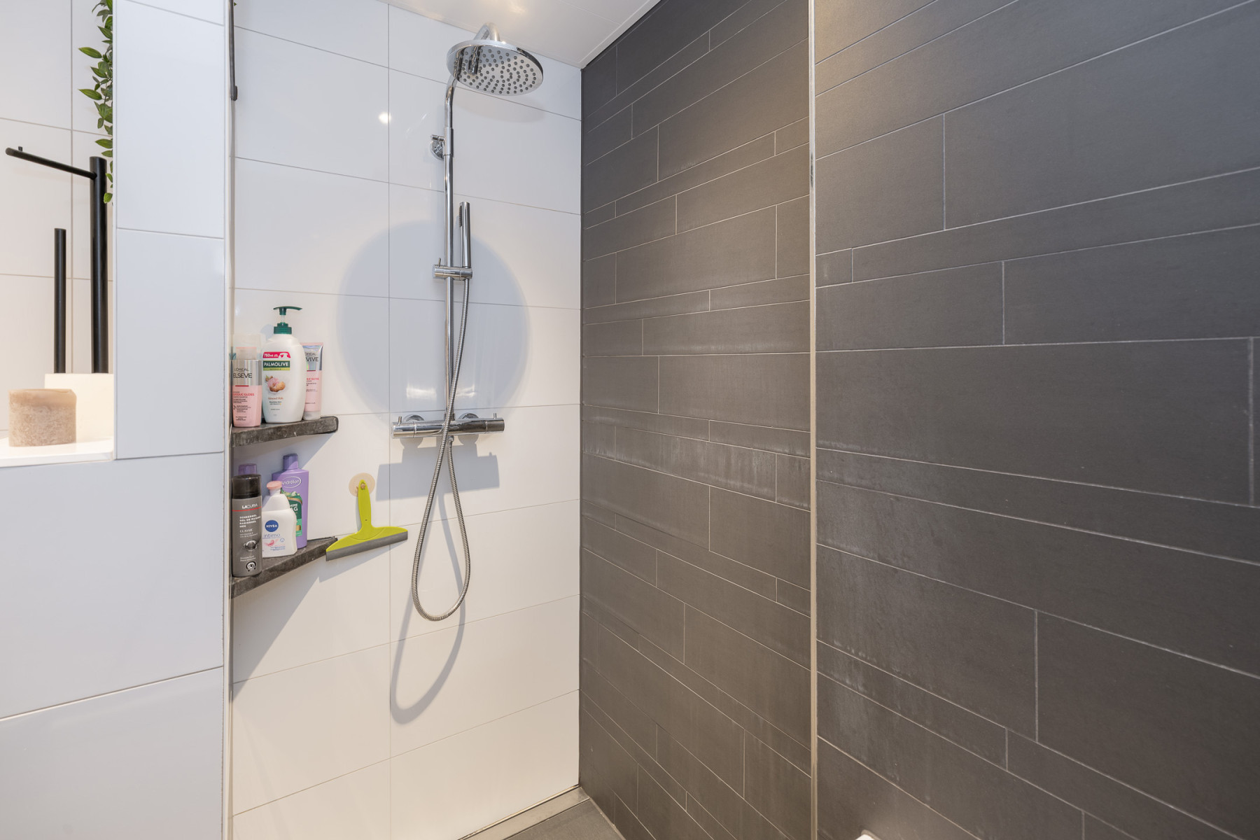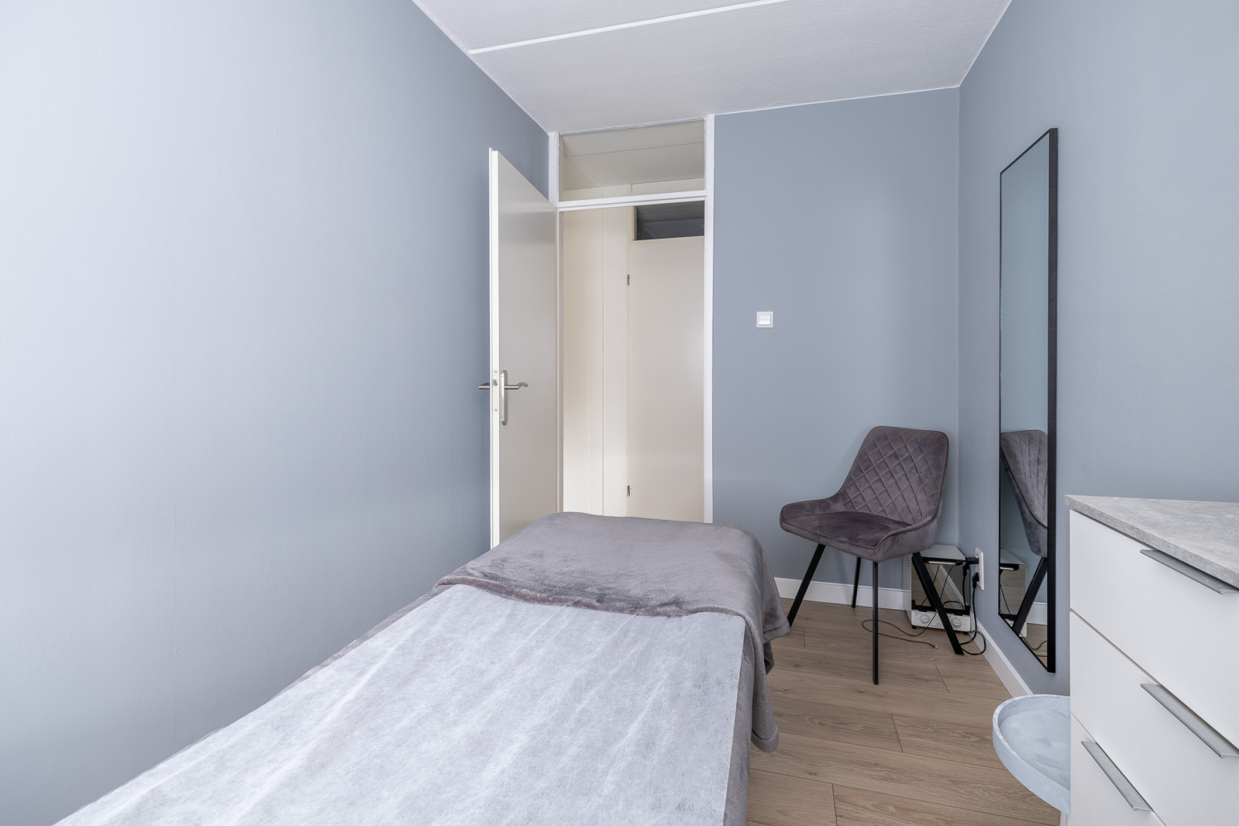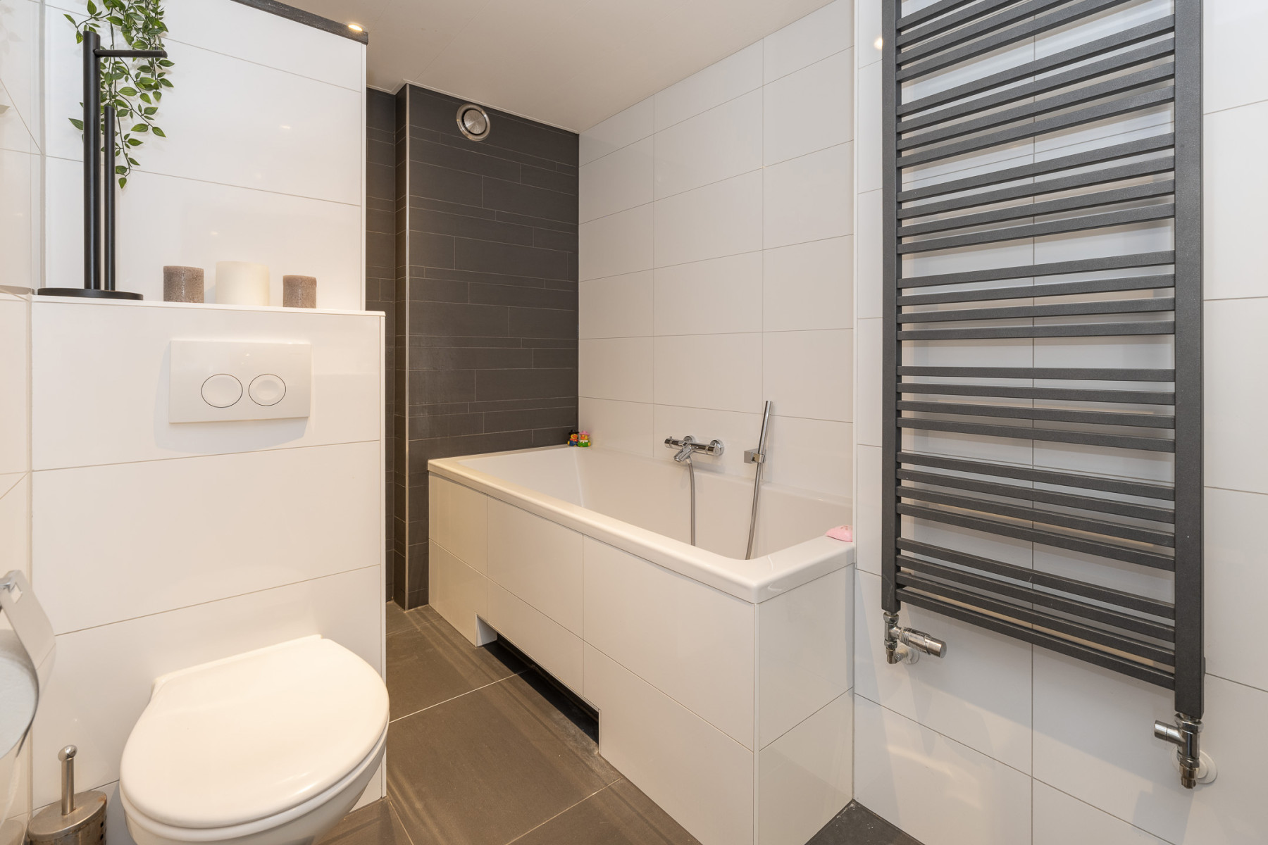 Modern en compleet, dat kenmerkt deze badkamer. In de badkamer profiteert u van een ligbad, een inloopdouche met regendouche, een wastafelmeubel met wastafel, een designradiator en een toilet. Daarbij is de badkamer modern afgewerkt met een witte en grijze kleurstelling. Een fijne bijkomstigheid; de ruimte is voorzien van vloerverwarming.