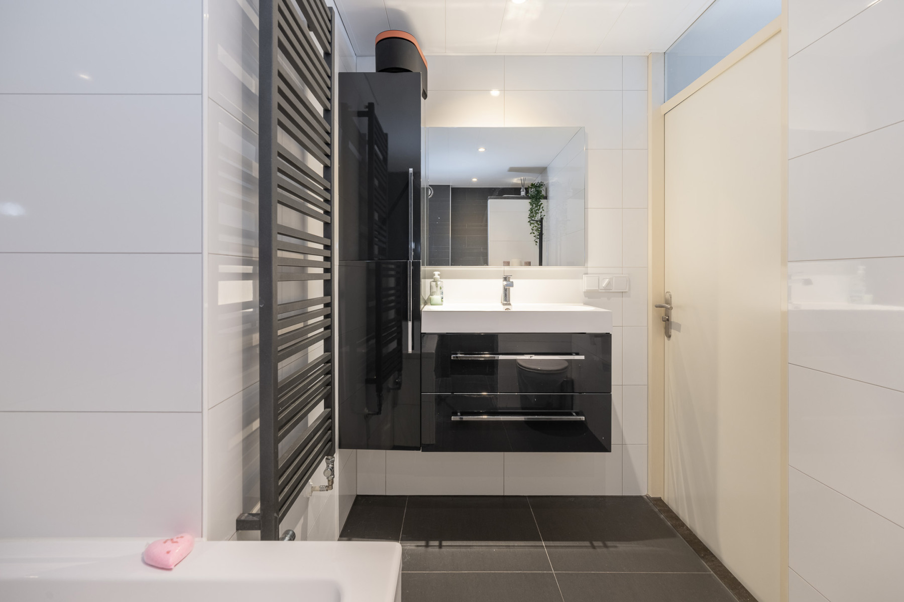 Ligbad, toilet, wastafel, wastafelmeubel, inloopdouche en vloerverwarming