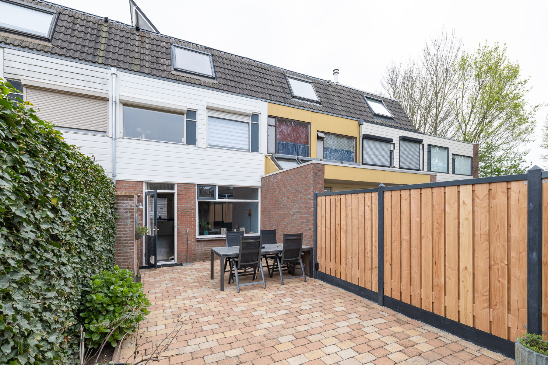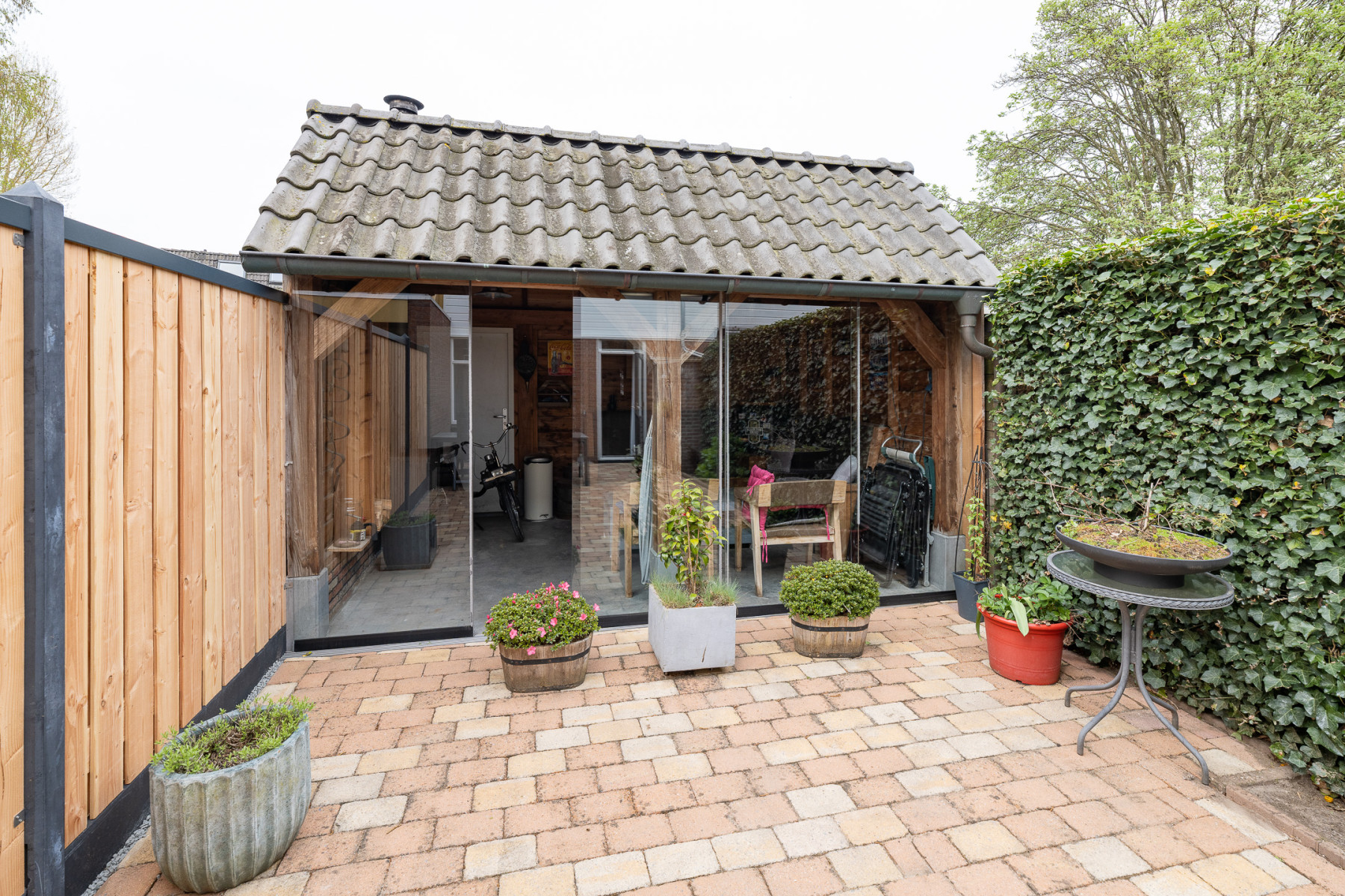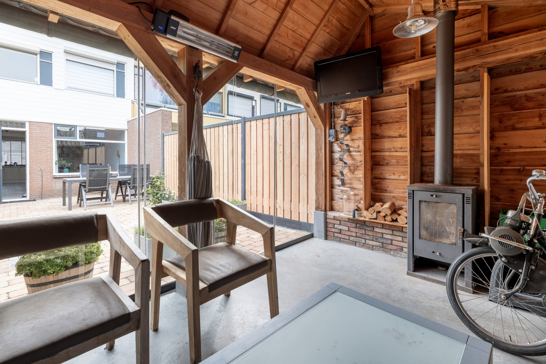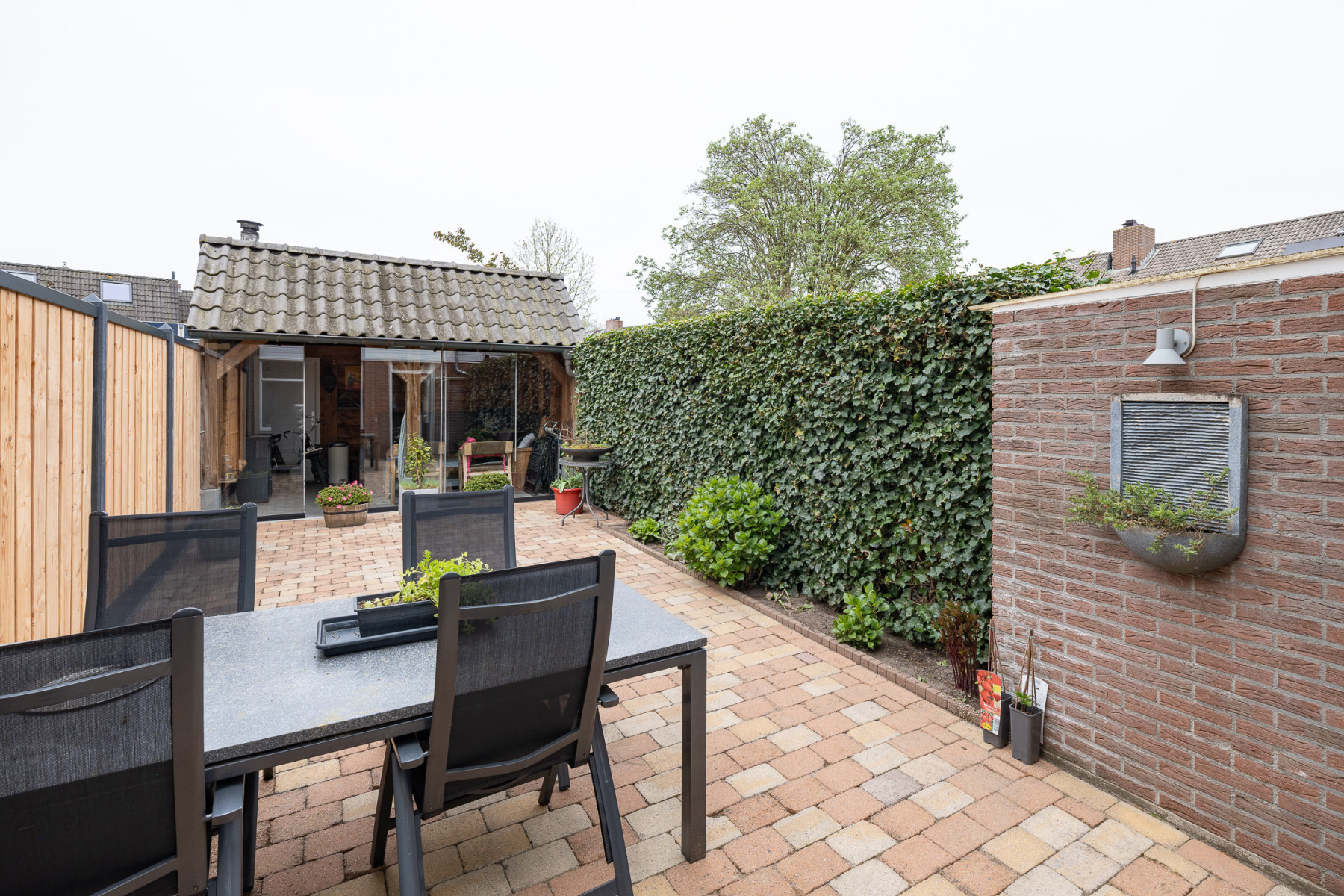 De achtertuin is strak aangelegd met grotendeels bestrating. Aan één zijde vindt u beplanting wat zorgt voor groen in de tuin. Direct achter de woning is er een terras voor een zithoek. Ook is direct achter de woning een kleine stenen berging te vinden. Achter in de tuin staat de veranda. Een extra ruimte waar u veel zult vertoeven. De veranda is voorzien van een glazen schuifwand. In de zomer zet u alles open en in het voor- en najaar zit u hier nog steeds comfortabel. De houtkachel maakt het nog eens extra aantrekkelijk. De tuin is ook te bereiken middels een eigen achterom, via de veranda.