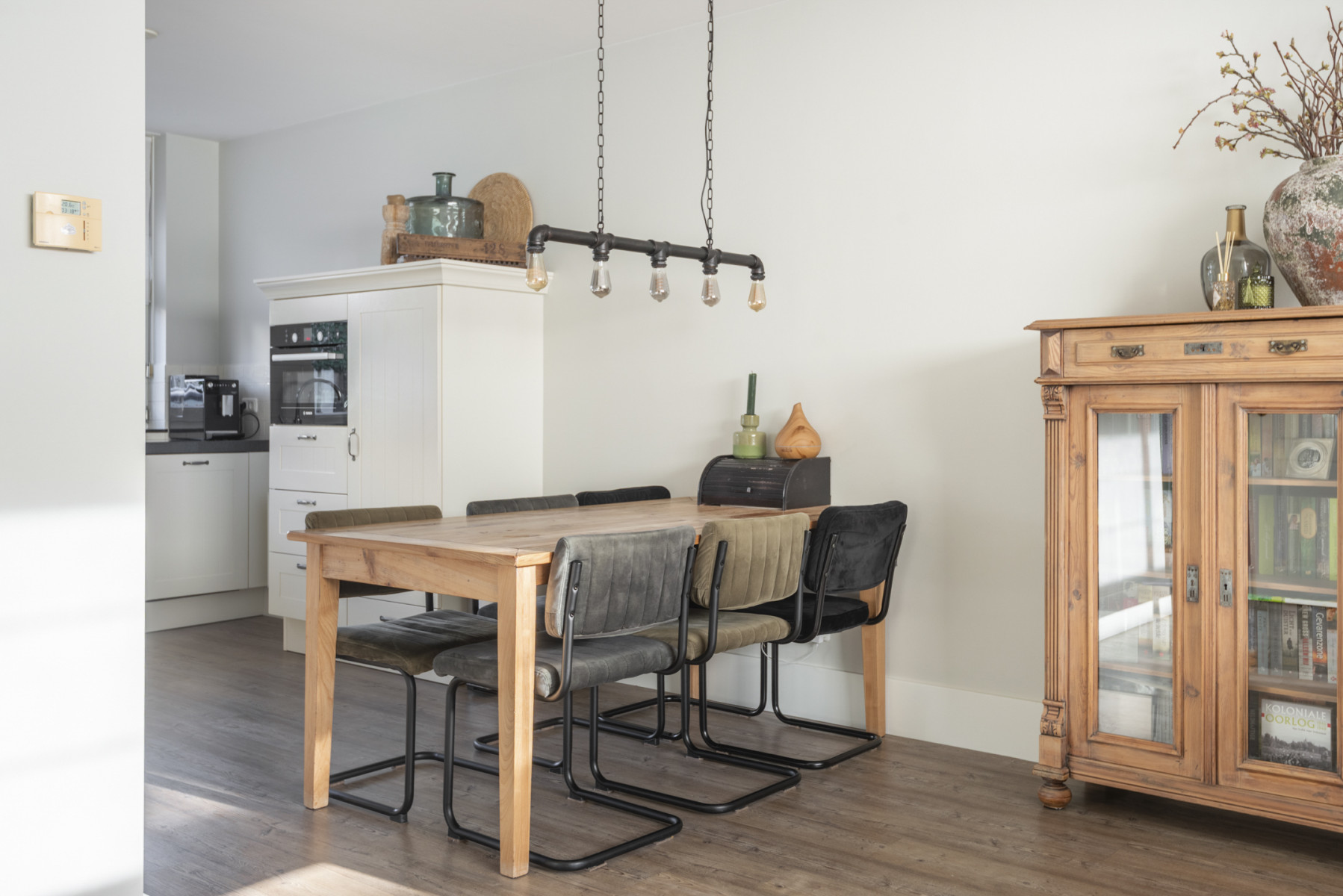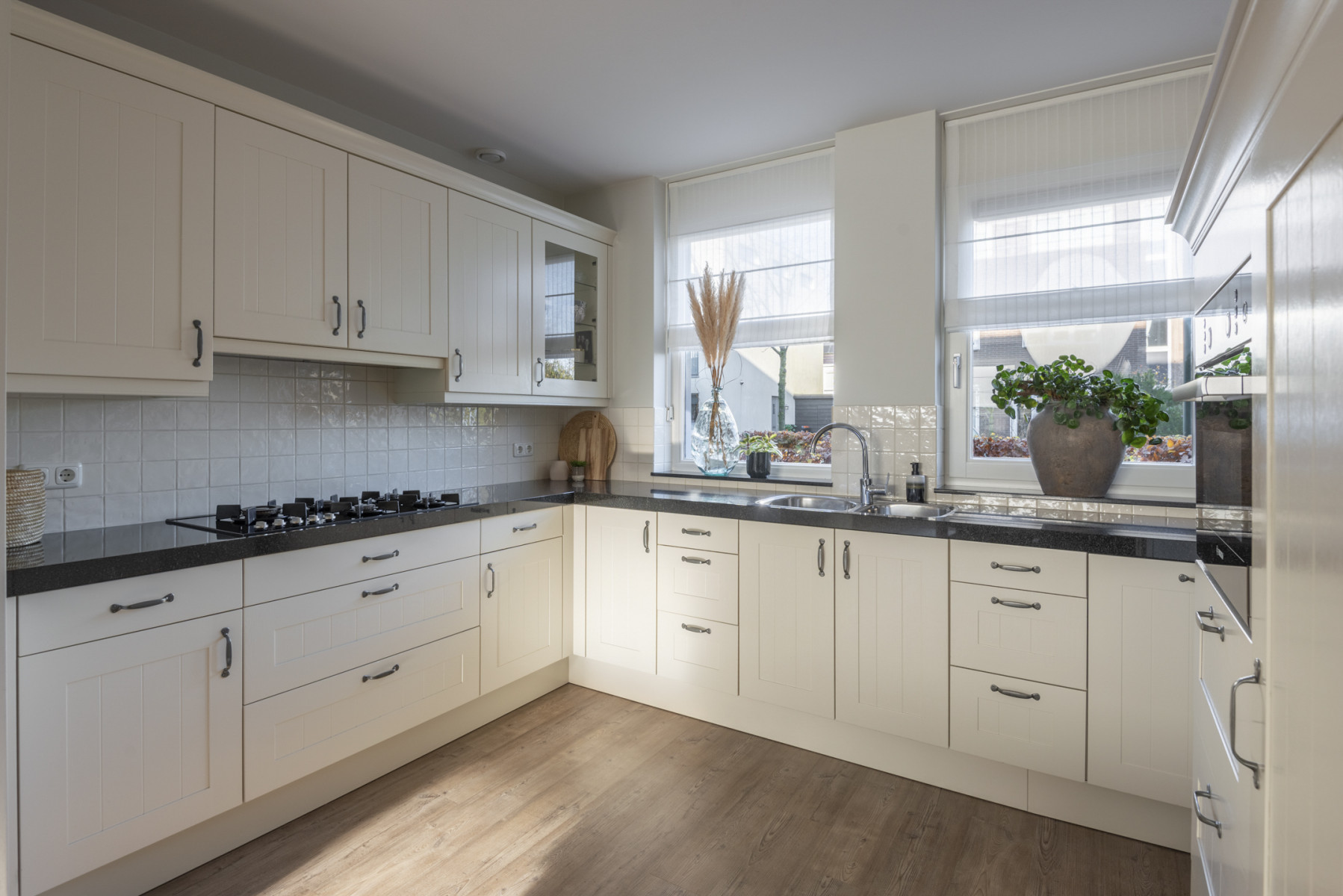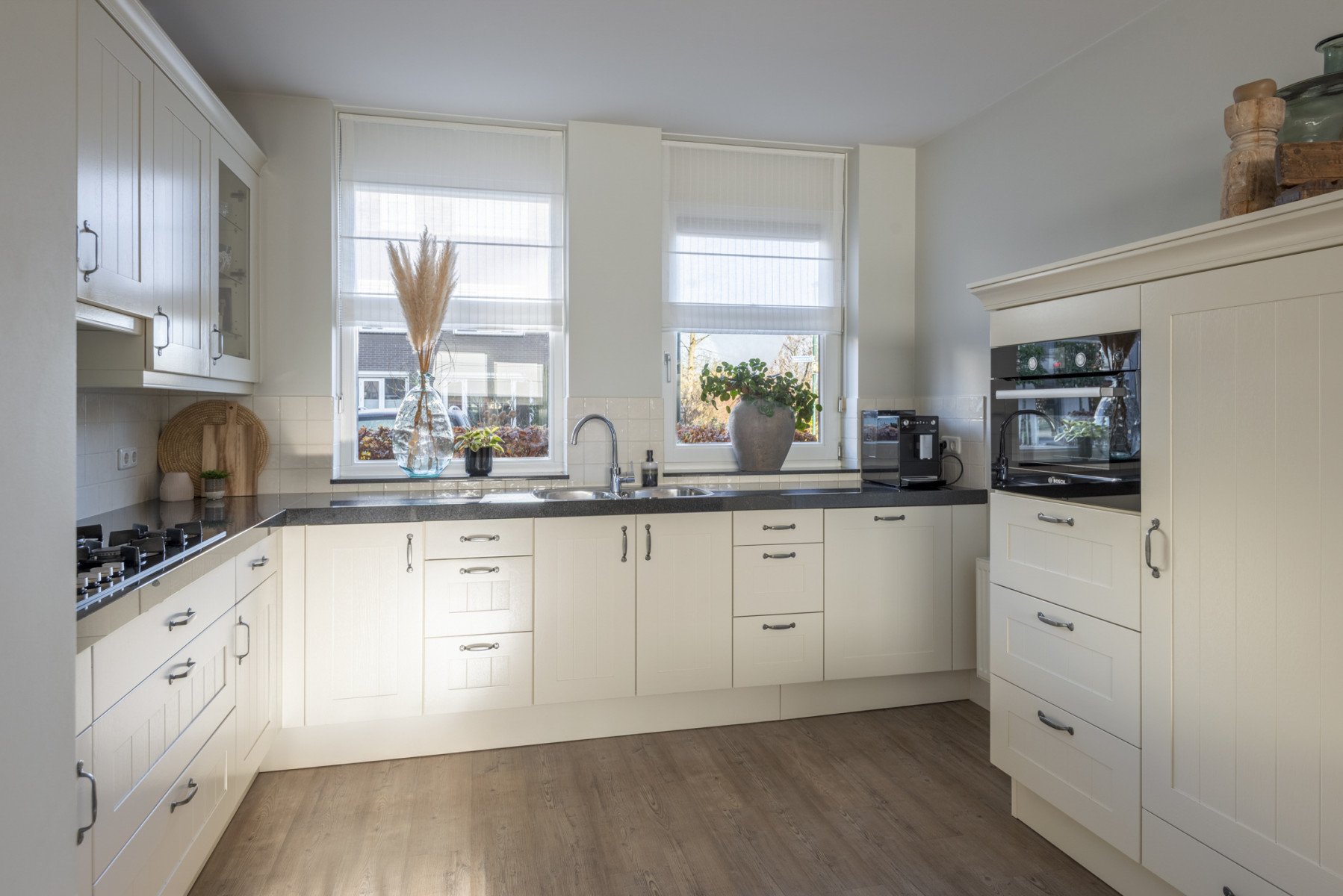 De keuken is royaal opgesteld en heeft een moderne uitstraling door de lichte kasten in combinatie met het donkere aanrechtblad. Hier kookt u elke dag met plezier dankzij het 5-pits gasfornuis, afzuigkap, combi-oven, koelkast en een vaatwasmachine. De keuken is in twee delen opgesteld zodat u hier al uw keukengerei gemakkelijk kunt opbergen. Nabij de keuken is er nog voldoende plek voor een royale eettafel.
