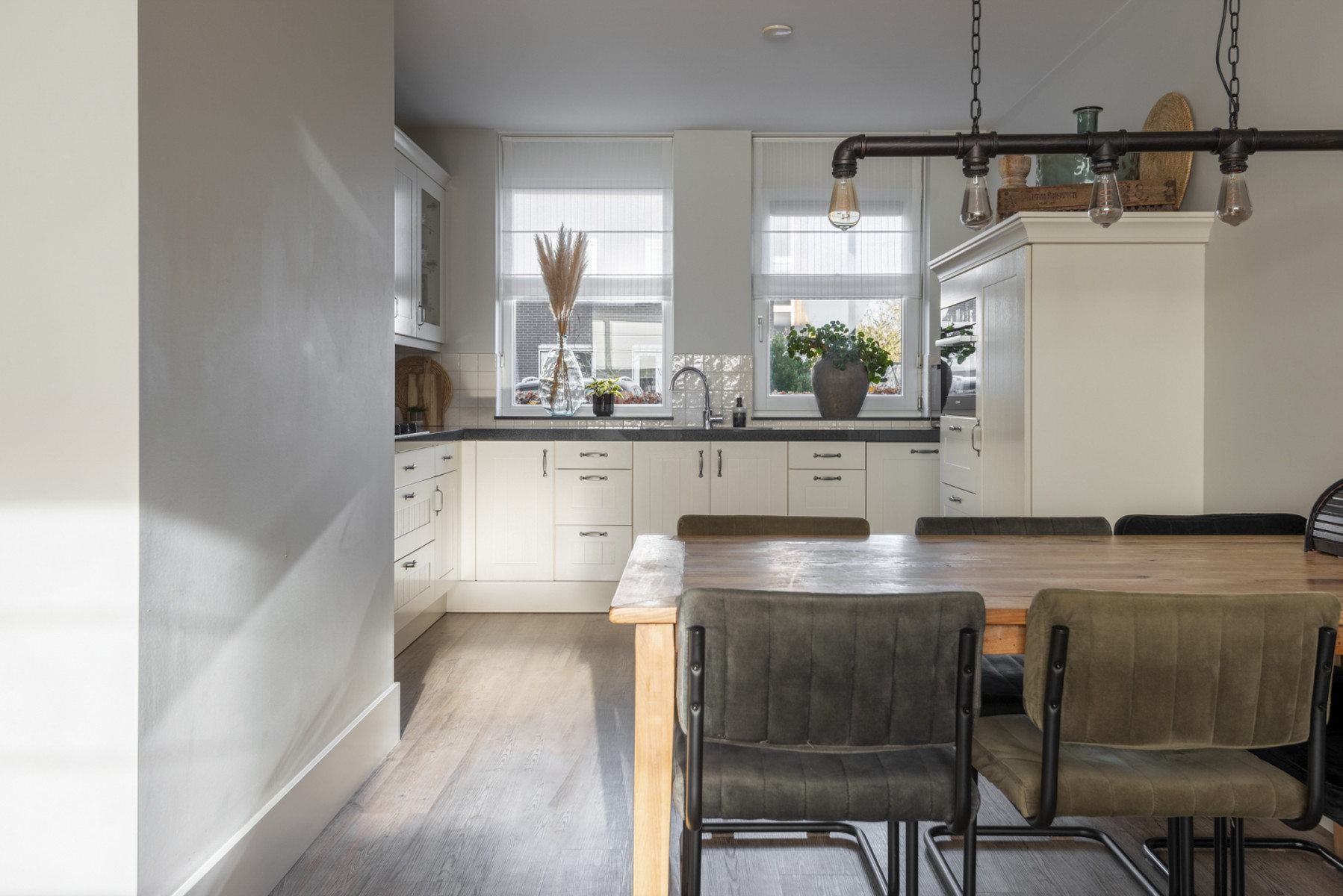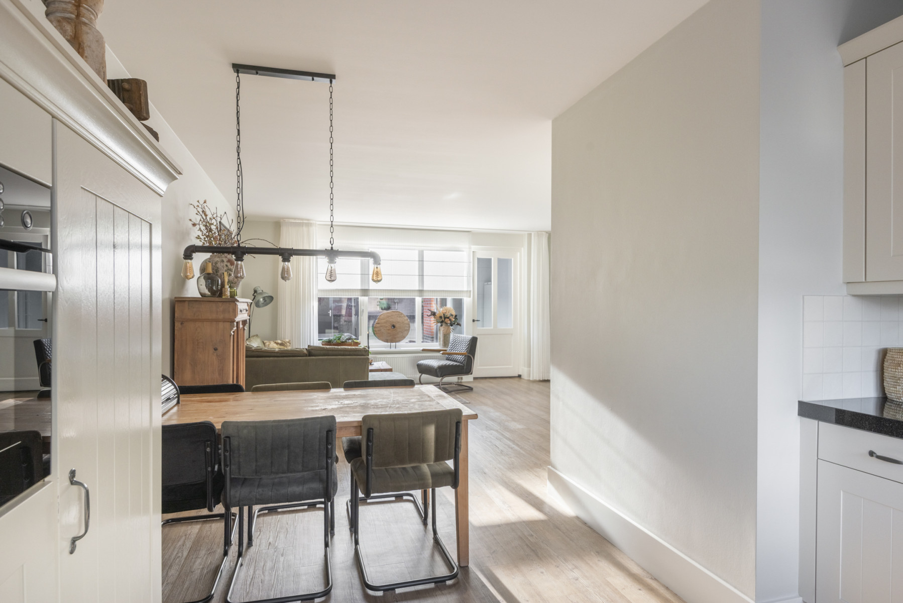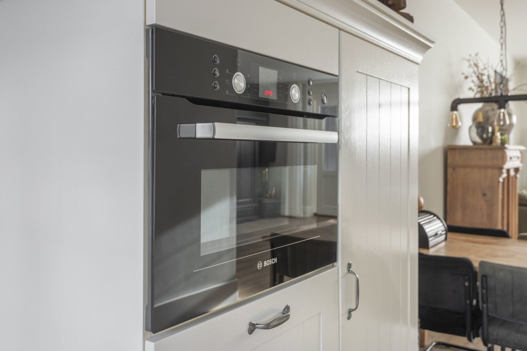 De keuken is royaal opgesteld en heeft een moderne uitstraling door de lichte kasten in combinatie met het donkere aanrechtblad. Hier kookt u elke dag met plezier dankzij het 5-pits gasfornuis, afzuigkap, combi-oven, koelkast en een vaatwasmachine. De keuken is in twee delen opgesteld zodat u hier al uw keukengerei gemakkelijk kunt opbergen. Nabij de keuken is er nog voldoende plek voor een royale eettafel.