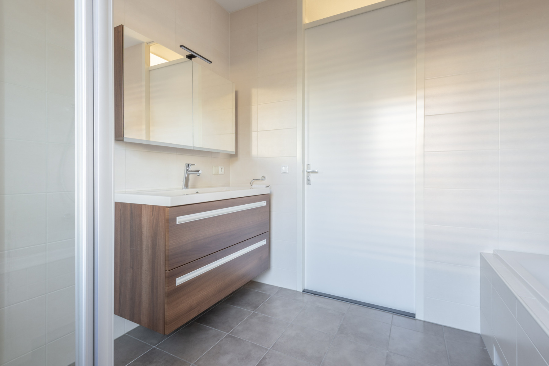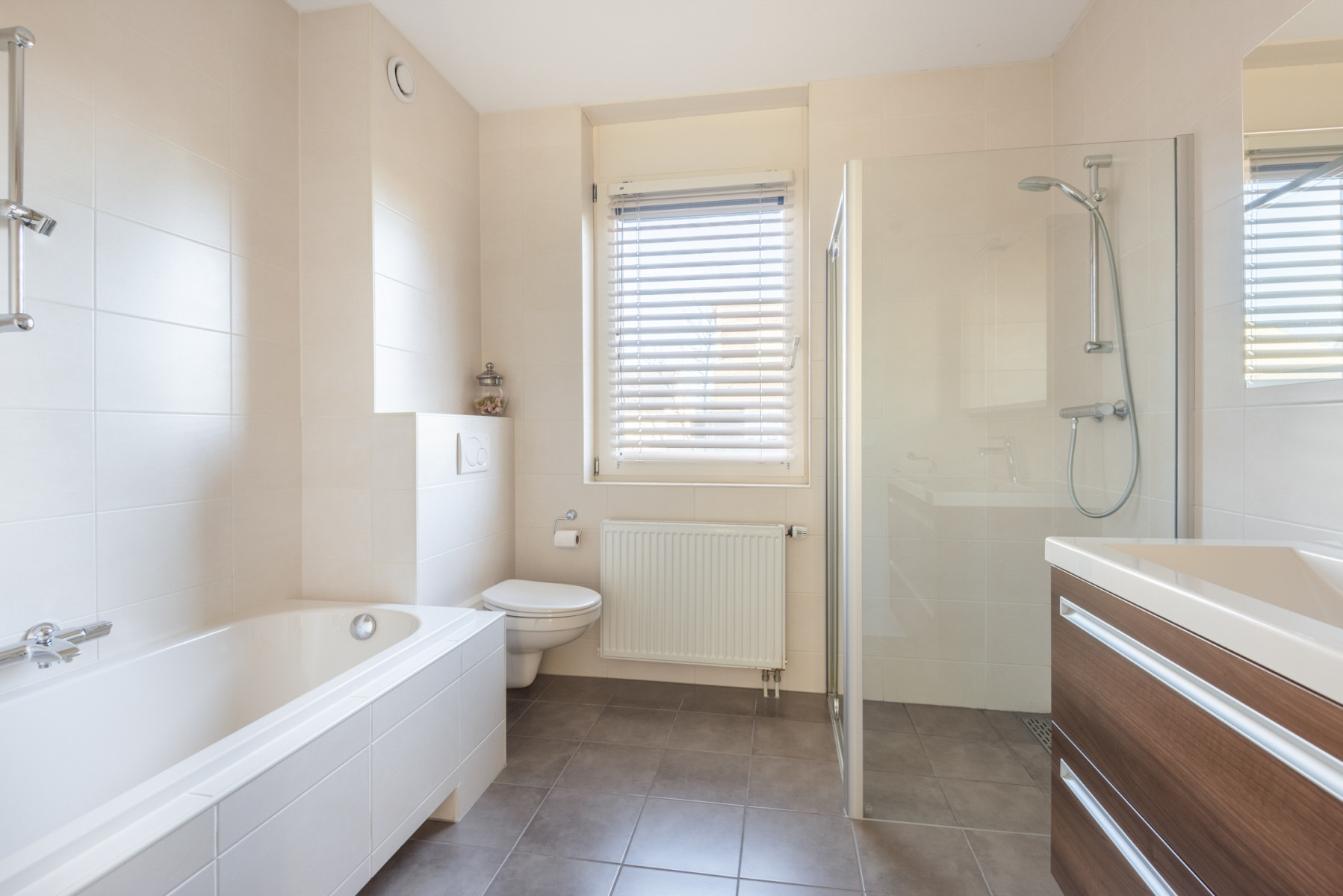 Ligbad, toilet, douche, wastafel, wastafelmeubel en vloerverwarming