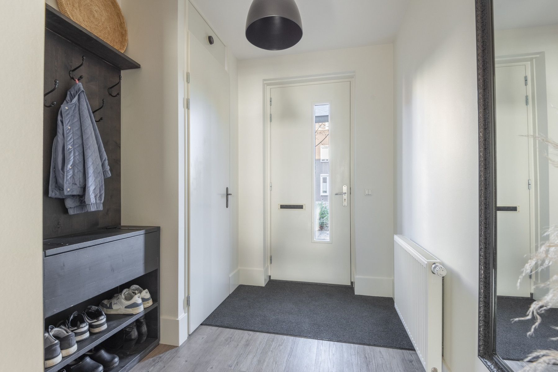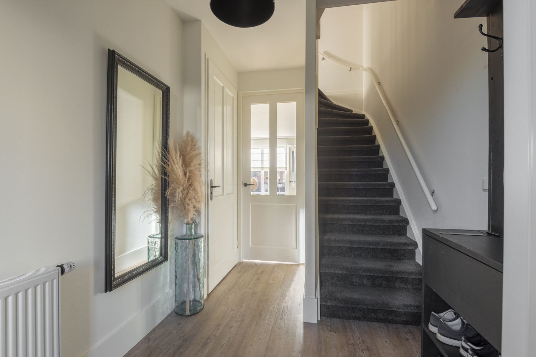 De woning stappen we binnen in de hal, dat is de eerste kennismaking met de woning. En die is meteen goed! De verzorgde hal is voorzien van de meterkast, de trapopgang naar de eerste verdieping en een toiletruimte met toilet en fonteintje.