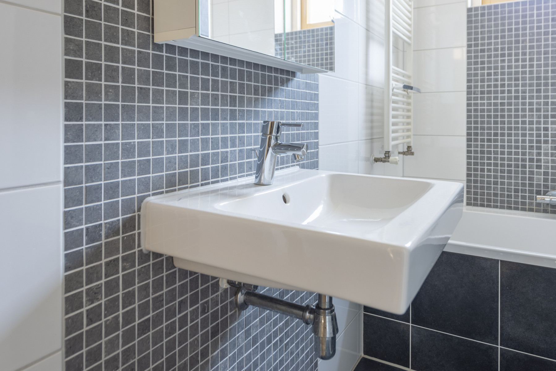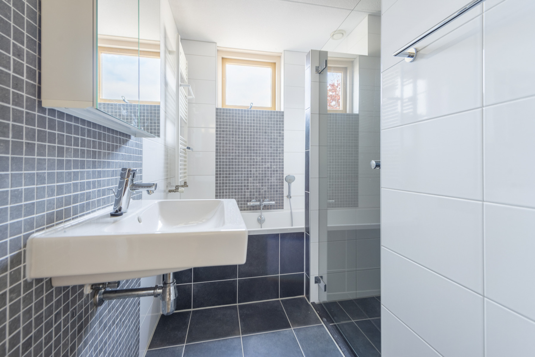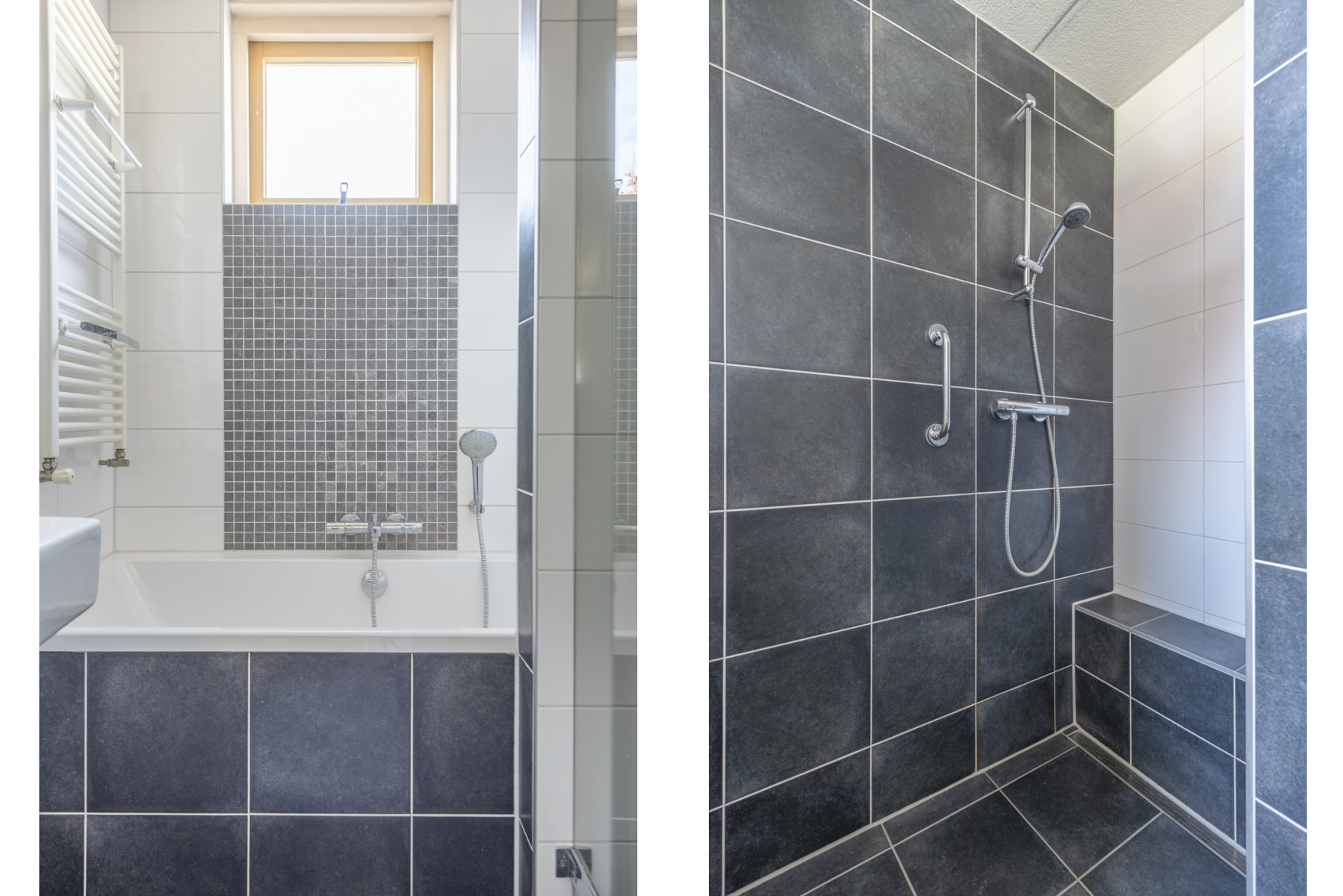 De badkamer heeft een moderne uitstraling en biedt u alle benodigdheden. Zo bevindt er zich in de ruimte een ligbad, een ruime douchecabine, een wastafel en een designradiator.