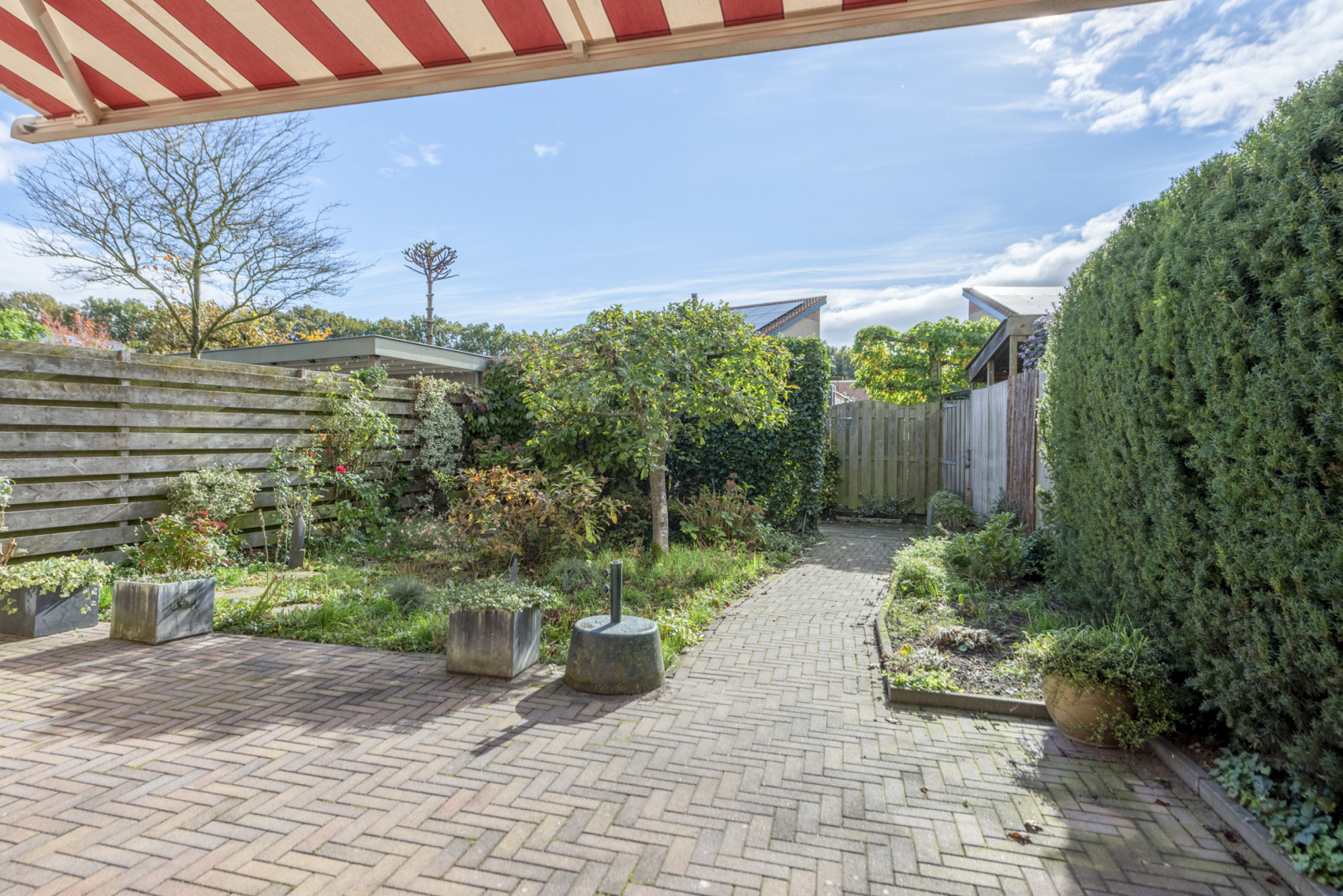 Middels de schuifpui of de bijkeuken stapt u de tuin is. Direct achter de woning bevindt zich een terras, hier kunt u met gemak een royale zithoek plaatsen. Door de perfecte zonligging op het zuiden, geniet u veel van de zon. Liever een momentje in de schaduw? Dankzij het elektrisch bedienbaar uitvalscherm is dat ook mogelijk. Verder is de tuin aangelegd met diverse beplanting, bomen en een pad van klinkers. Achter in de tuin vindt u een royale, stenen berging waar u de fietsen en het tuingereedschap in kunt opbergen. De tuin is ook via een eigen achterom.
