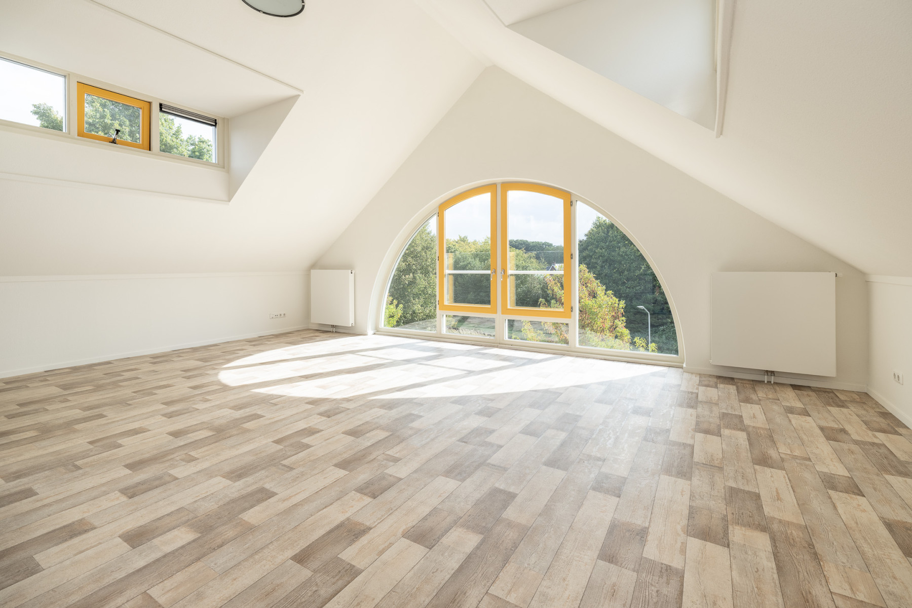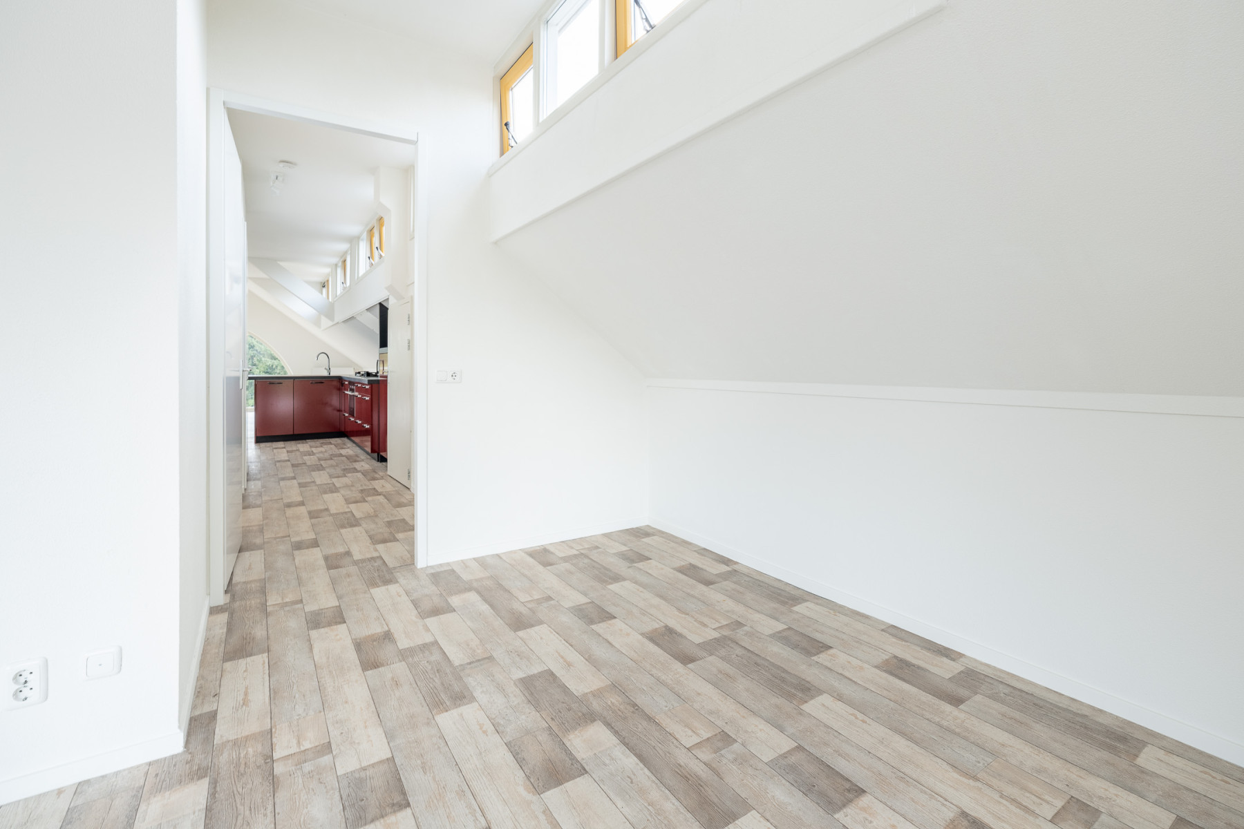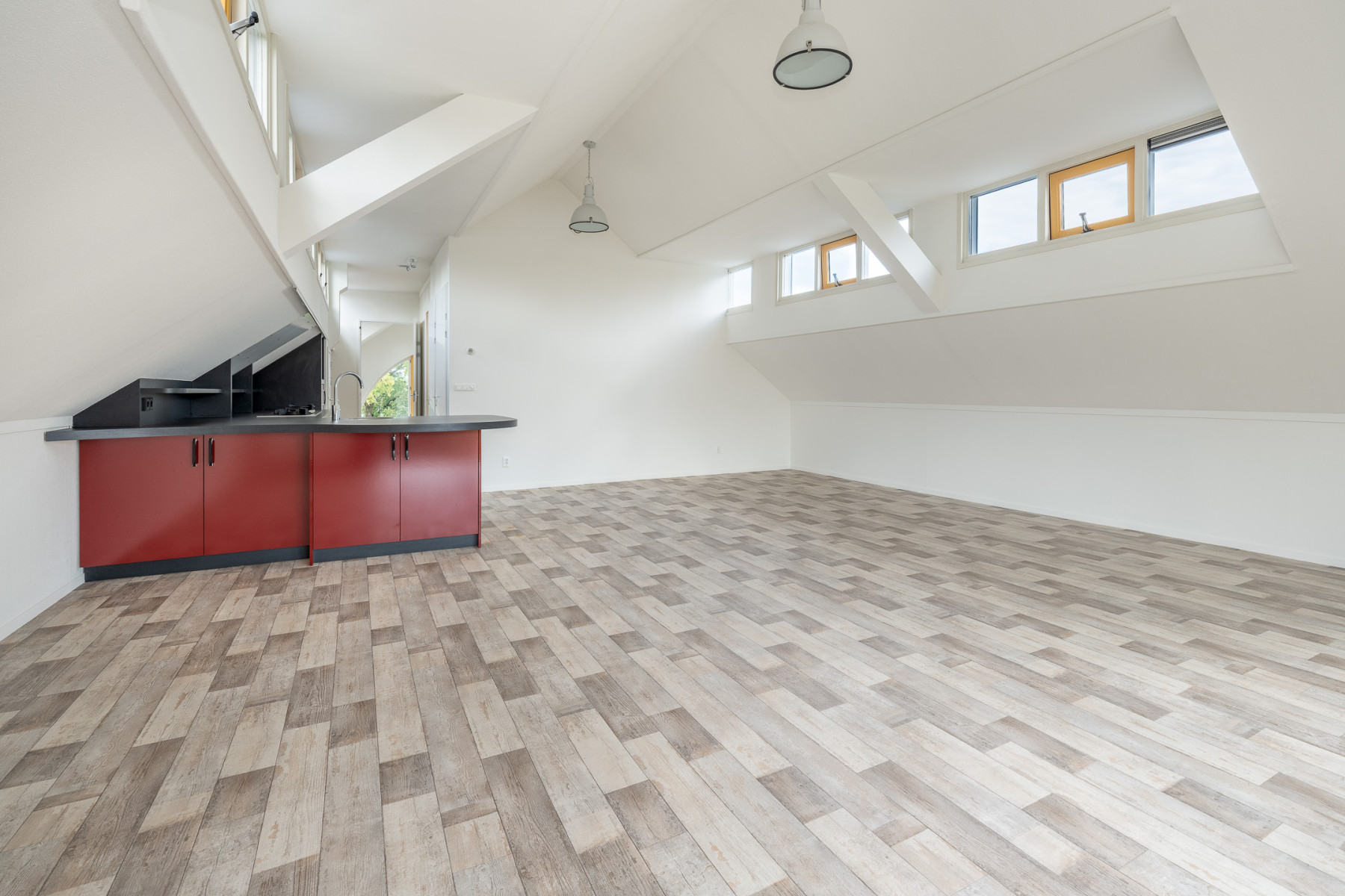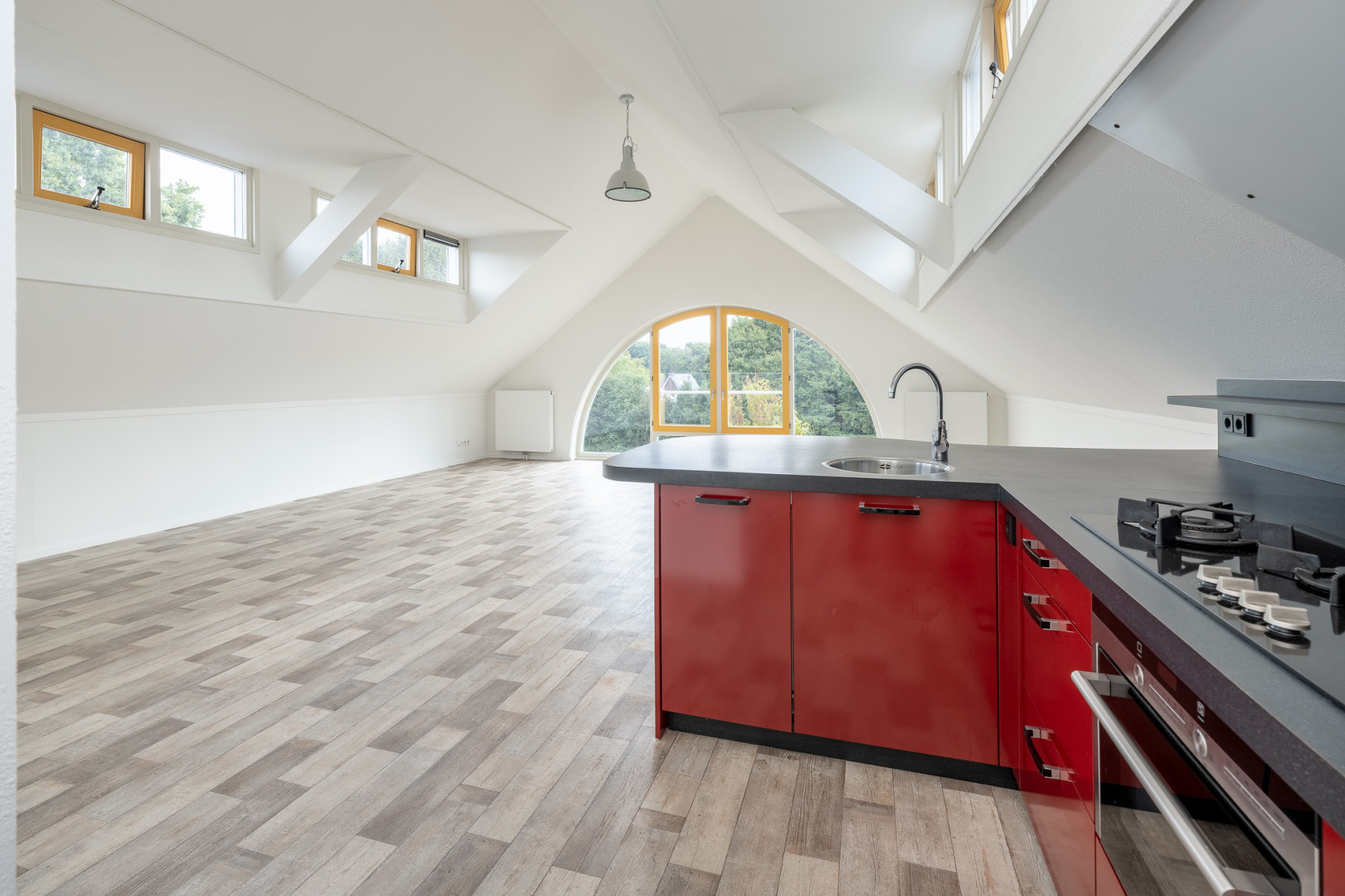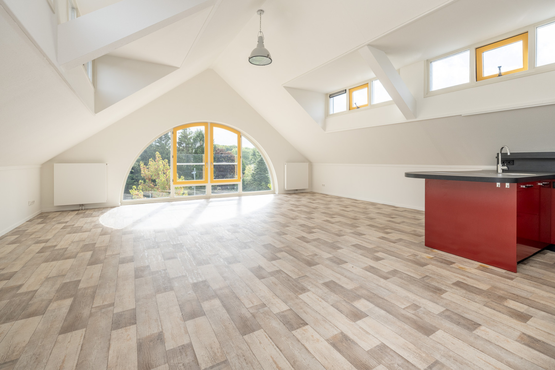 De grote raampartijen zorgen hier niet alleen voor fijn licht, maar geven u ook een mooi uitzicht over de groene omgeving rondom het appartement! U kunt in de ruime woonkamer een fijne zithoek plaatsen, en ook voor een eethoek is hier genoeg ruimte. Kortom, een woonkamer waar écht geleefd kan worden.
