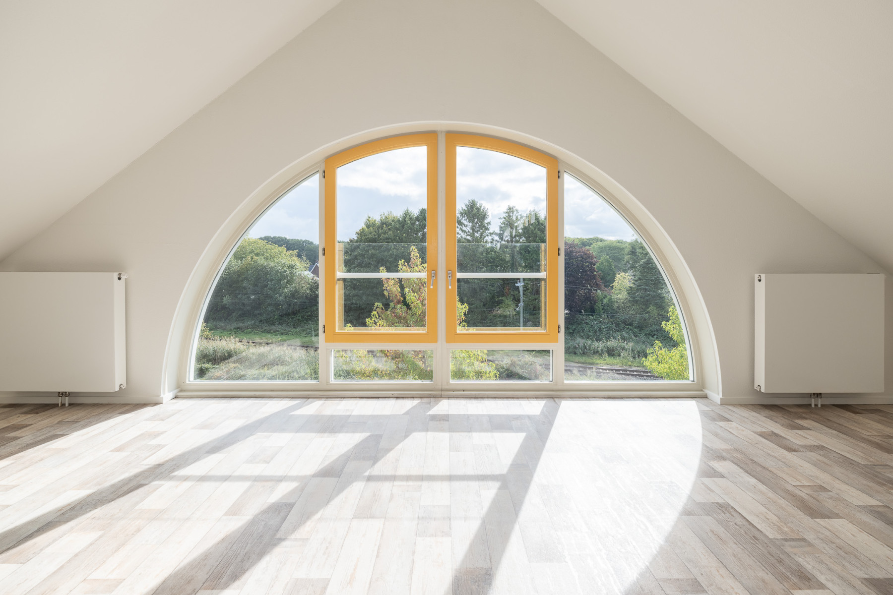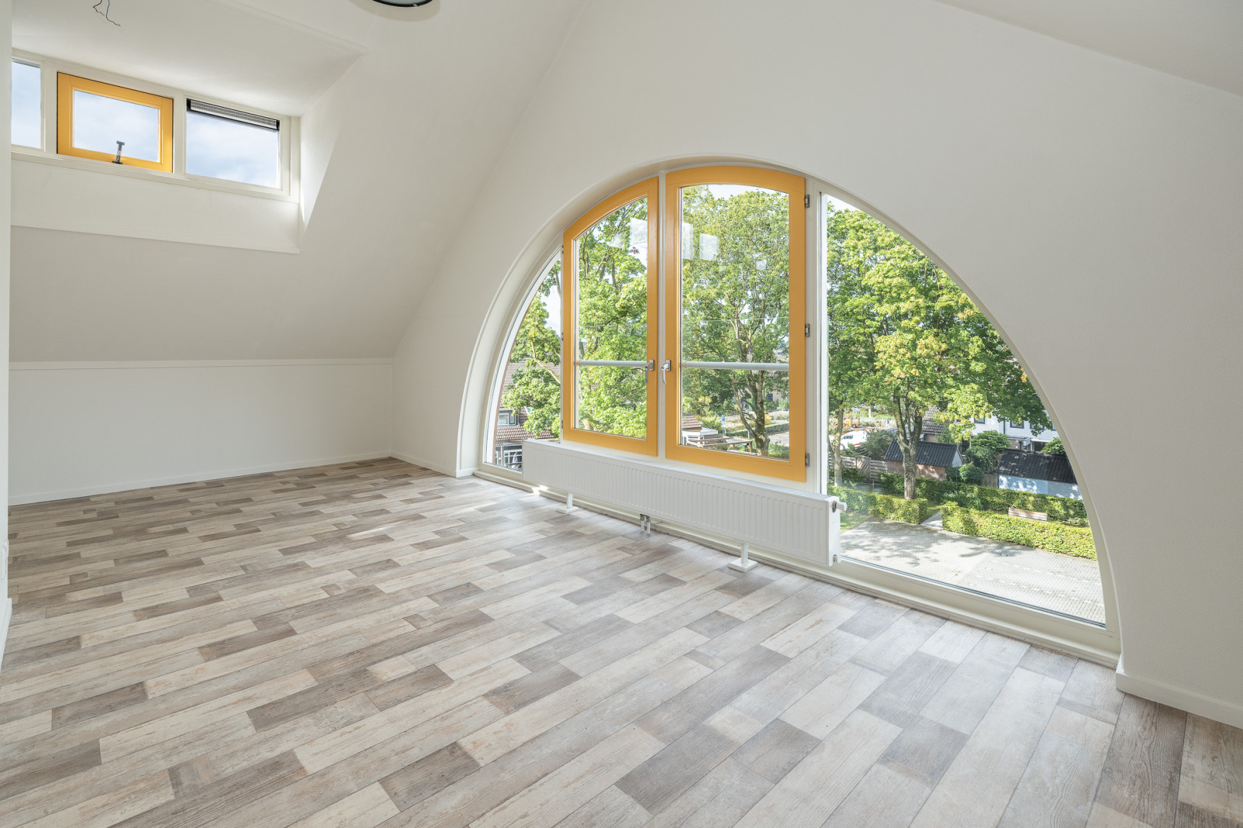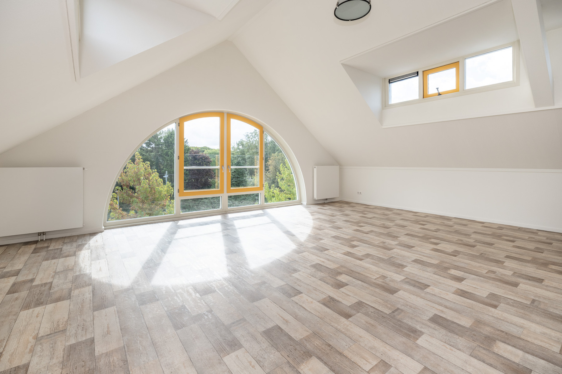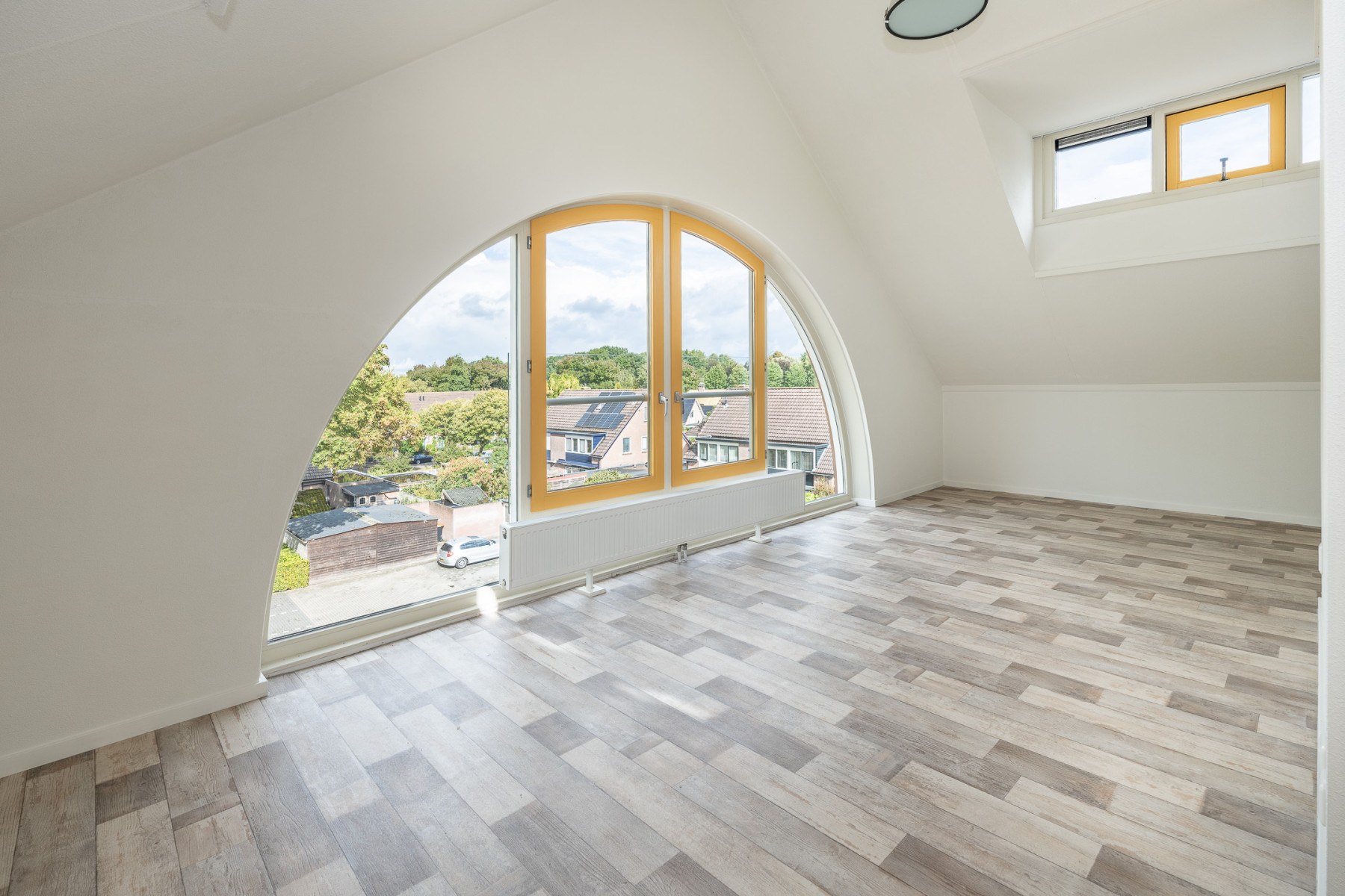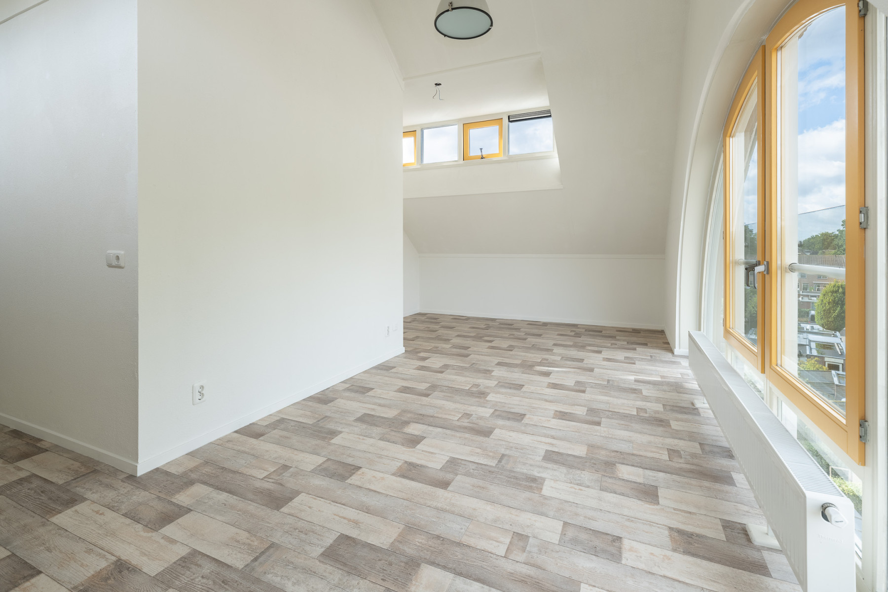 De grote raampartijen zorgen hier niet alleen voor fijn licht, maar geven u ook een mooi uitzicht over de groene omgeving rondom het appartement! U kunt in de ruime woonkamer een fijne zithoek plaatsen, en ook voor een eethoek is hier genoeg ruimte. Kortom, een woonkamer waar écht geleefd kan worden.
