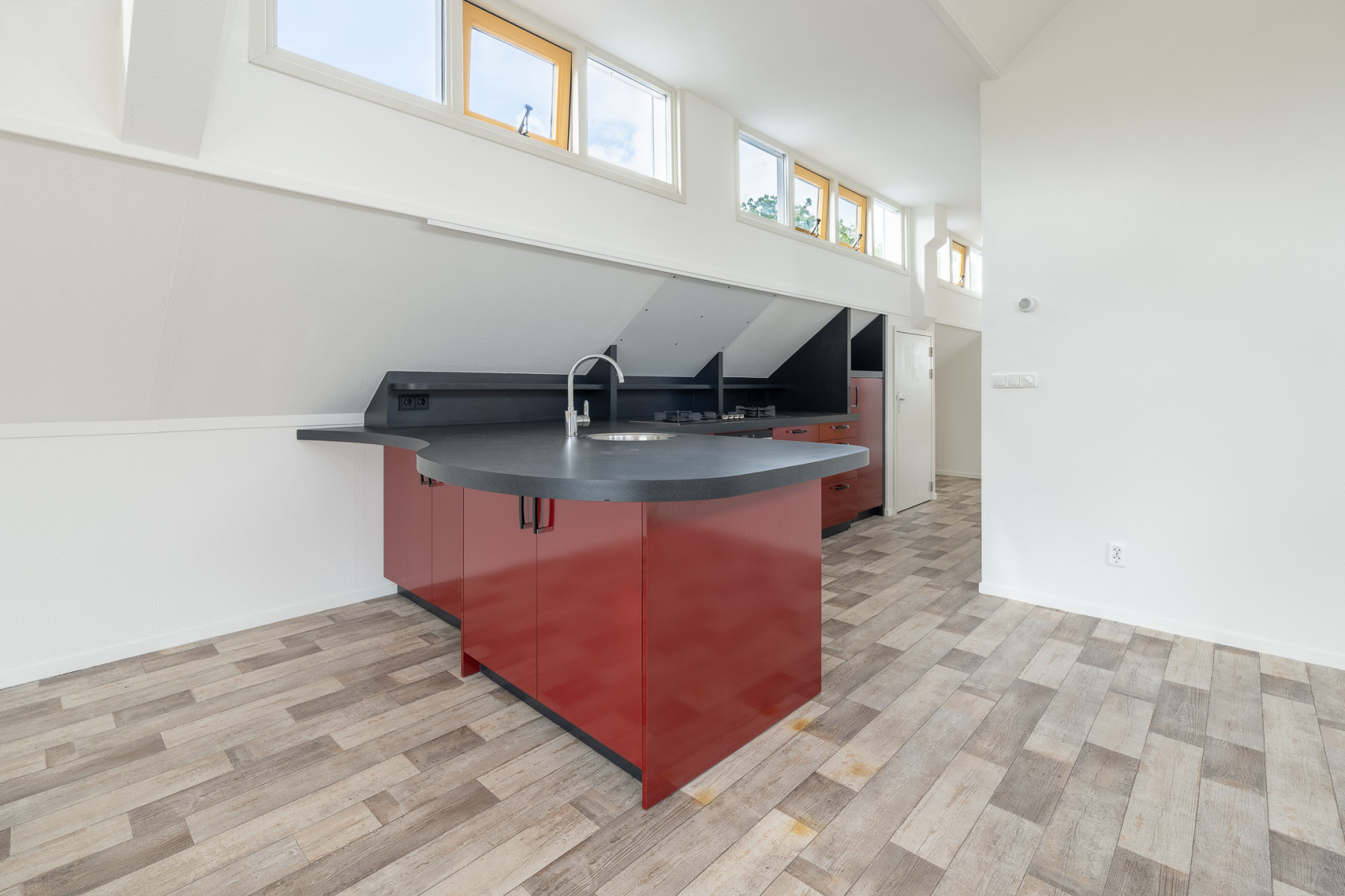 Als u het appartement verder binnenloopt komt u aan in de keuken. Deze keuken biedt door de kasten veel opbergruimte, in een van de kasten bevindt zich de CV-ketel. Daarnaast is de keuken uitgerust met een vaatwasser, een 4-pits gasfornuis, een combi-oven en een koelkast: alles wat u nodig heeft om heerlijke maaltijden te bereiden. En een leuke extra: de speels afgewerkte bar, waar uw gasten gezellig kunnen plaatsnemen tijdens het koken.