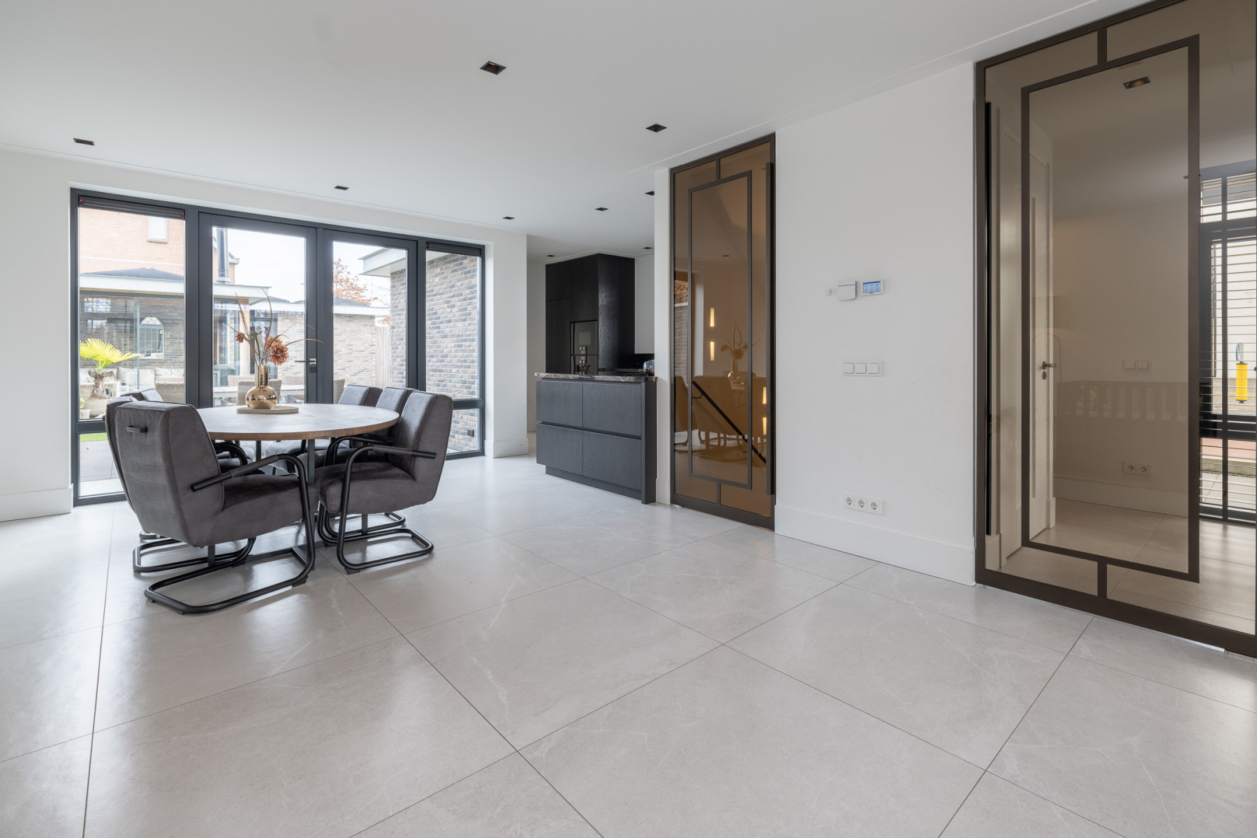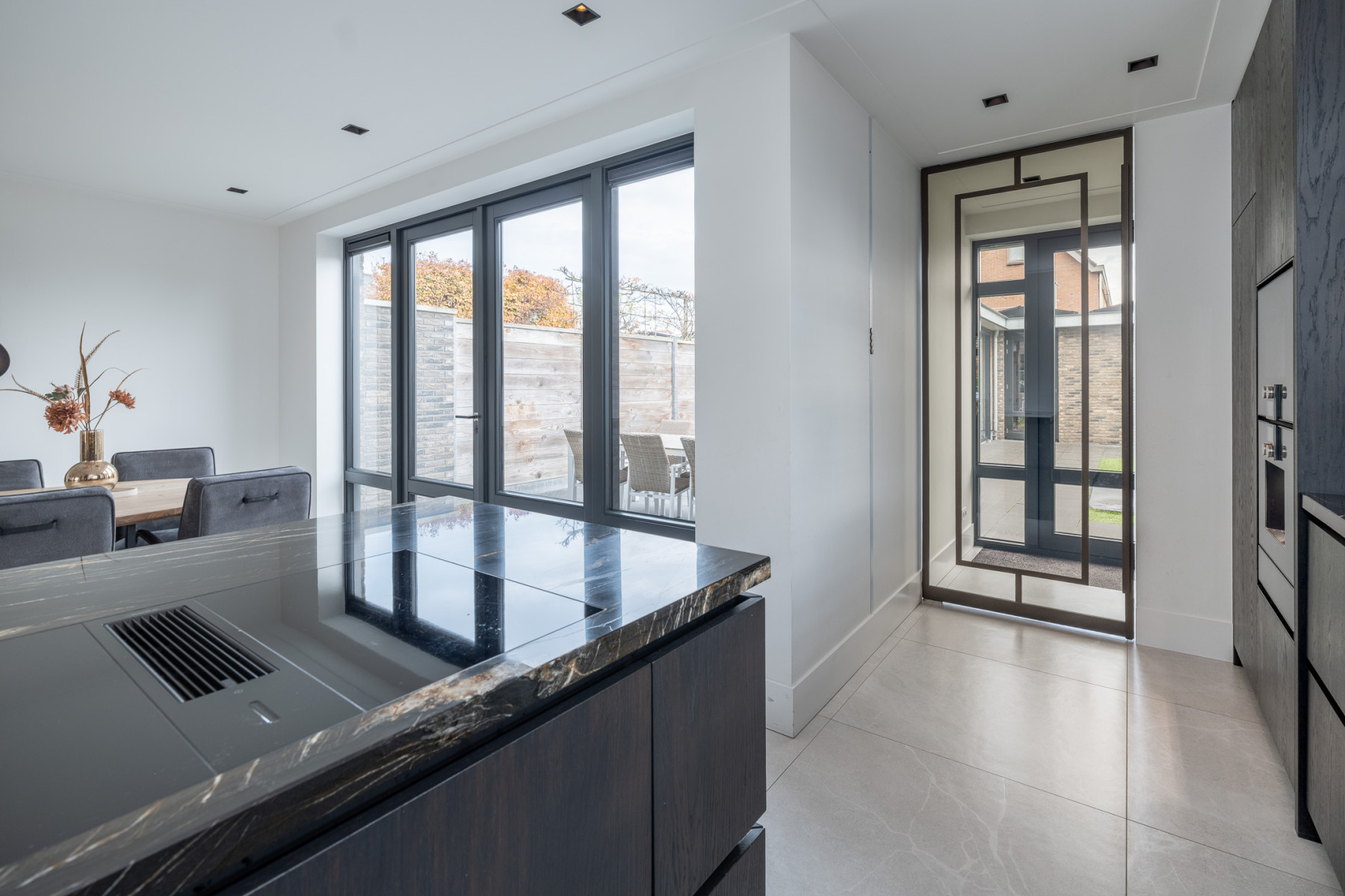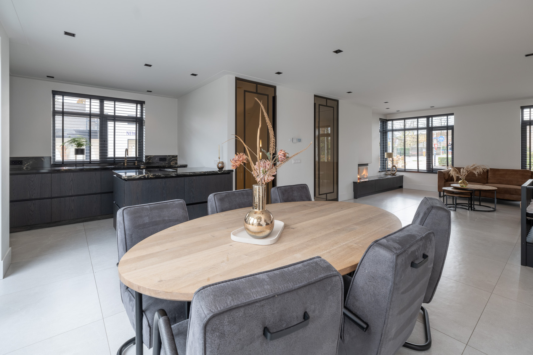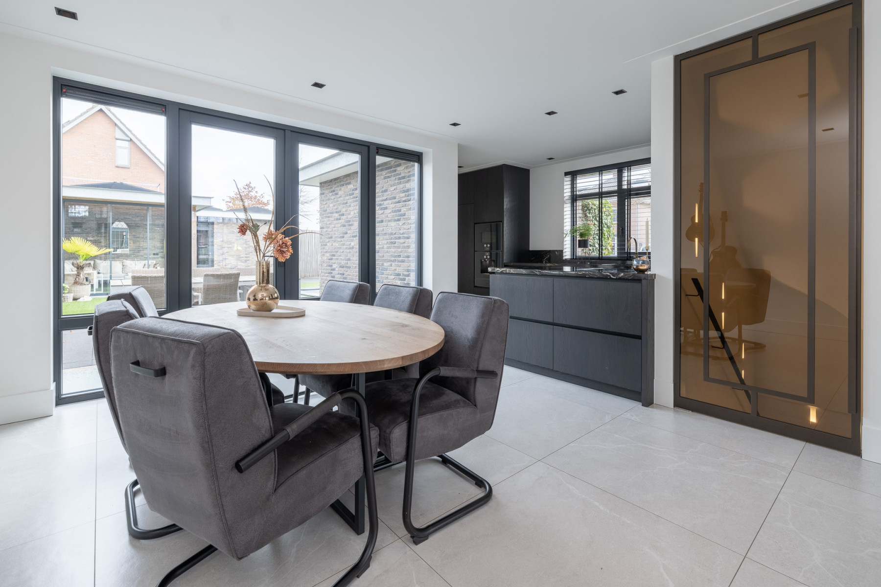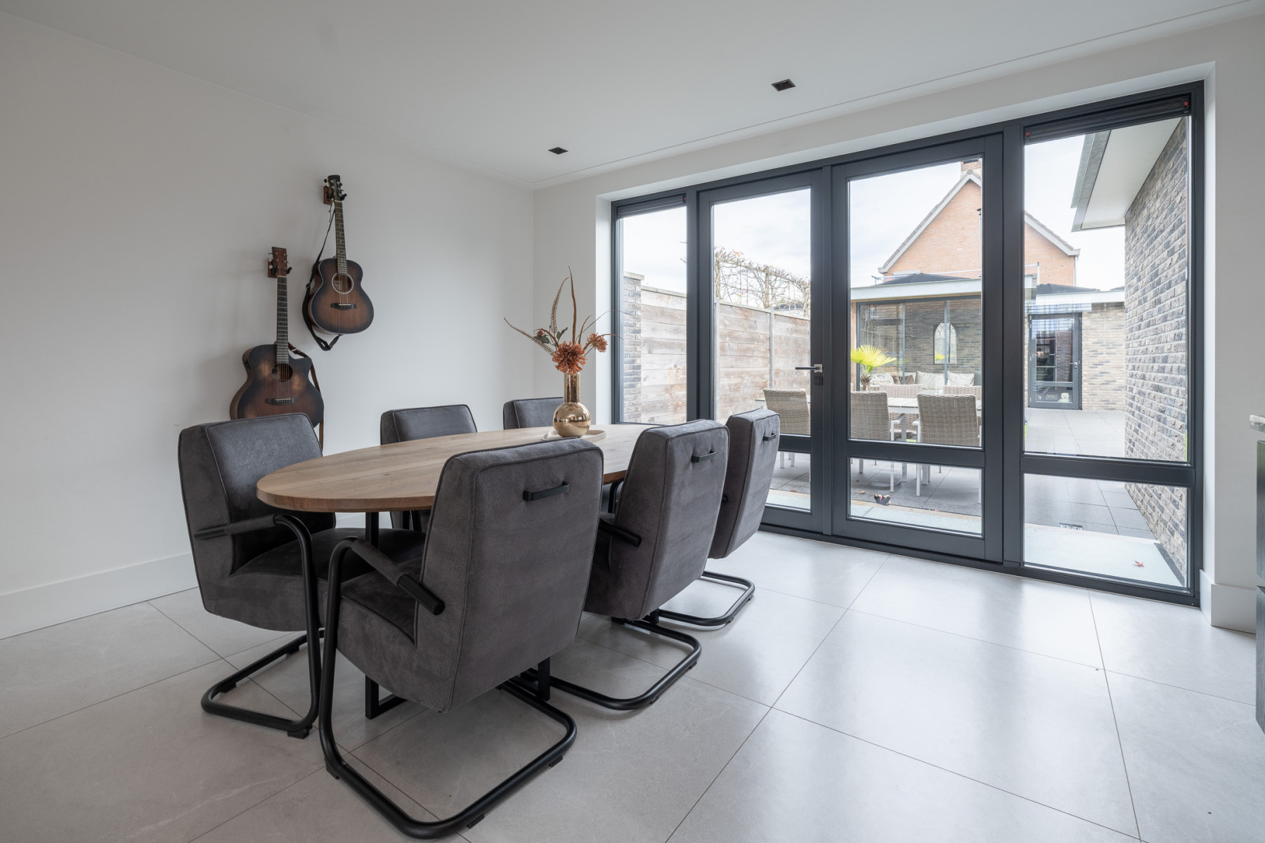 Aan de achterzijde is de eethoek te vinden. Een fijne plek, nabij de keuken, voor een diner met het gezin, familie of vrienden. Het grote raampartij met openslaande deuren geeft een leuk uitzicht op de tuin en in de zomermaanden zijn de deuren fijn te openen zodat u de buitenlucht naar binnen halt.