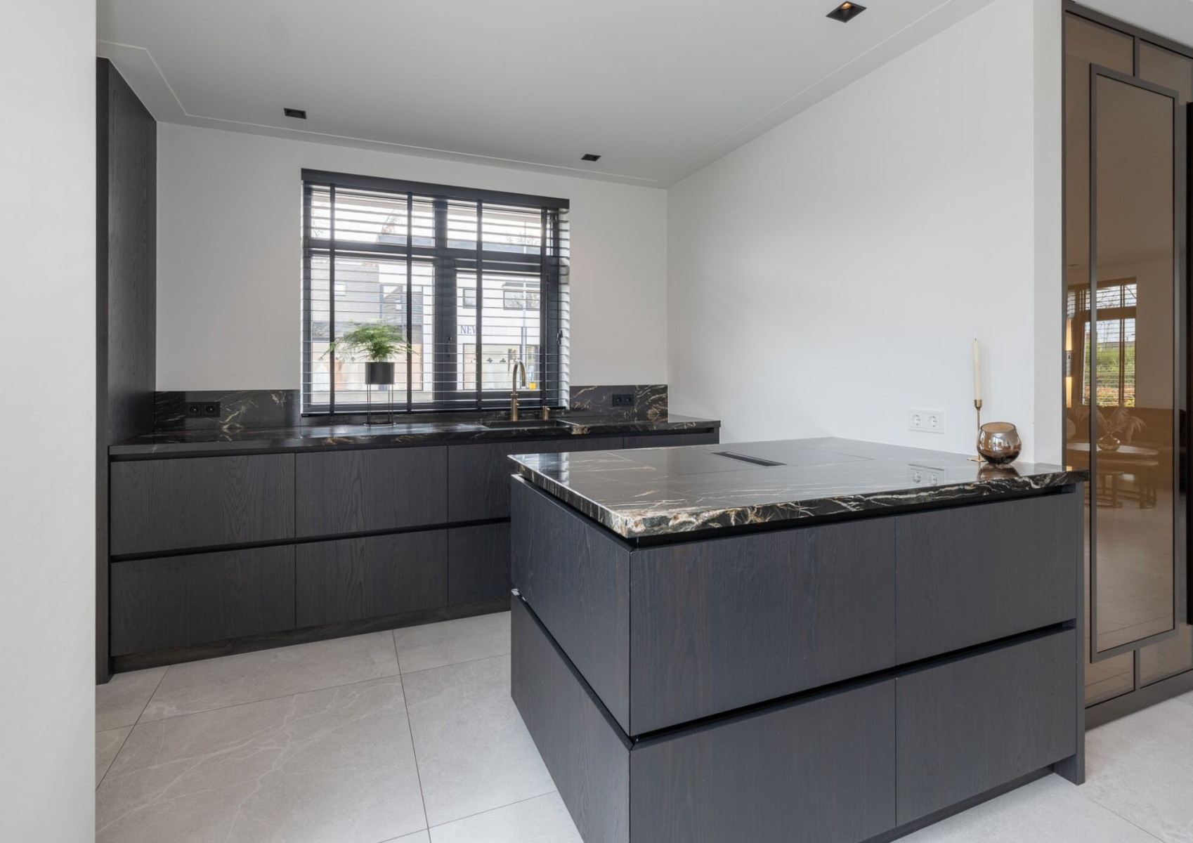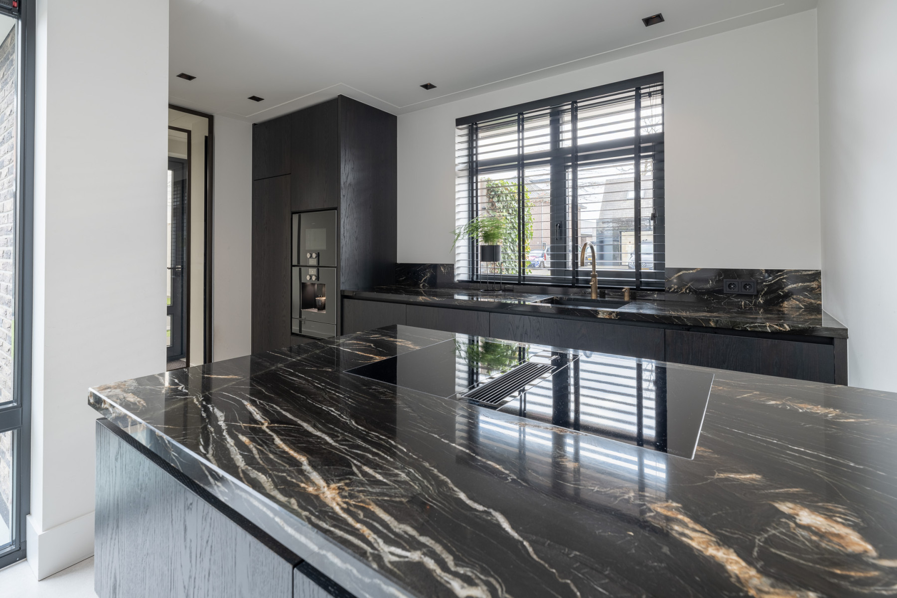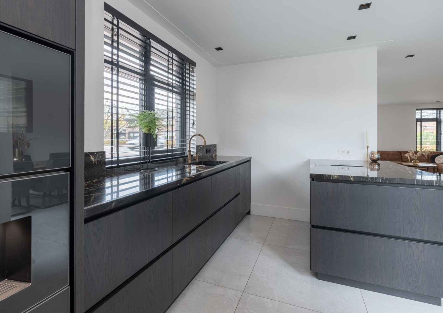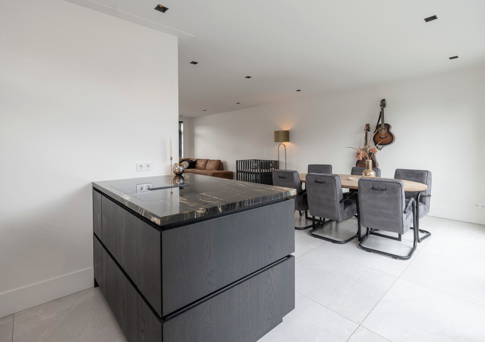 Een keuken waar design en gebruiksgemak heel goed samen komen. Het donkere hout combineert prachtig met het kwartsiet aanrechtblad. Dit zorgt voor een chique uitstraling. Het kookeiland biedt u een 4-pits Bora inductiekookplaat met geïntegreerde afzuiging en veel kastruimte. Zo blijft het aanrecht altijd netjes.