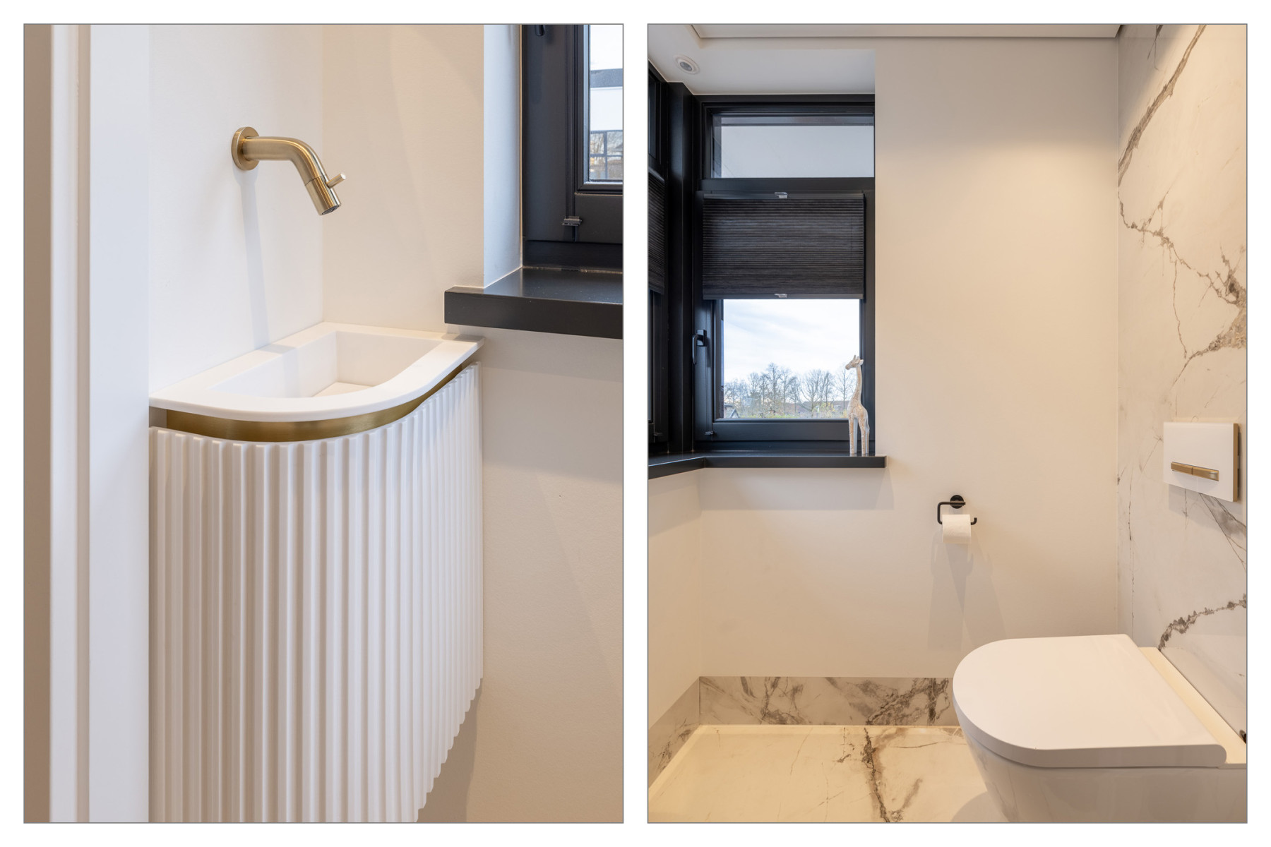 In de hal treft u een toiletruimte met marmerenlook tegels en gouden details die deze ruimte een luxe tint geven. Het fonteintje is een echte blikvanger. Verder bevindt zich in de hal de meterkast en de trapopgang naar de eerste verdieping.