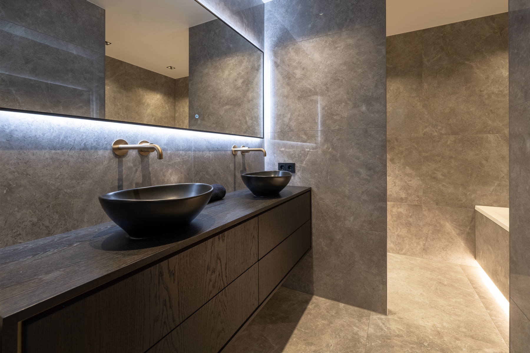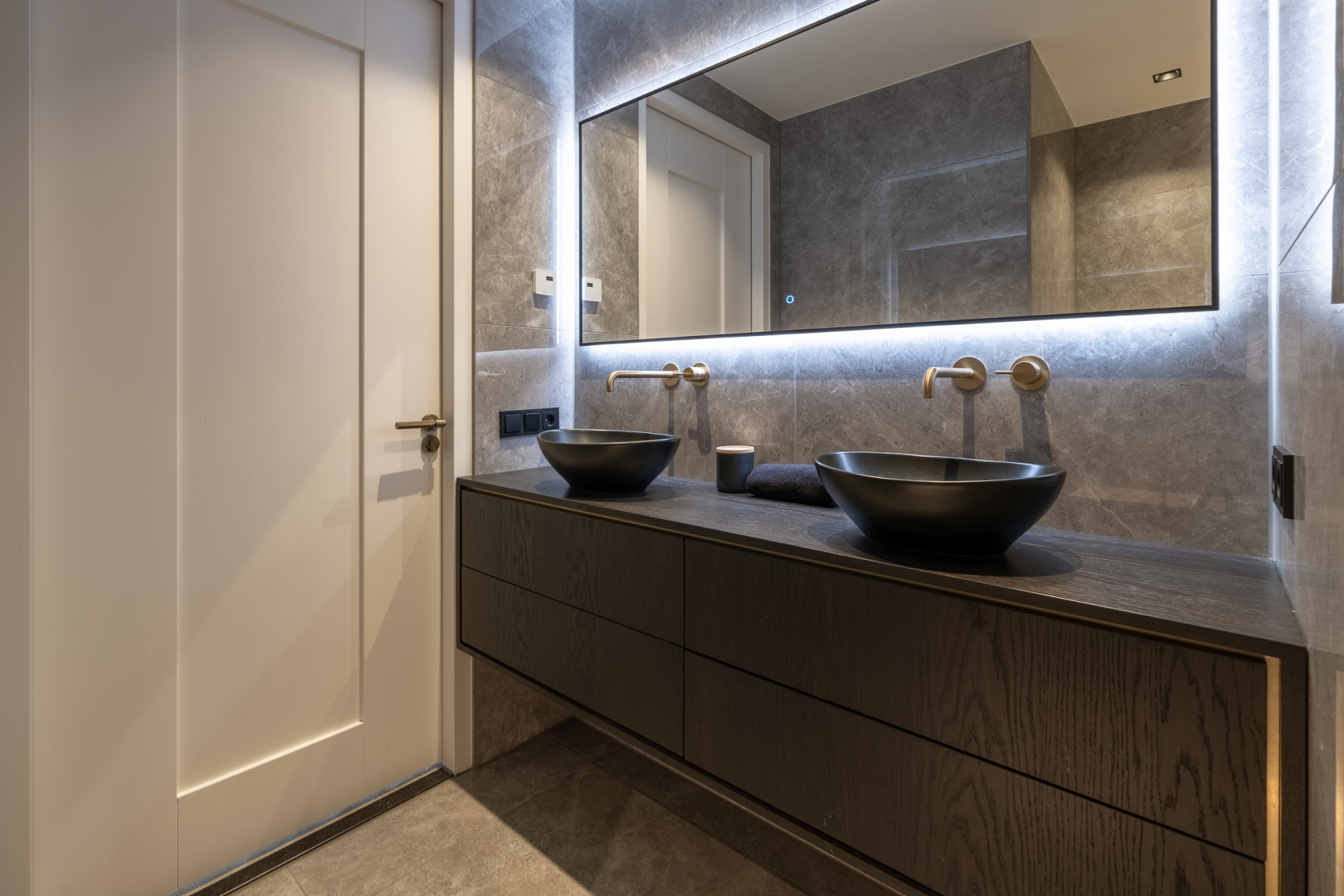 De grote wand- en vloertegels zorgen voor een rustige basis. Door de diverse verlichting krijgt de ruimte een warme en moderne sfeer. Alles klopt hier qua stijl en afwerking. In de ruimte profiteert u van een wastafelmeubel met twee matzwarte waskommen. De goudkleurige kranen zorgen voor een luxe uitstraling.
