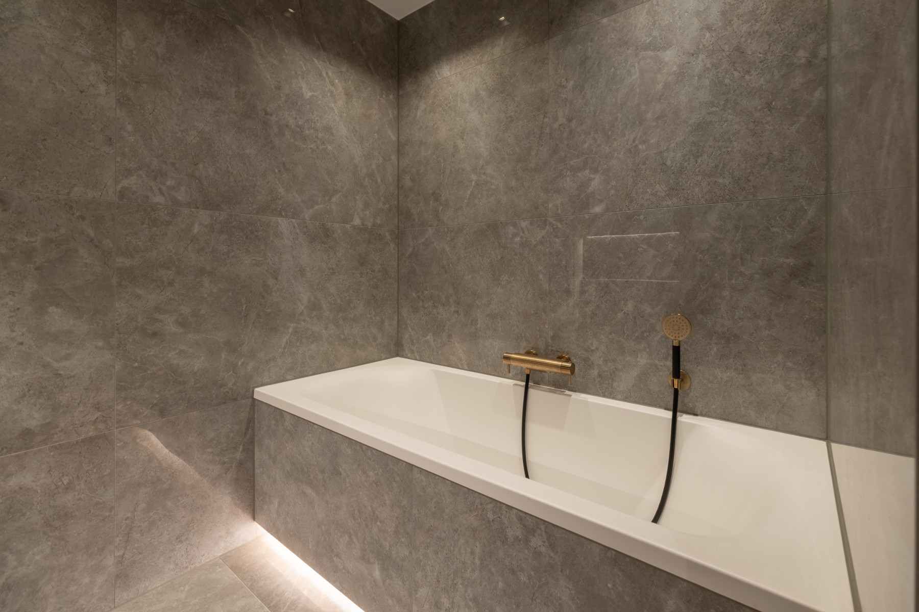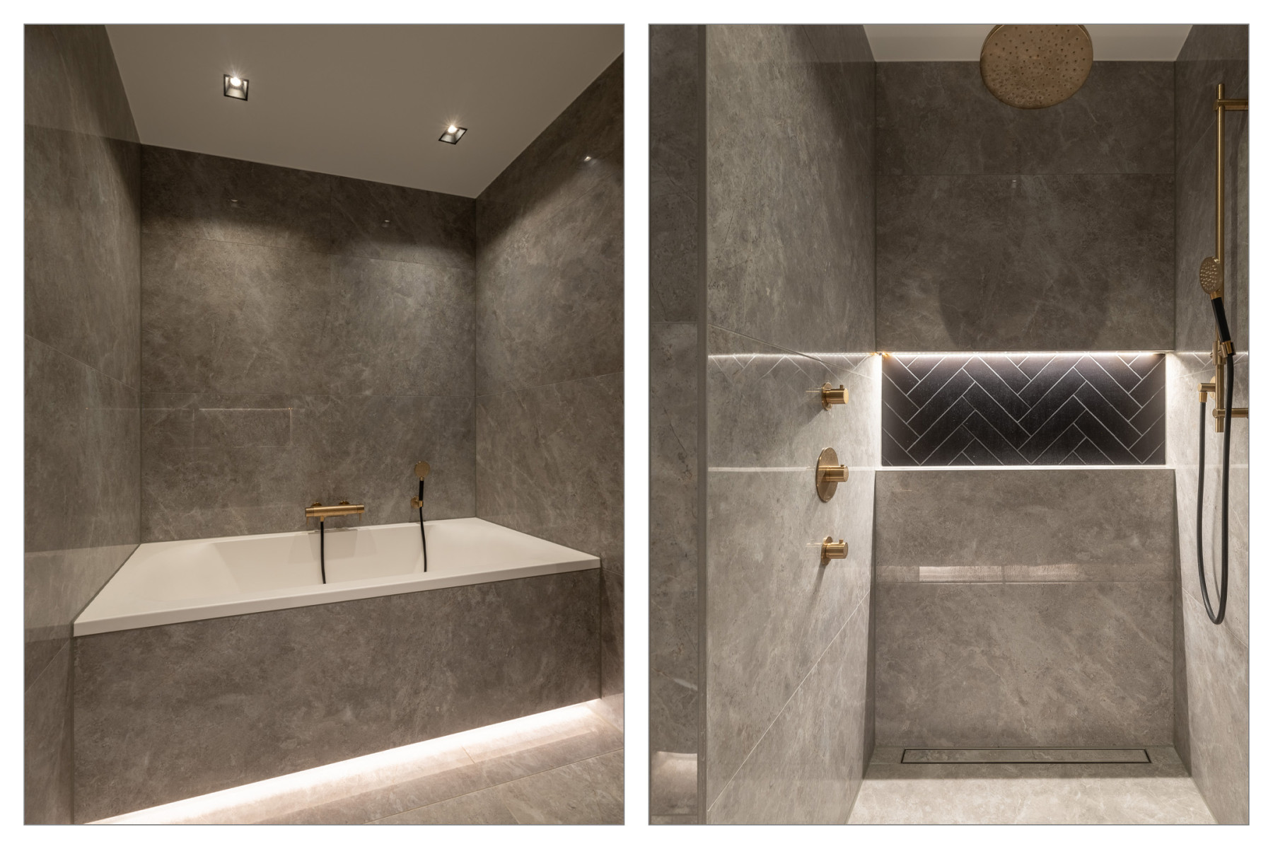 Verder bevindt zich in de ruimte spiegel met verlichting en verwarming en een ligbad, mooi ingebouwd en voorzien van een goudkleurige kraan en een handdouche. Een extra sfeervol detail: er zit verlichting onder het bad. De royale inloopdouche is in dezelfde stijl afgewerkt, een goudkleurige regendouche en een nisje met bruine visgraattegels. Stijlvol en praktisch.