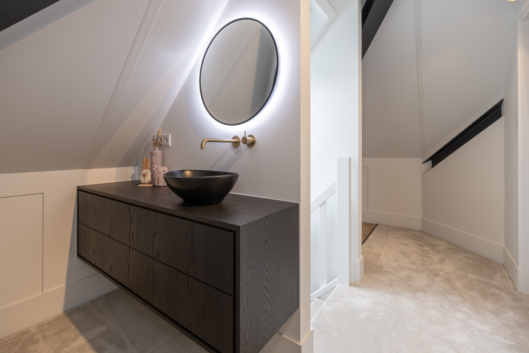 Op de overloop is een luxe wastafelmeubel met waskom en goudkleurige kranen geplaatst met een moderne, ronde spiegel met verlichting. Handig voor de ochtendroutine. Verder bevindt zich op de overloop de aansluiting voor de witgoedapparatuur.