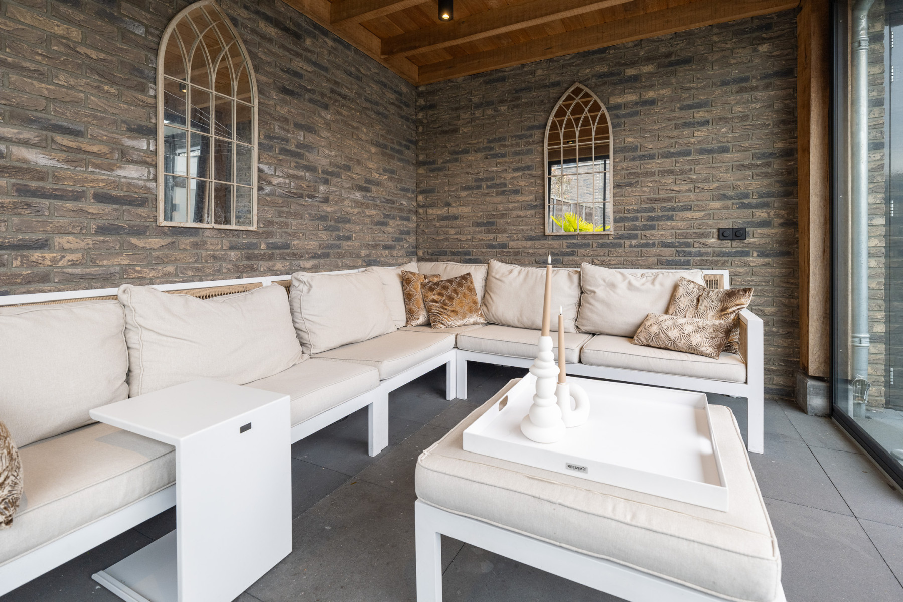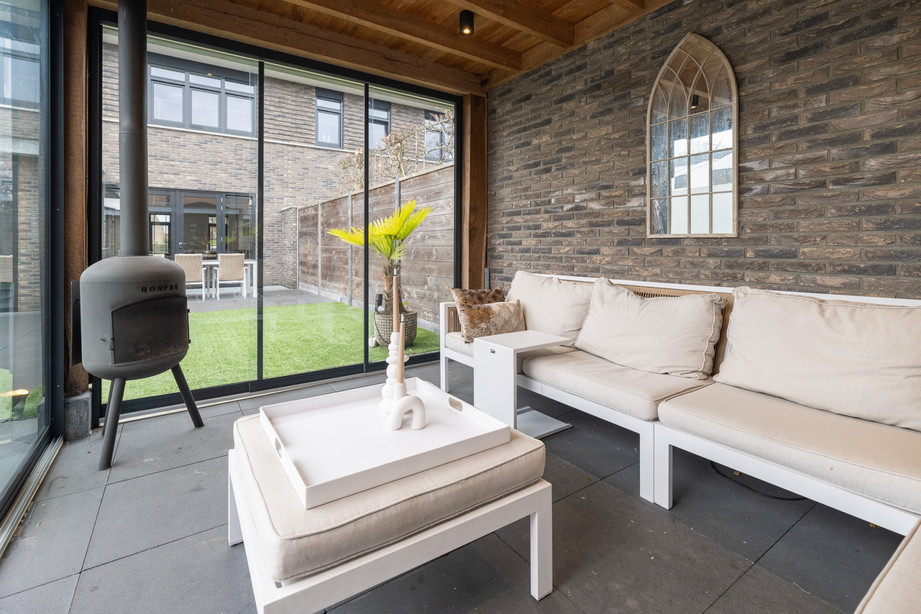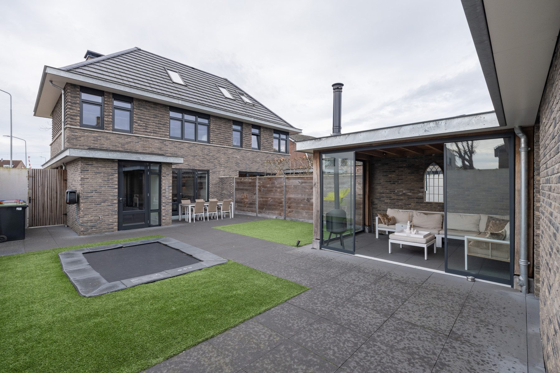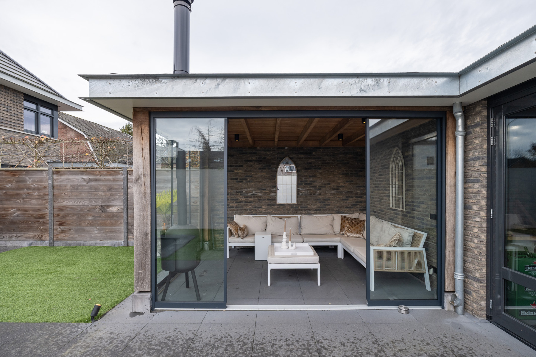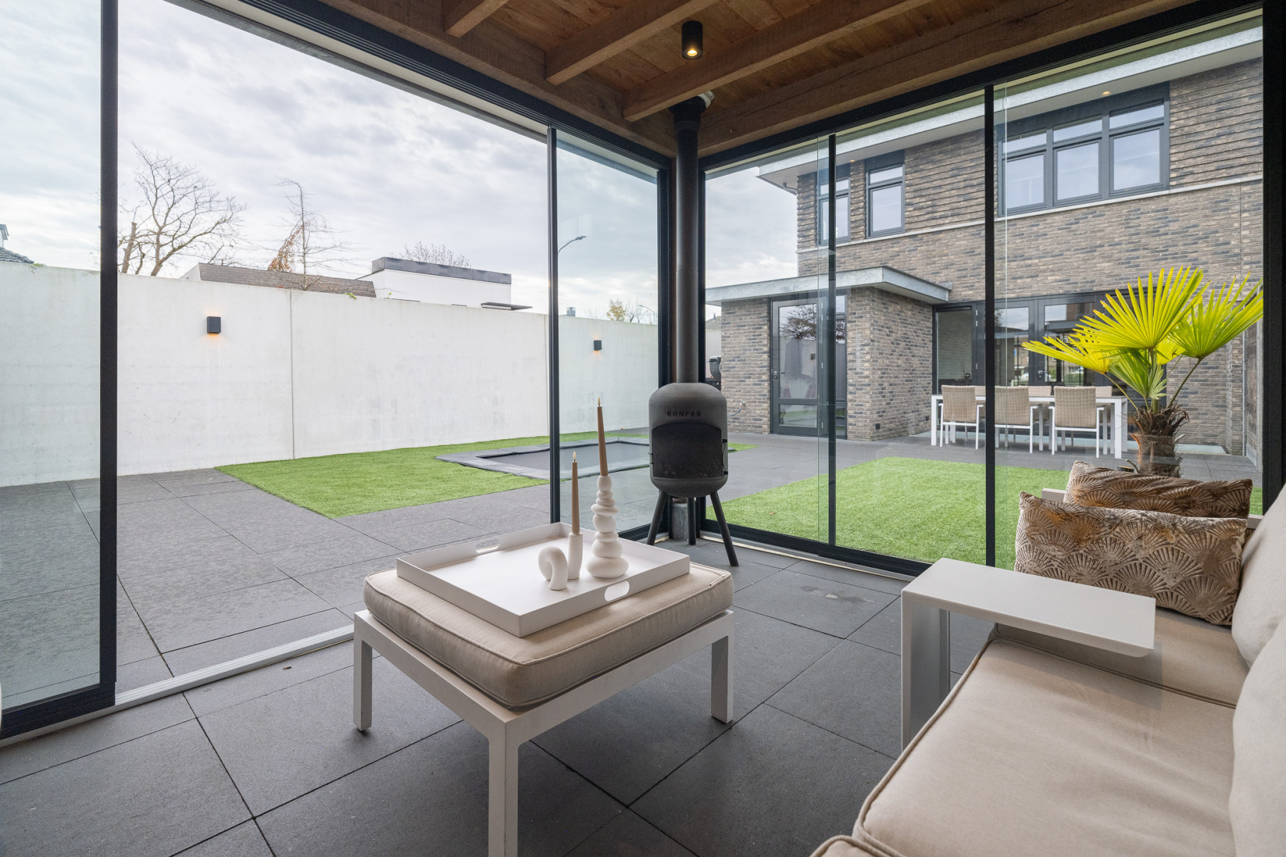 Na al het pracht binnenshuis laten we u ook graag de tuin van de woning zien! Een buitenruimte die aangelegd is met grote, strakke terrastegels en kunstgras. Direct achter de woning heeft u plek voor een royale zithoek. Achter in de tuin is de veranda met glazen schuifwanden en een houtkachel. Die combinatie maakt het een verlengstuk van het leefgedeelte. Hier zit u beschut en warm met een leuk uitzicht op de tuin.
